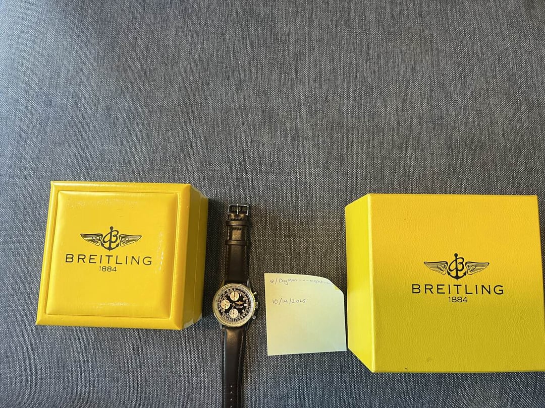 Up for grabs today is this very cool **Breitling Navitimer with 18K Gold Bezel** (ref. B13019). The iconic Navitimer is one of my favorite watches, they look great and have a fun history behind them. This is a 41mm model from the 1990s, and comes in mint condition. The tritium indices on the original dial really pop against the black dial of the watch. At 41mm, the watch is a nice size that can be dressed both up and down. The watch was serviced approx. 6 months ago, and as such, is running great. Comes on a generic leather strap, with the original Breitling tang. Comes with box only. **Price: $2,780.** I have been a trusted seller on Reddit since 2018 and can provide references from 600+ prior watch transactions. If you have any questions or would like to see a video, just let me know. Thanks!
