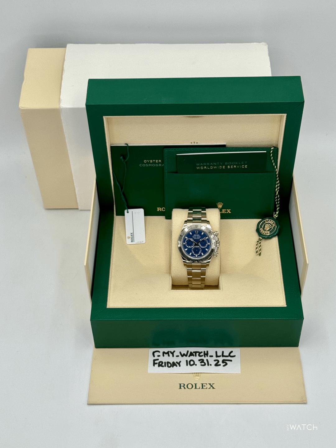 🔵**2022 Rolex Cosmograph Daytona 40mm 116509 18kt White Gold Blue Dial Oyster Bracelet** 🔵**TRADE or SELL us your luxury watch, all brands considered. Message me details.** **Includes the following:** **✔️Original Rolex Double boxed** **✔️Box and Papers - Yes** **✔️Warranty card dated November 2022** **✔️5 year manufacturer warranty** **✔️Manual and Warranty booklets** **✔️Green and White Hang Tags included** **✔️Size: 8.0inch wrist (Full Links)** **✔️Watch is in excellent overall condition. Please see photos for details.** **✔️**[**Trades**](https://mywatchllc.com/pages/sell-rolex-watch) **welcome** Business Name: **My Watch LLC** LOCATION: Oak Park, Michigan ✔️[MyWatchLLC.com](http://mywatchllc.com/) for current inventory ✔️Google Business Listing [https://g.co/kgs/Cmd6FPW](https://g.co/kgs/Cmd6FPW) ✔️Business Hours M-F 9-6 ✔️Facetime/Video chat/calls welcome to view the watch interested. ✔️Contact: 248-422-0909 via text or call for quickest response. 🟢TERMS: Visit [MyWatchLLC.Com](http://mywatchllc.com/) for payments accepted 🟢REFERENCES/REVIEWS: We are well reviewed on all platforms from google, trust pilot, rolexforums, additionally we have 300+ reference in multiple FaceBook watch groups, reference checks welcome. 🟢SHIPPING: If you are not local, we offer Fully Insured FedEx overnight shipping in the USA for a fee. International shipping available.