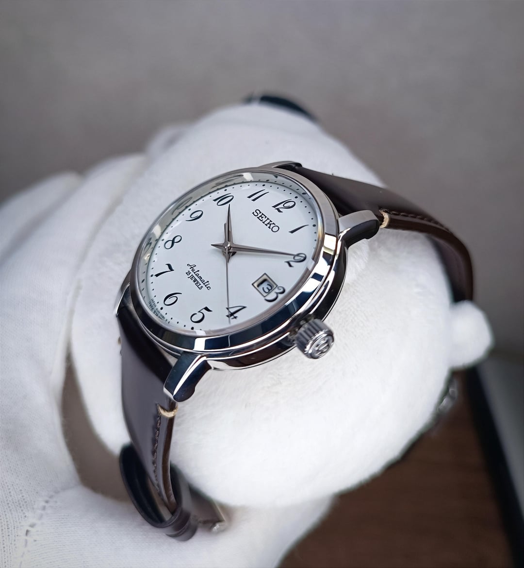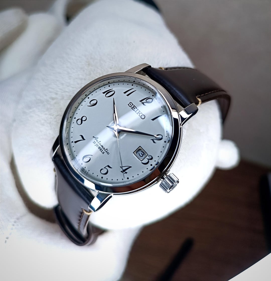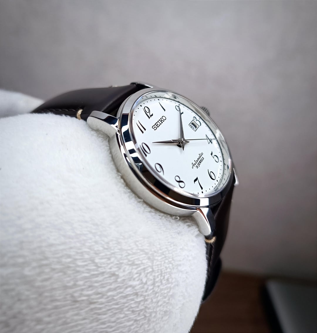 Hello r/WatchExchange, I’m offering for sale a Seiko SARA007 with a stunning white enamel dial – an extremely rare and refined model from Seiko’s high-end domestic collection, powered by the 4L25 high-beat automatic movement, well-known for its precision. The watch is pre-owned and comes with a Seiko brown leather strap and the original Seiko deployant clasp. 🔧 Specifications: Movement: Seiko 4L25 – automatic, high-beat, highly accurate. Case: Stainless steel, tonneau-shaped (slightly rounded rectangular design). Case size: 38mm diameter, 10.8mm thickness. Dial: White enamel with sharp Arabic numerals, capped pinion, and excellent finishing quality. Crystal: Sapphire, in excellent condition. Strap: Seiko brown leather strap( new). Water resistance: 100m ⚙️ Features: Magnetic resistance Date display Exceptional timekeeping and stability even under magnetic influence. 📦 What’s Included: Watch + box 📸 Images / Timestamp: Included in the post! 💰 Pricing & Payment: Price: $1350USD (shipping not included, no trades). Payment: PayPal Friends & Family or Goods & Services (+4.6% buyer’s fee). Shipping: Worldwide via FedEx Express (3–5 business days). Shipping cost: $50–$80 depending on destination. Thanks for your interest.