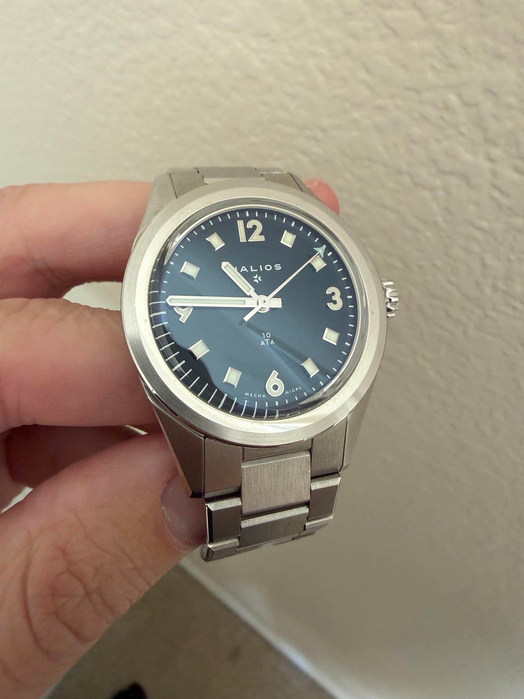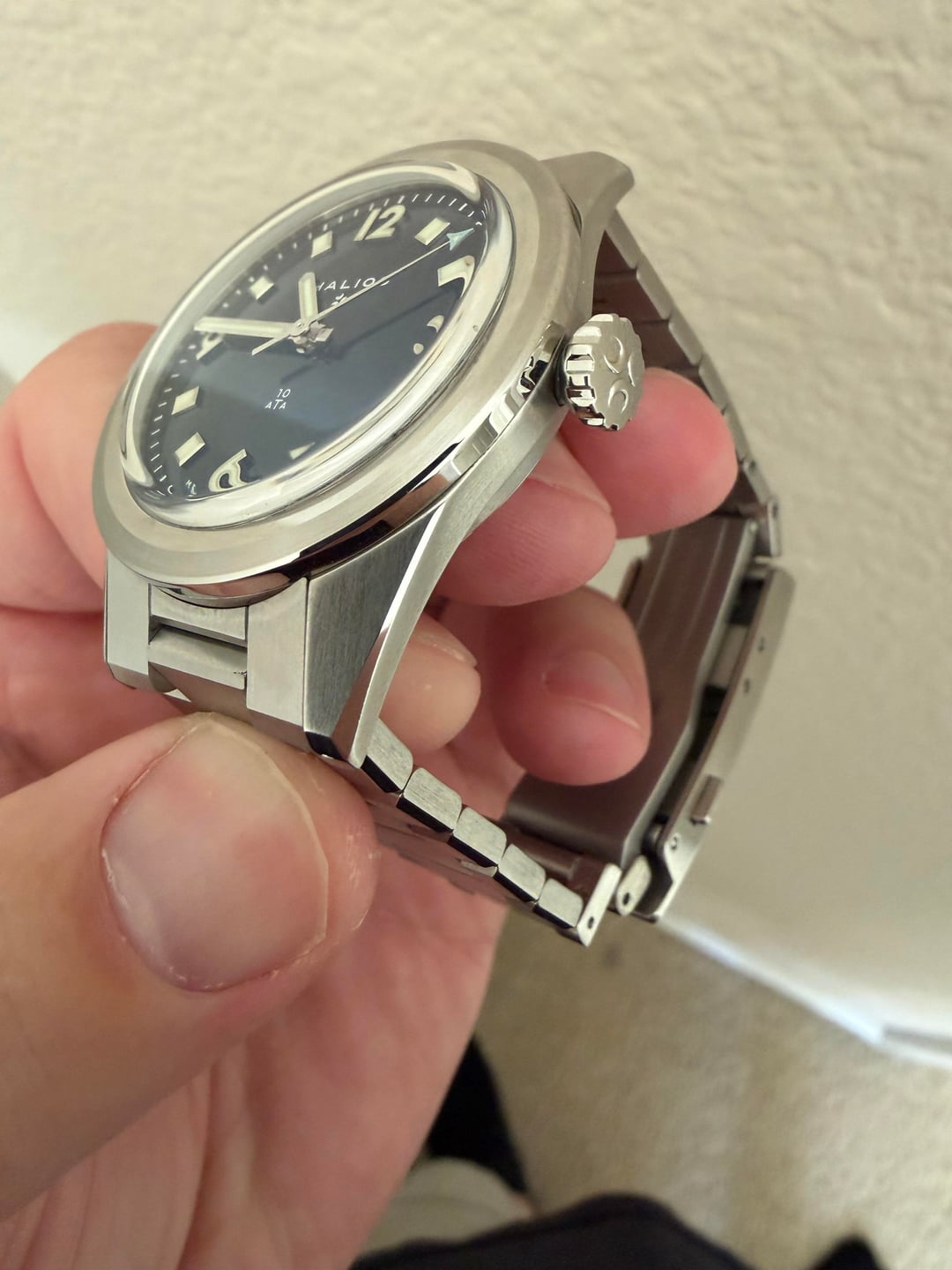 Hi All, for sale is my Halios Universa. I am the original owner. Watch condition 9-9.5/10 with some hairline desk diver scratches. No marks on the case or crystal from what I can see. Watch is manual wound with a SW210 movement and 100m of water resistance (consequently the crown is a bit harder to wind than most because there is an extra rubber gasket). The bracelet has a quick adjust by pressing on the Halios logo. Comes with original leather zip pouch and the original extra links. Asked $850 shipped Conus. Any questions please don’t hesitate to reach out. Thanks for looking!
