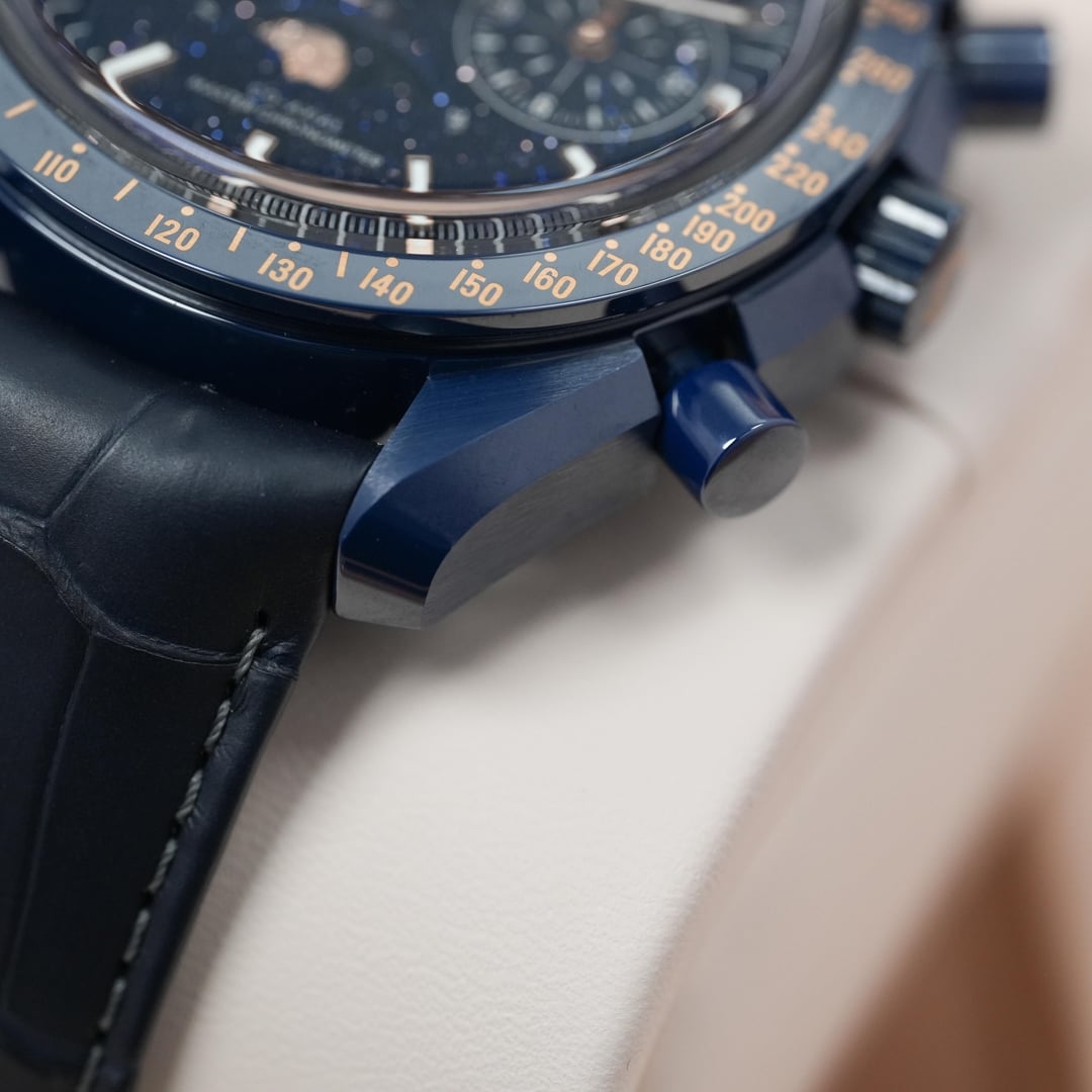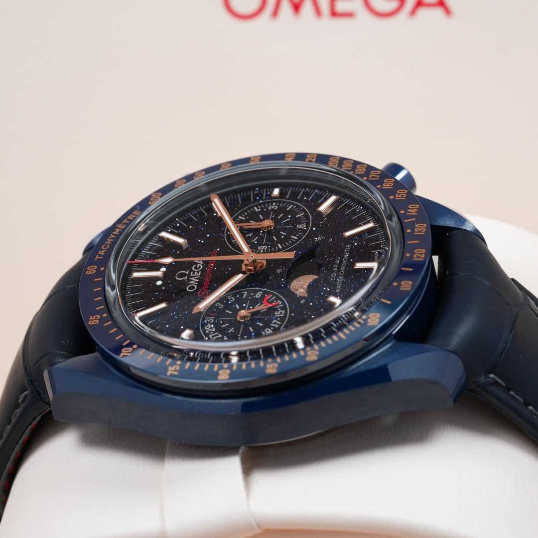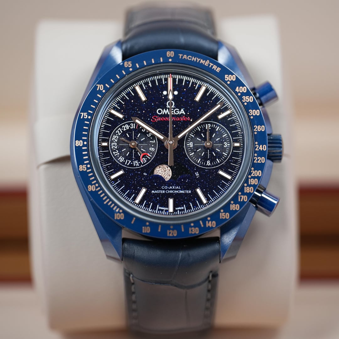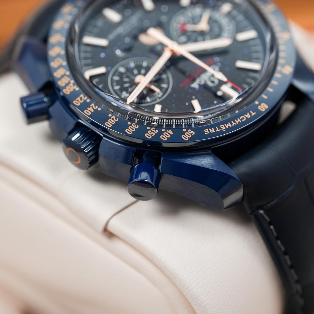 Absolutely immaculate BSOM with aventurine dial and Sedna gold. Warranty card is dated 7/2023. The Omega Speedmaster Moonphase “Blue Side of the Moon” is the kind of release that proves Omega isn’t interested in preserving legacy—they’re intent on advancing it. Crafted from a single block of deep blue zirconium oxide ceramic, the 44.25mm case has a richness and depth that isn’t painted or coated—it’s inherent. Light on the wrist, highly scratch-resistant, and unmistakably modern, it immediately separates itself from traditional steel Moonwatches. The aventurine-glass dial is where this Speedmaster becomes emotional. It’s a star-filled night sky in miniature, with flecks that catch light like constellations. At 6 o’clock, the photo-real moonphase isn’t a gimmick—it’s a poetic acknowledgement of the Speedmaster’s lunar heritage, executed with a level of detail that stops people mid-sentence. Paired with the clean dual-register chronograph layout and a Ceragold tachymeter bezel, the watch blends technical design with visual drama effortlessly. Power comes from the Co-Axial Master Chronometer Calibre 9904, Omega’s modern flex: METAS-certified accuracy, anti-magnetic to 15,000 gauss, column-wheel and vertical-clutch chronograph, and a 60-hour reserve. It’s a movement built not just to impress on paper, but to stay precise in real life. This is the Moonwatch for someone who wants the history, but refuses to settle for nostalgia alone. It’s elevated, innovative, romantic, and technically assertive—the Speedmaster that proves evolution can be just as iconic as origin. Please view pictures carefully as I use a very strong macro lens to showcase any and all imperfections. Typically, this will embellish the imperfections and/or lead to the inevitable specks of dust. I am always happy to provide more pictures at different angles, whatever you're unsure of. I am a full time firefighter and am very involved in my community - my reputation is everything to me. Please feel free to reach out with any questions and I will answer promptly to make sure you are taken care of and we can have a smooth easy transaction. 10,800 with fully insured shipping included. No trades here please