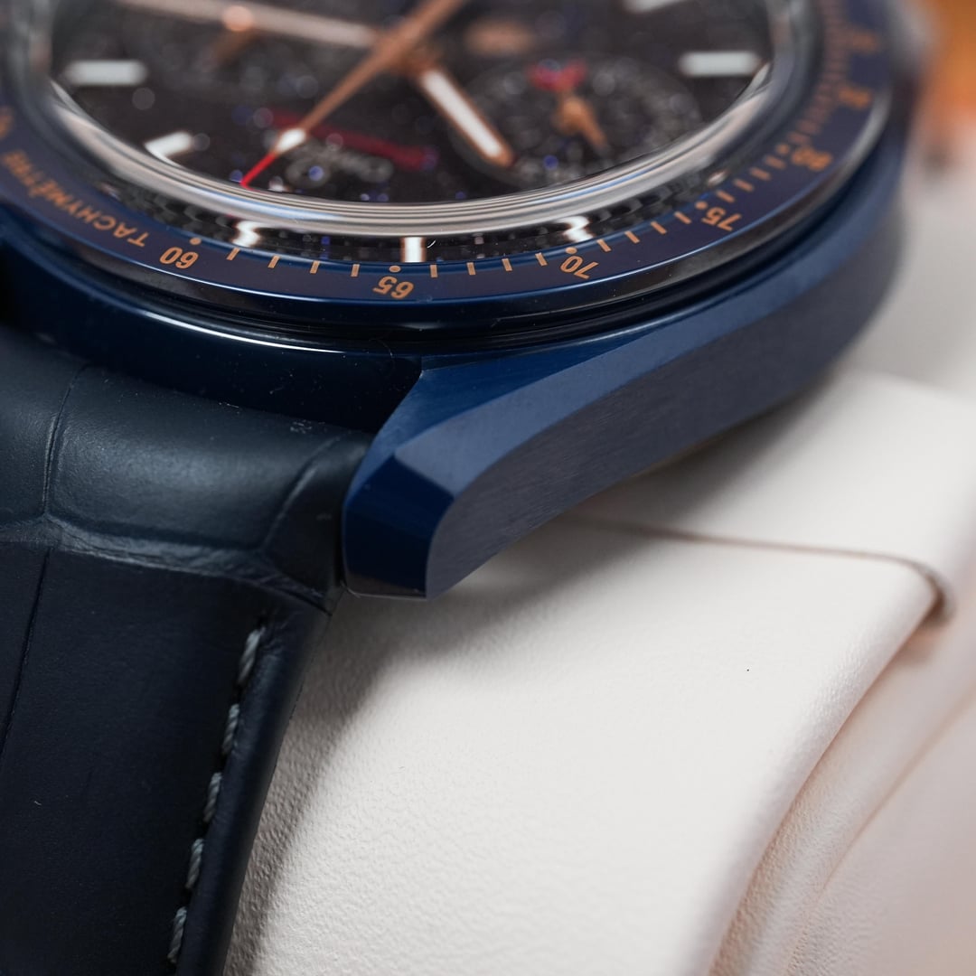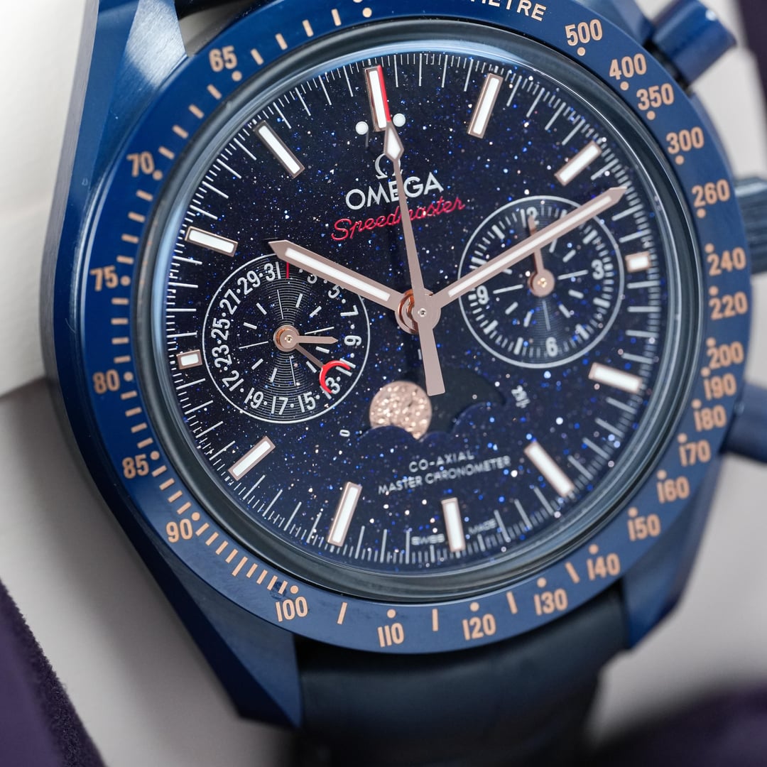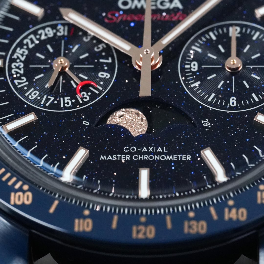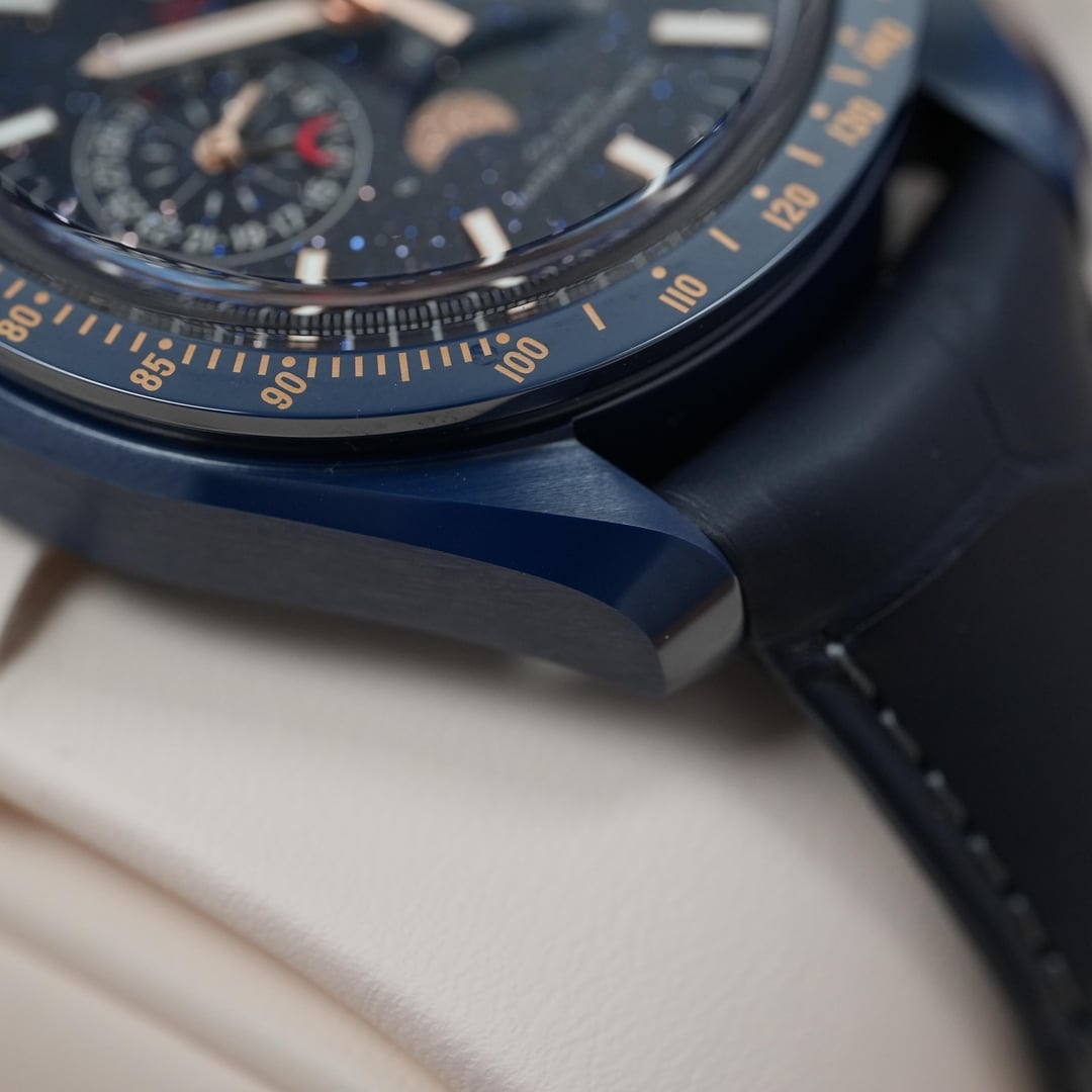 Absolutely immaculate BSOM with aventurine dial and Sedna gold. Warranty card is dated 7/2023. The Omega Speedmaster Moonphase “Blue Side of the Moon” is the kind of release that proves Omega isn’t interested in preserving legacy—they’re intent on advancing it. Crafted from a single block of deep blue zirconium oxide ceramic, the 44.25mm case has a richness and depth that isn’t painted or coated—it’s inherent. Light on the wrist, highly scratch-resistant, and unmistakably modern, it immediately separates itself from traditional steel Moonwatches. The aventurine-glass dial is where this Speedmaster becomes emotional. It’s a star-filled night sky in miniature, with flecks that catch light like constellations. At 6 o’clock, the photo-real moonphase isn’t a gimmick—it’s a poetic acknowledgement of the Speedmaster’s lunar heritage, executed with a level of detail that stops people mid-sentence. Paired with the clean dual-register chronograph layout and a Ceragold tachymeter bezel, the watch blends technical design with visual drama effortlessly. Power comes from the Co-Axial Master Chronometer Calibre 9904, Omega’s modern flex: METAS-certified accuracy, anti-magnetic to 15,000 gauss, column-wheel and vertical-clutch chronograph, and a 60-hour reserve. It’s a movement built not just to impress on paper, but to stay precise in real life. This is the Moonwatch for someone who wants the history, but refuses to settle for nostalgia alone. It’s elevated, innovative, romantic, and technically assertive—the Speedmaster that proves evolution can be just as iconic as origin. Please view pictures carefully as I use a very strong macro lens to showcase any and all imperfections. Typically, this will embellish the imperfections and/or lead to the inevitable specks of dust. I am always happy to provide more pictures at different angles, whatever you're unsure of. I am a full time firefighter and am very involved in my community - my reputation is everything to me. Please feel free to reach out with any questions and I will answer promptly to make sure you are taken care of and we can have a smooth easy transaction. 10,800 with fully insured shipping included. No trades here please