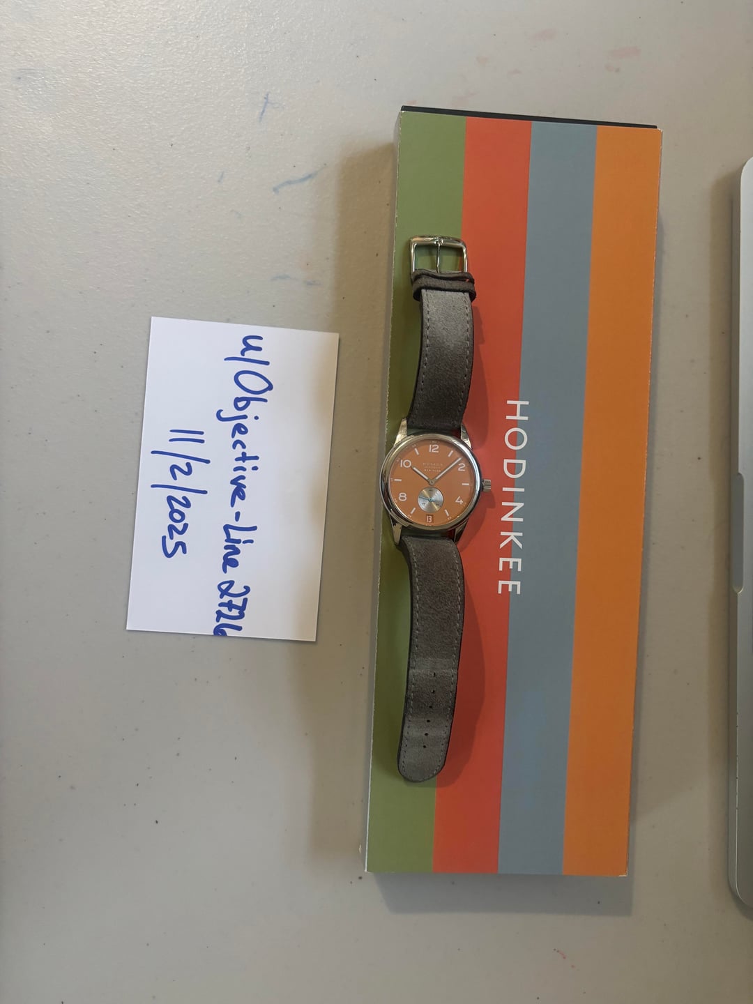 Timestamp & Photos: https://imgur.com/a/EPXJxbf Price: 1,295 OBO, shipped Location: New Jersey Model: NOMOS Glashütte Club Date 38 for Hodinkee Reference: 733.S4 Limited Edition: 1 of 75 (Sienna Yellow dial, total 300 pieces across 4 colours) Year: 2022 Case: Stainless steel – 38.5 mm × 8.45 mm Movement: NOMOS DUW 4101 (in-house manual wind with Swing System, 42 h power reserve) Crystal: Sapphire front and back Water Resistance: 100 m Dial: Sienna Yellow matte finish with matching date window at 6 o’clock Straps: Comes on original grey velour strap Lug Width: 20 mm Condition: Very Good! (8/10). Worn sparingly in rotation, minimal hairlines on case and lugs. Crystal perfect. Keeps excellent time. Includes box, papers, and extra strap with Nomos foldover clasp.