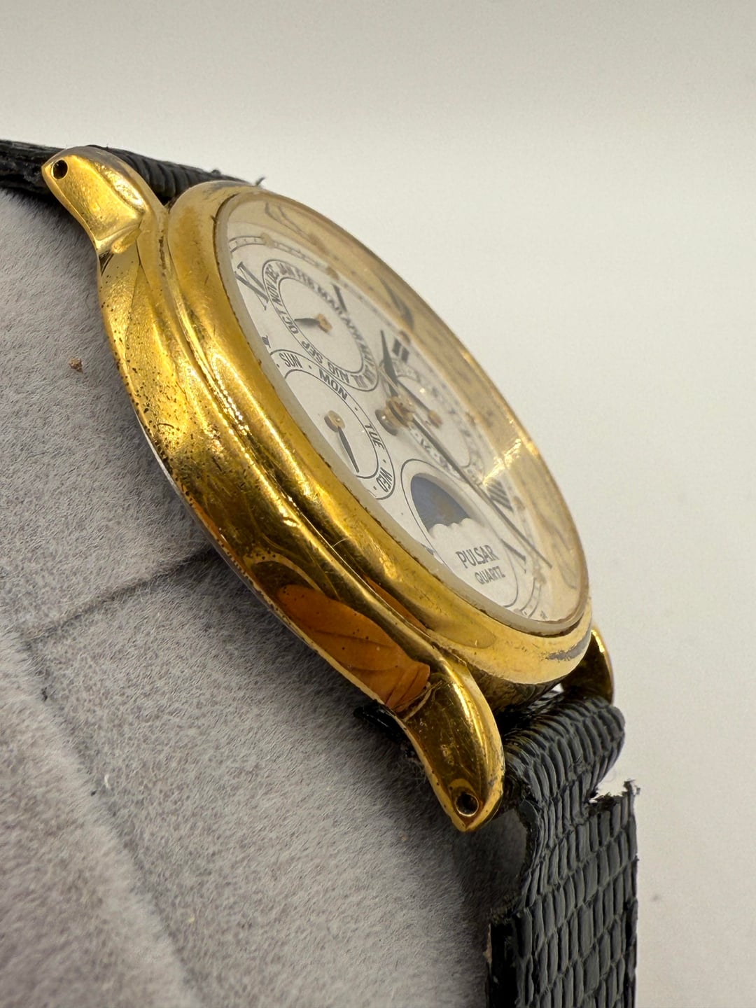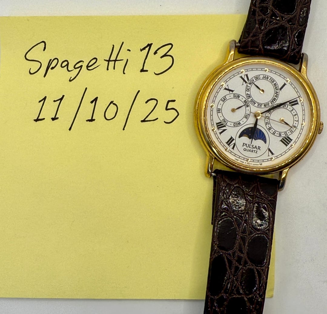 **Asking $115 shipped** Everything sets and works properly on this Quartz beauty produced under Seiko’s Pulsar line. Case measures approx 34mm. **PLEASE NOTE, I swapped the strap to the one in the timestamp because the original lizard strap was damaged and it ripped fully. You will receive the strap in the timestamp photo.**