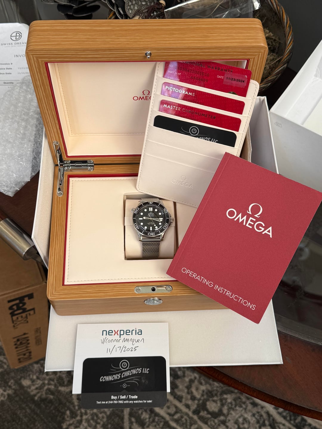 For Sale: Omega Seamaster Diver No Date 300M – 42mm Price is $5,395 shipped to the CONUS or best offer. This is one of the cheapest no dates i’ve seen on the sub! Reference: 210.30.42.20.01.010 Looking for timeless style and precision? Dubbed "The Daniel Craig," this Omega Seamaster Diver 300M blends professional performance with iconic design. Featuring a black ceramic dial, laser-engraved wave pattern, co-axial master chronometer movement, and a stainless steel mesh bracelet, it’s made for both underwater adventure and daily elegance. Key Features: 42mm stainless steel case Black ceramic bezel with white enamel diving scale Transparent caseback with METAS-certified movement Water-resistant to 300M Condition: Amazing preowned condition with little to no wear. Please see photos for accurate representation of wear! Comes with the complete set as shown in timestamp ( all 3 cards, double box, watch, booklet ) Payment preferred is Zelle or Bank Wire, Can also accept Paypal F&F for buyers with strong transaction history on the sub.