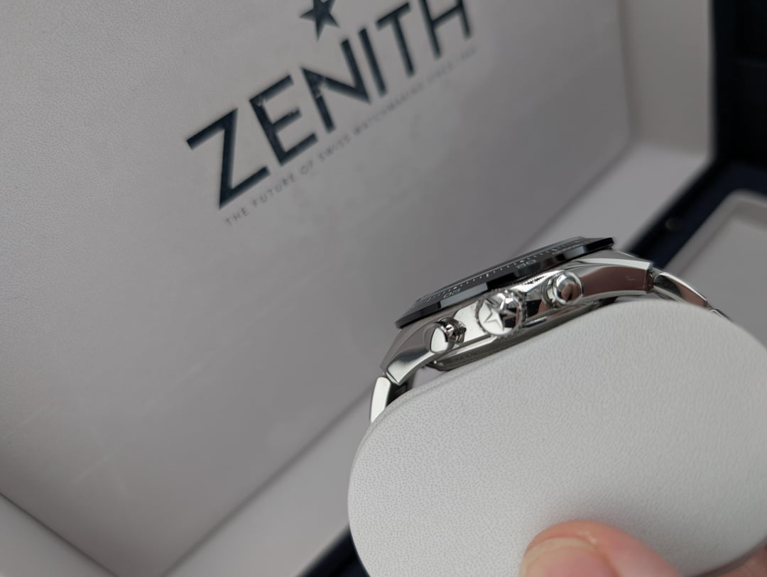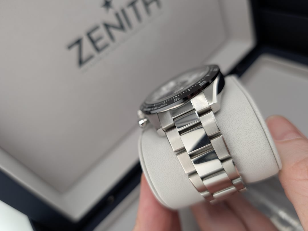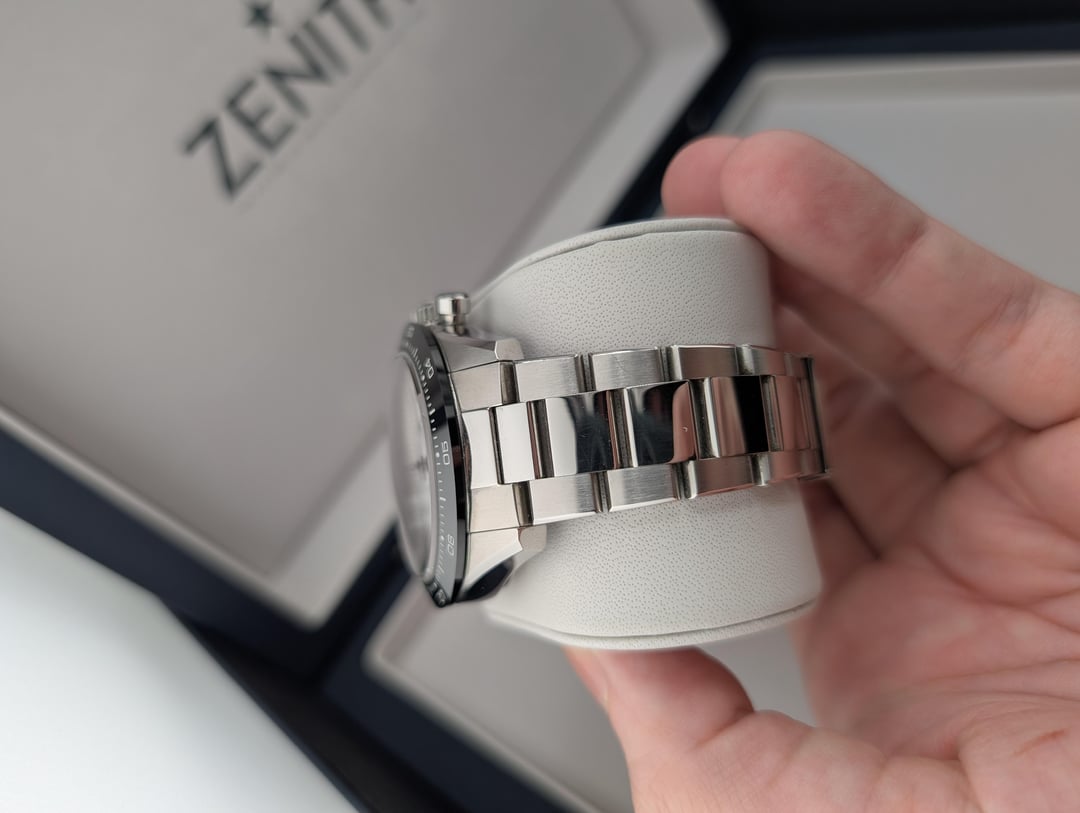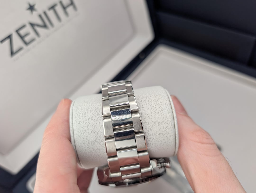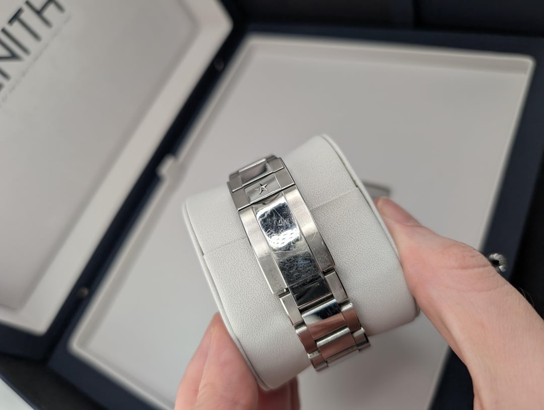 Selling Zenith Chronomaster Sport white dial with full kit: box and papers, active 2023 warranty, all bracelet links. Condition is very good - there are numerous scratches on the polished bits of the bracelet, with lots of scratches on the clasp, as pictured. None of the scratches are particularly deep, and there are no dents or damage. I'm the original owner, selling because I'm downsizing my collection. Asking for $6700 shipped insured, US seller looking for US sales only. Not looking for trades. I accept payment through Paypal/Venmo, F&F only unless you have some transaction feedback. I mostly sell on eBay where I have 100% positive feedback with over 1000 transactions, which I'm happy to prove to anyone worried about buying from me. Timestamp: [https://imgur.com/a/U1op8wM](https://imgur.com/a/U1op8wM)