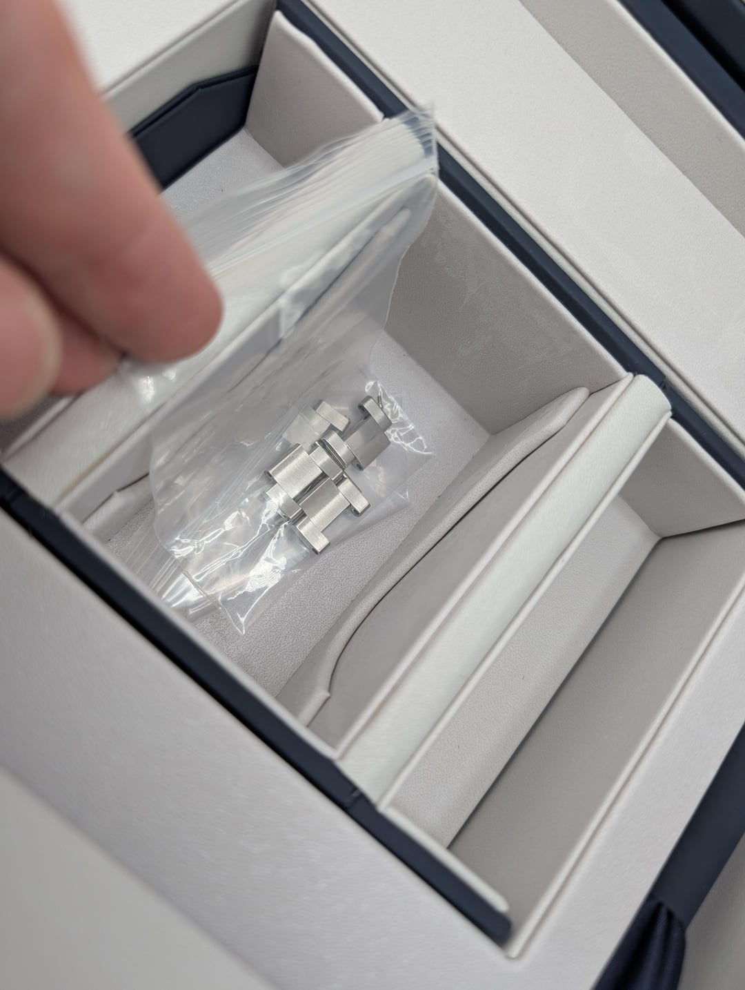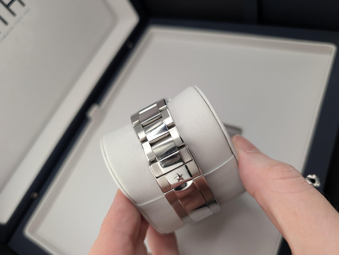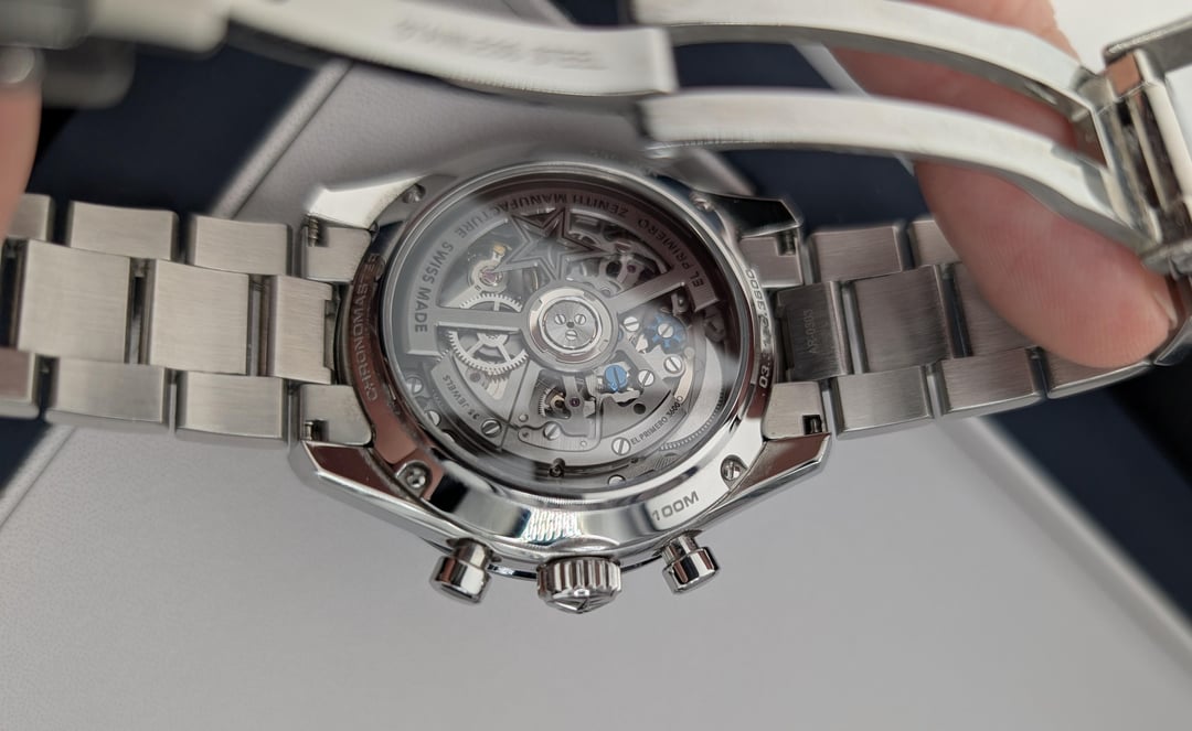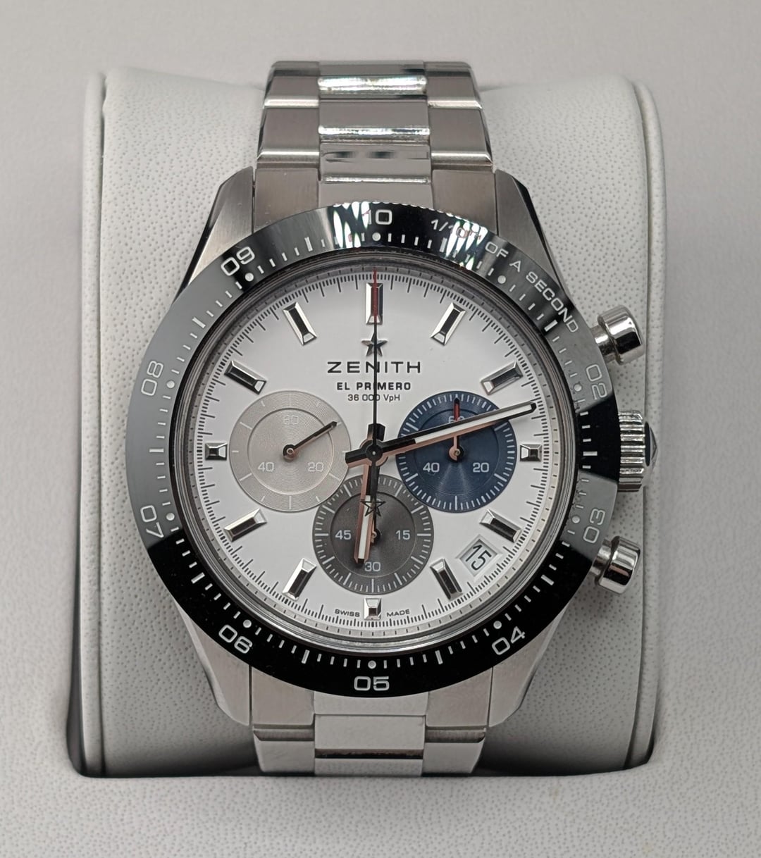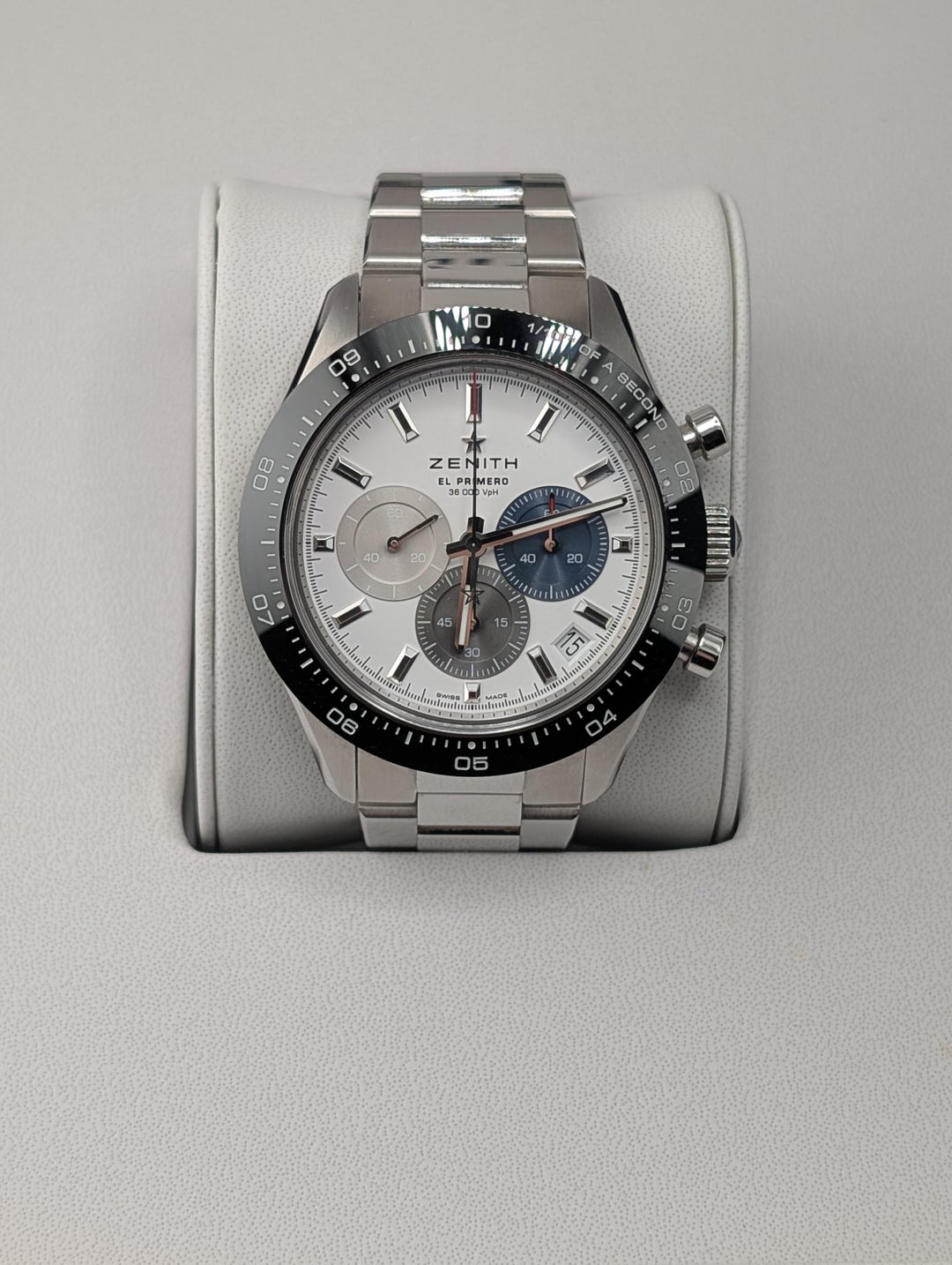 Selling Zenith Chronomaster Sport white dial with full kit: box and papers, active 2023 warranty, all bracelet links. Condition is very good - there are numerous scratches on the polished bits of the bracelet, with lots of scratches on the clasp, as pictured. None of the scratches are particularly deep, and there are no dents or damage. I'm the original owner, selling because I'm downsizing my collection. Asking for $6700 shipped insured, US seller looking for US sales only. Not looking for trades. I accept payment through Paypal/Venmo, F&F only unless you have some transaction feedback. I mostly sell on eBay where I have 100% positive feedback with over 1000 transactions, which I'm happy to prove to anyone worried about buying from me. Timestamp: [https://imgur.com/a/U1op8wM](https://imgur.com/a/U1op8wM)