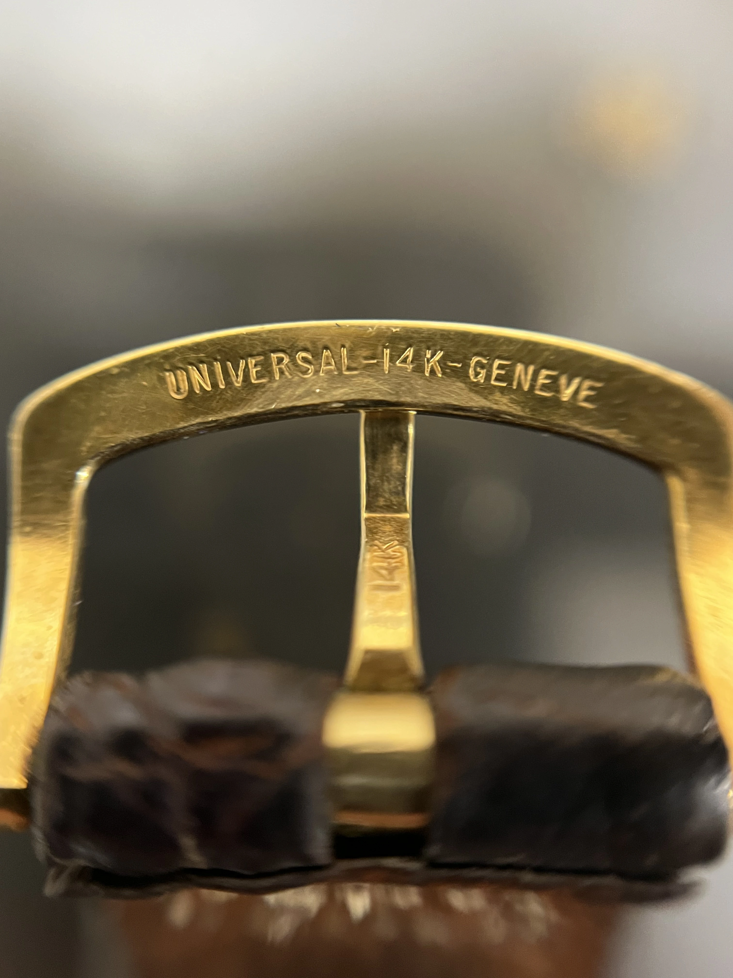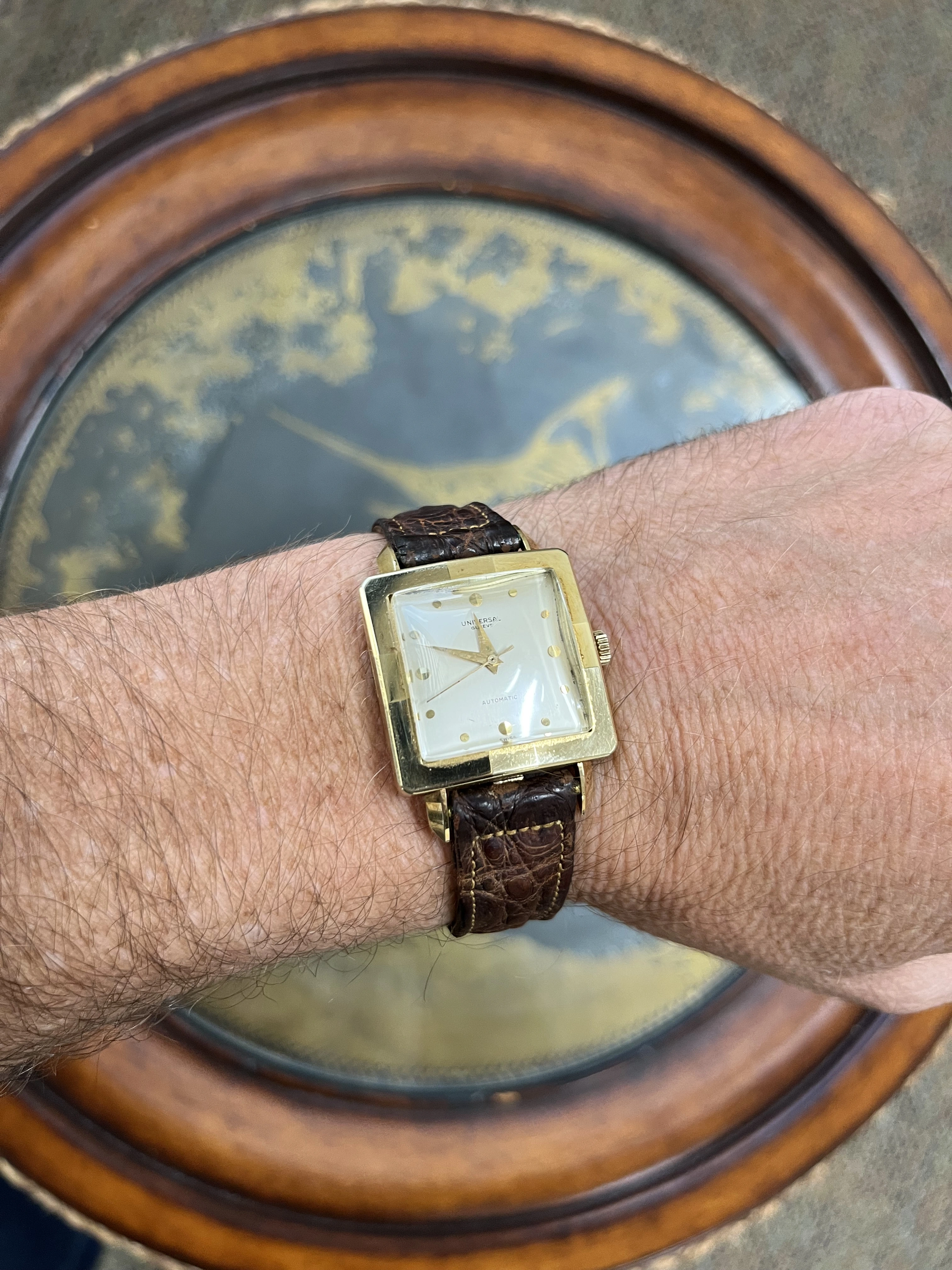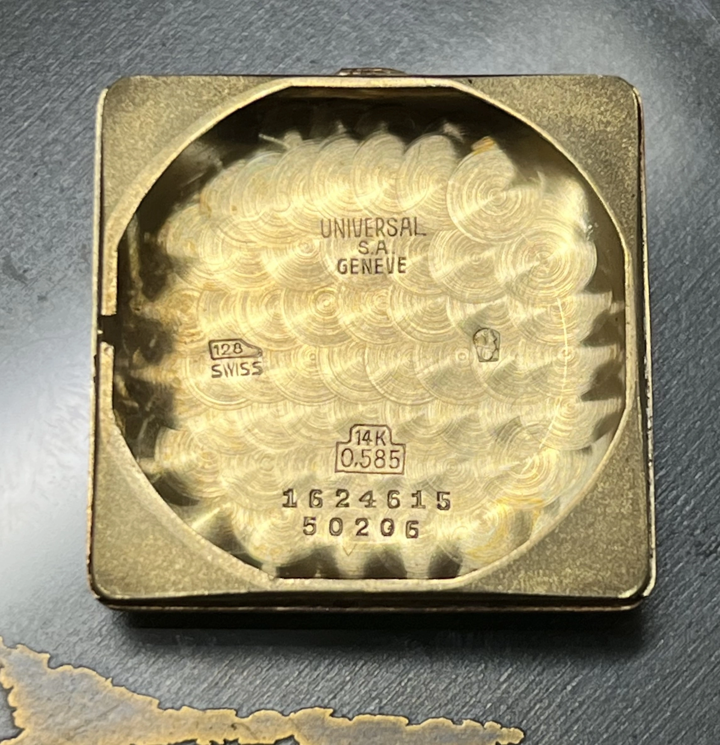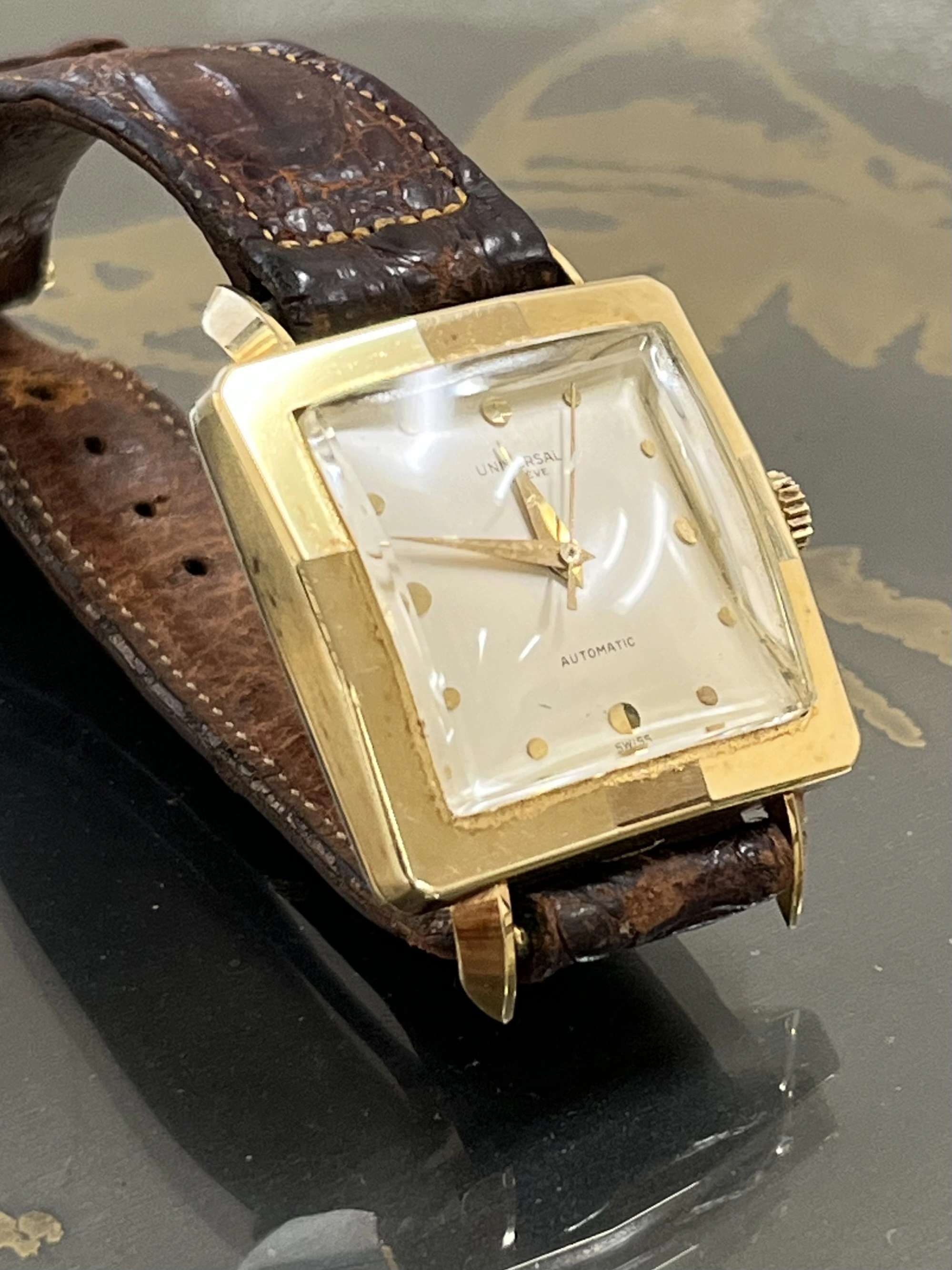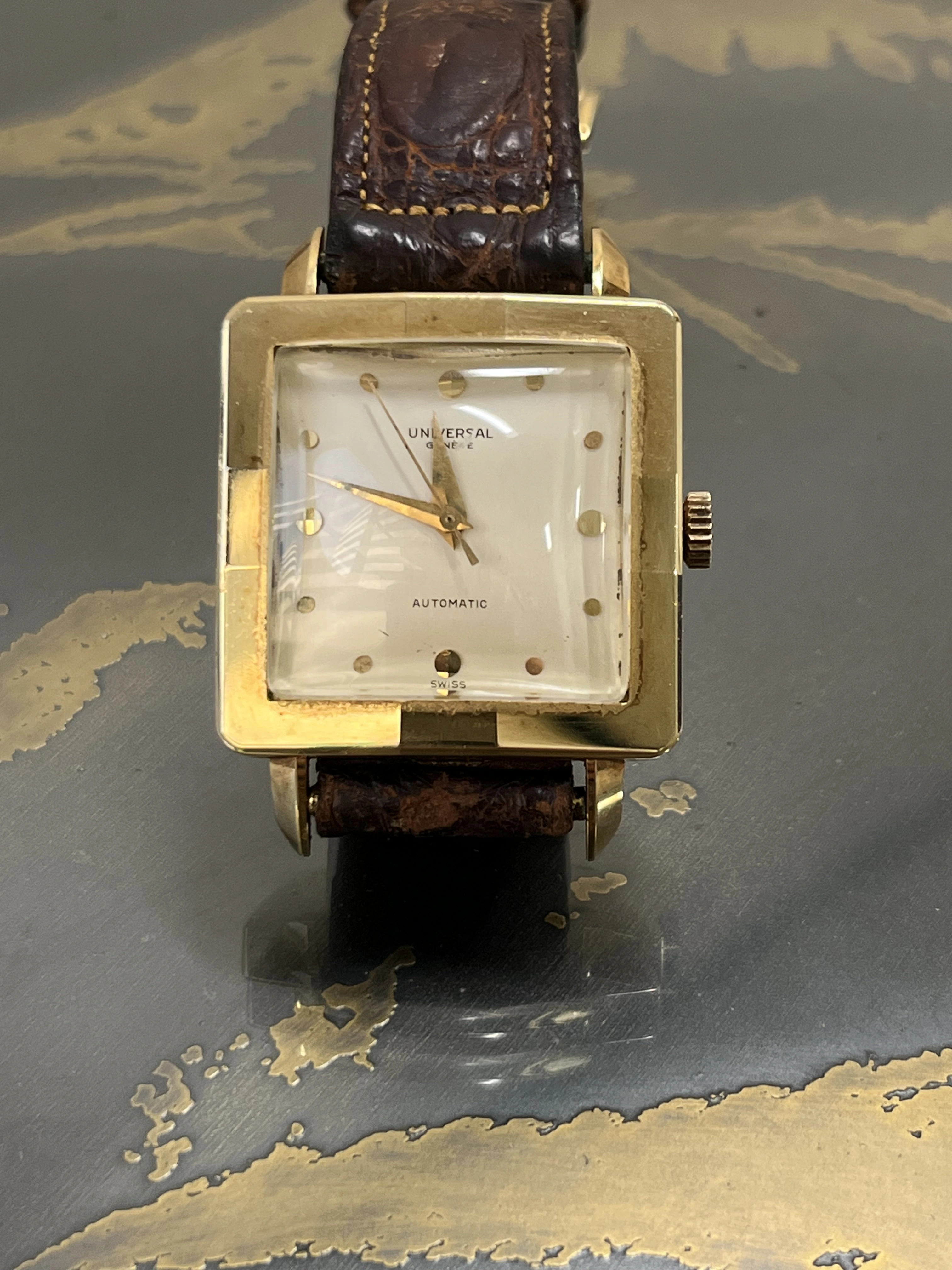 Hello up for sale is a rare and beautiful, vintage (circa 1950s from my research) Universal Geneve 30mm x 30mm 14k YG with caliber 138ss automatic bumper movement.