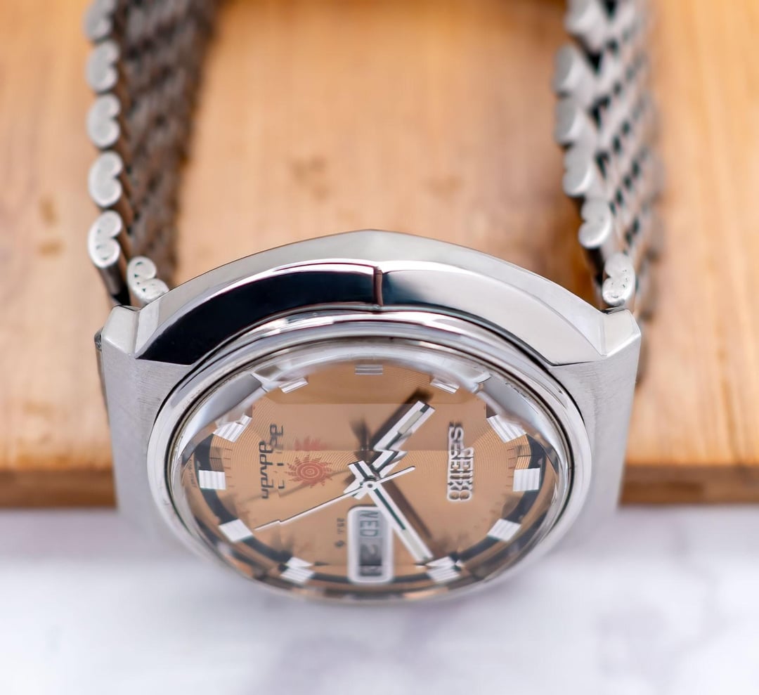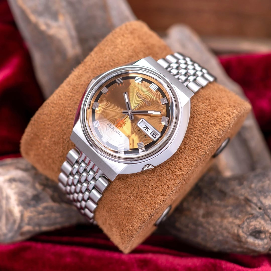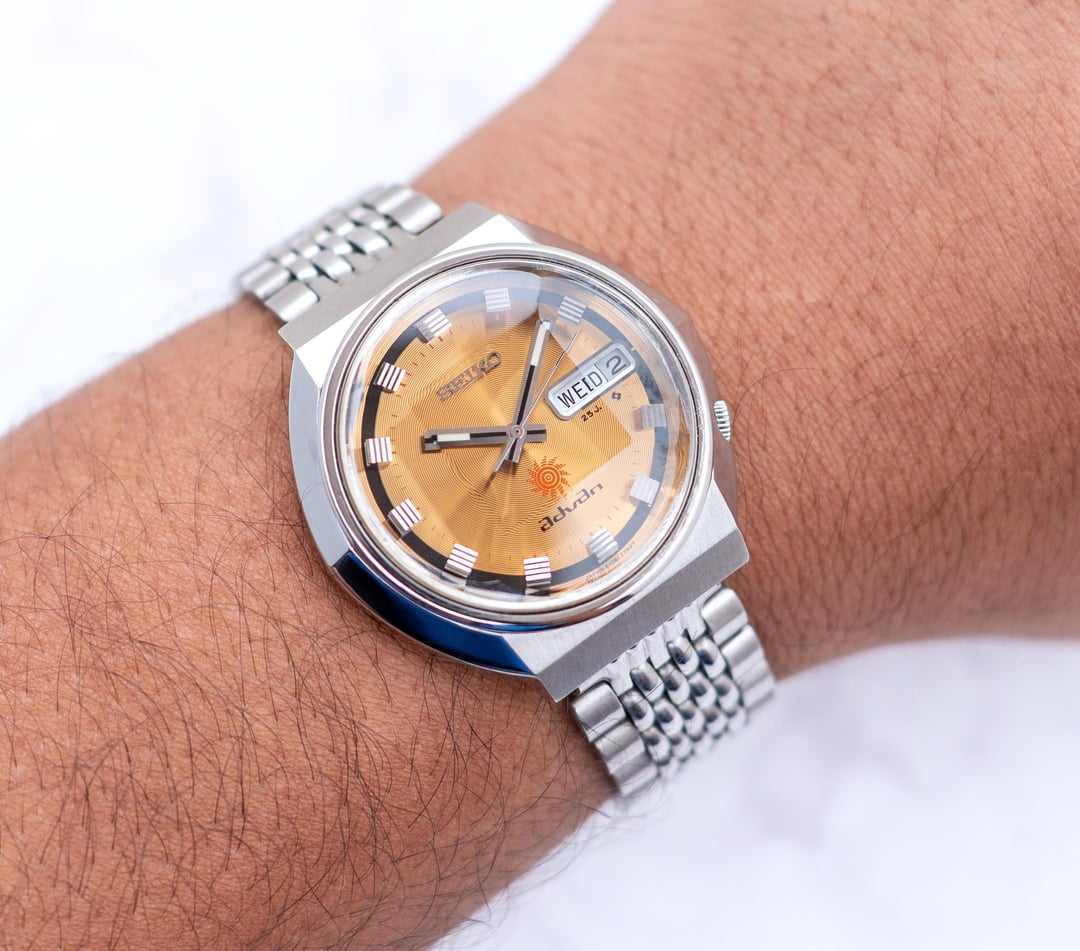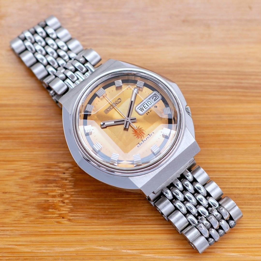 A very rare Seiko Advan watch in great condition. Futuristic design. Stunning vibrant Amber golden sunburst dial, unique layout. Very thoughtful creative design all over. Raised faceted indexes make the dial pop. Beefy solid jumbo cushion case. Comes with an aftermarket BOR (Beads of rice) bracelet, unsigned clasp. Faceted crystal gives it a retro vibe. Movement has been serviced. Good time keeping. Amazing condition at 53 year old, ready to be used as a daily driver. Oversized watch of its era being 39 mm. Such pieces should be appreciated upfront to experience at full measure, pictures don't do justice to this piece. Sunlight brings out most of its beauty. They were designed to have premium build quality but for only regions of Japan. Handling it, I can definitely guarantee this is superior to modern watches of the same price zone. Case is professionally polished keeping all the sharp brushed lines, edges and mirror finishing. It has both English and Japanese (Kanji) day options. The Kanji(Japanese) date and the Advan red logo highly complements the dial. A good collectors piece. Crown perfectly blends into case. Red dials are highly sought after in Seiko world, so this is a great investment piece as well. Textured 3d Mirror finished hand complements the dial. They're only released in Japan, JDM model. The sun emblem on dial is exclusive to Advan models. Advan was a premium Seiko lineup. The movement also has hacking feature. The date changing mechanism of the movement is rather special. By pressing the crown into the watch, the date will click and change automatically. PRICE: $329 USD via Paypal, Wise, Crypto. FREE Shipping worldwide. Considering a full service has been done to the watch, I'm asking a reasonable price. I have a good number of exchanges here for a safe transaction. Check my Instagram: [https://instagram.com/hour.lust](https://instagram.com/hour.lust) * Manufacturing Year: SEPTEMBER 1972 * Caseback Reference: 6106-7570 * Case size: 39 mm (without crown) * Lug to Lug size: 40 mm * Case thickness: 13.5 mm * 6106 Automatic Movement (25 Jewels) Pics: [https://imgur.com/a/WeNBJOQ](https://imgur.com/a/WeNBJOQ) TS: [https://imgur.com/a/cXbFf3m](https://imgur.com/a/cXbFf3m)