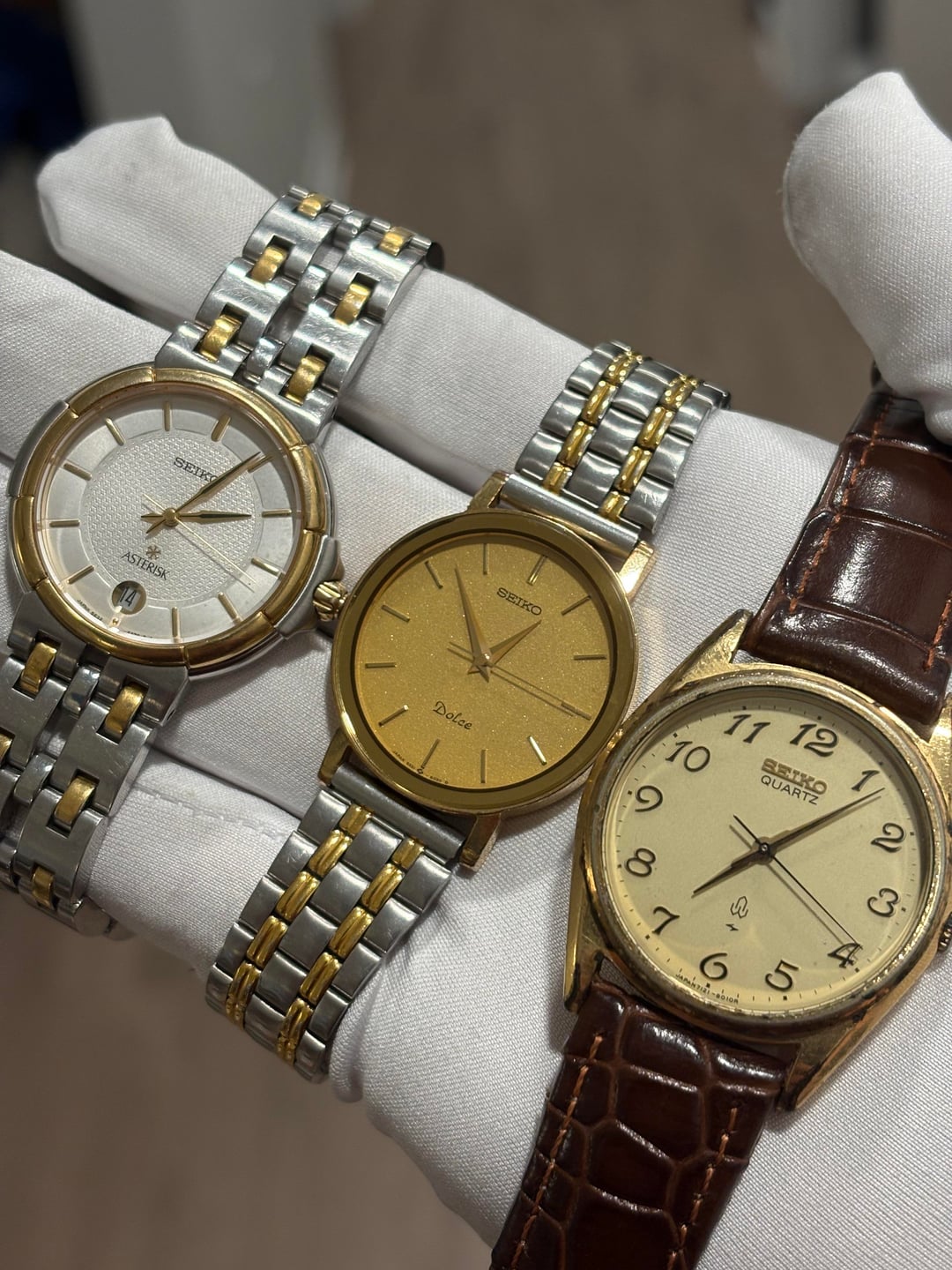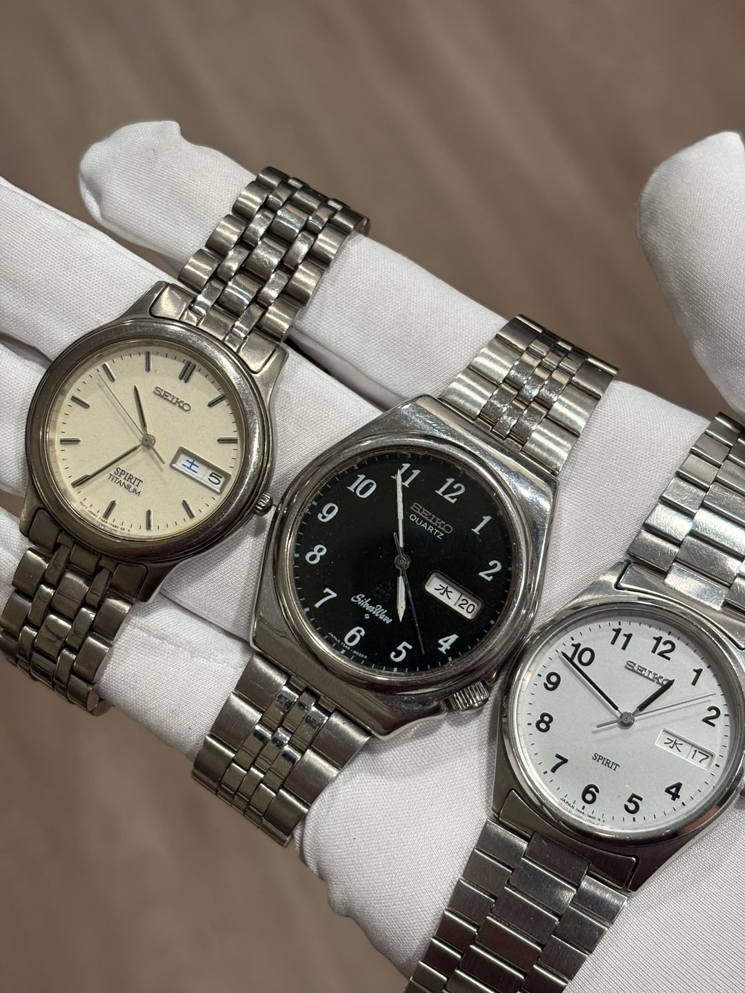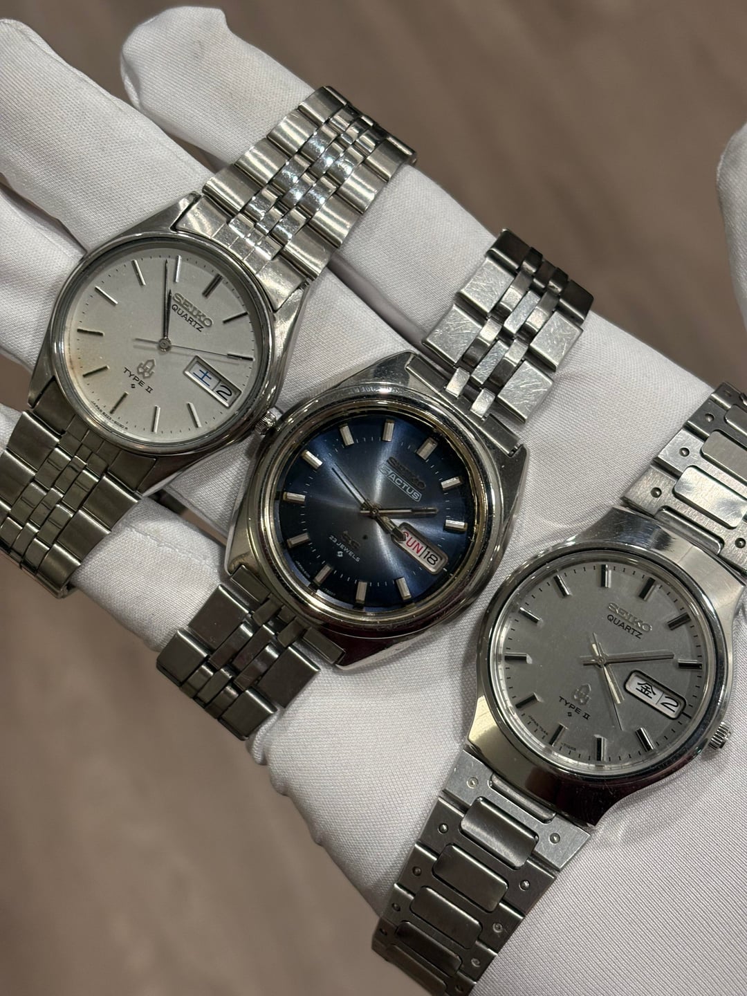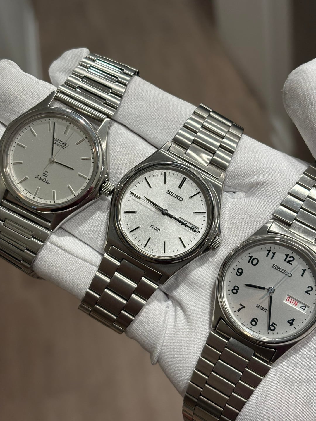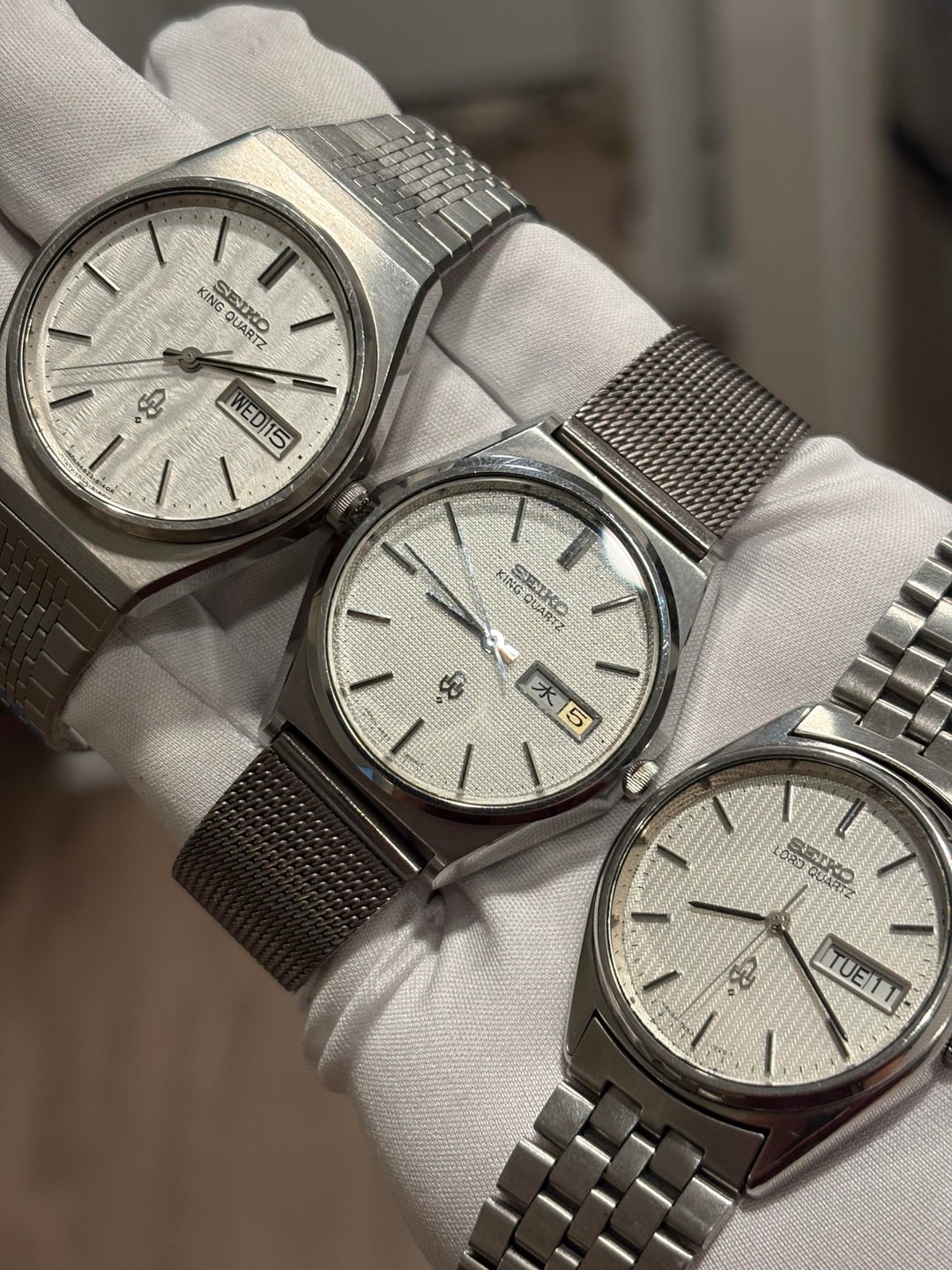 Tuesday sale! Looking to sell this collection of vintage Seikos! Based in Durham, NC, USA Prices are in order of pictures from LEFT to RIGHT: Snowflake King Quartz 4823-8130 - $349 *Waffle Dial King Quartz 4823-8060 - $299 Tapestry Lord Quartz 7853-7020 - $175 Gold Asterisk 5E32-6A50 - $150 *Gold Dusted Dolce 9531-6020 - $150 *Gold Quartz 7121-8000 - $150 Black Linen Type 2 7546-7050 - $199 *Silverwave 6030-7080 - $125 Spirit 7N48-7000 - $150 Spirit 7N43-7B60 - $130 Flightmaster 7T92-0CF0 - $150 5 Black Dial 7S26-0080 - $150 5 Black Dial 7S26-01V0 - $150 White Tapestry Spirit 7N48-7A10 - $150 Diamond Dial Spirit 5P31-6A50 - $130 Silver Chronos 5H23-7D40 - $130 Spirit 7N43-7B60 - $130 *Spirit Titanium 7N43-7150 - $110 *Black Silverwave 7546-802B - $110 Spirit 7N48-7A00 - $130 Silver Type 2 8223-6030 - $130 Blue 5 Actus 6106-7520 - $150 *Silver Type 2 8229-8000 - $110 White Roman 5Y39-8020 - $120 Silver Type 2 0903-8110 - $130 All have original bracelets unless marked* +Worldwide shipping via insured USPS or UPS I accept Zelle, PayPal FF, PayPal G&S (+5%), and Venmo I’m open to offers and bundle pricing! PM for more images and info! Thanks for looking and comment before PMing!