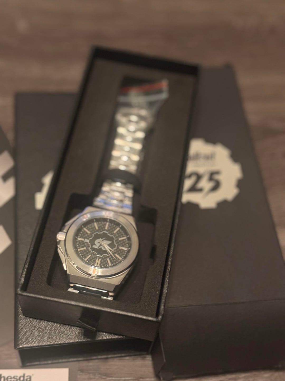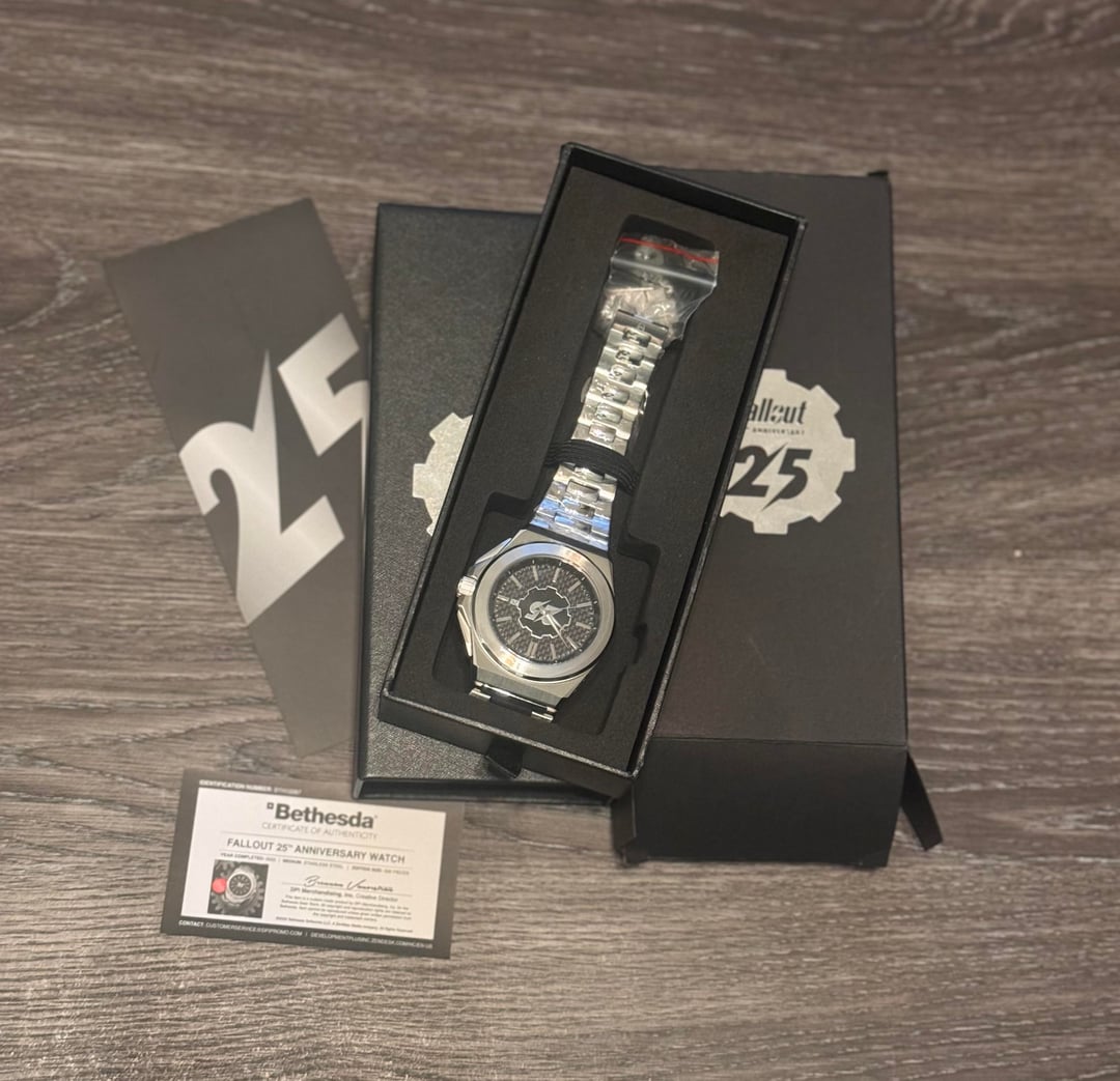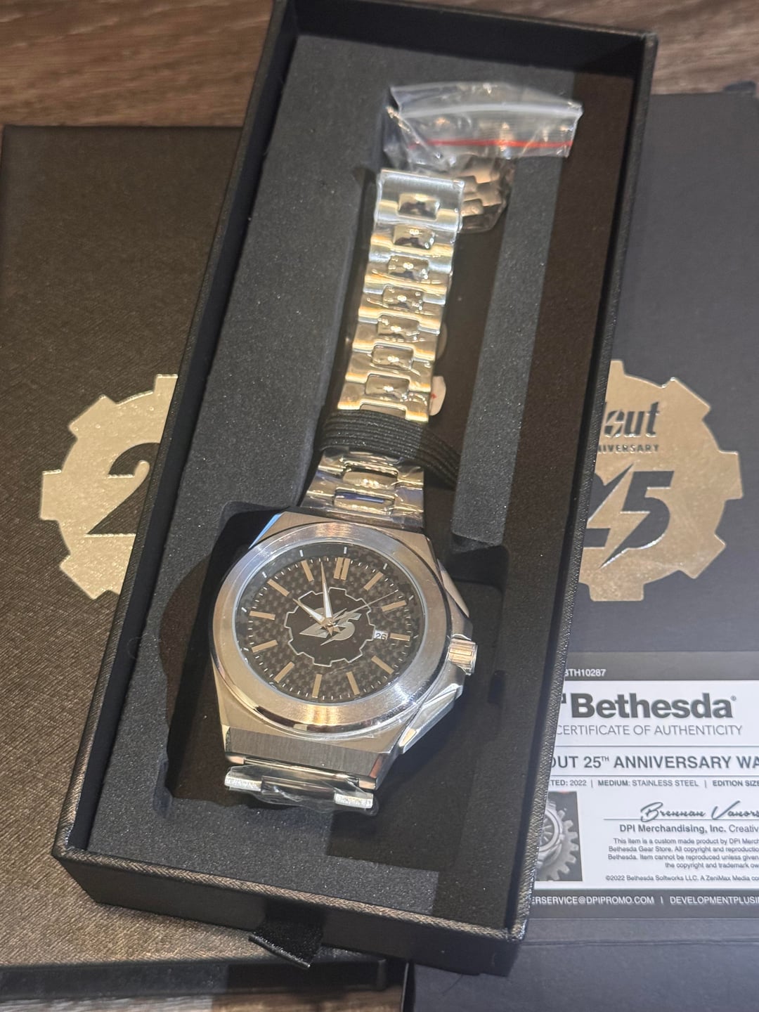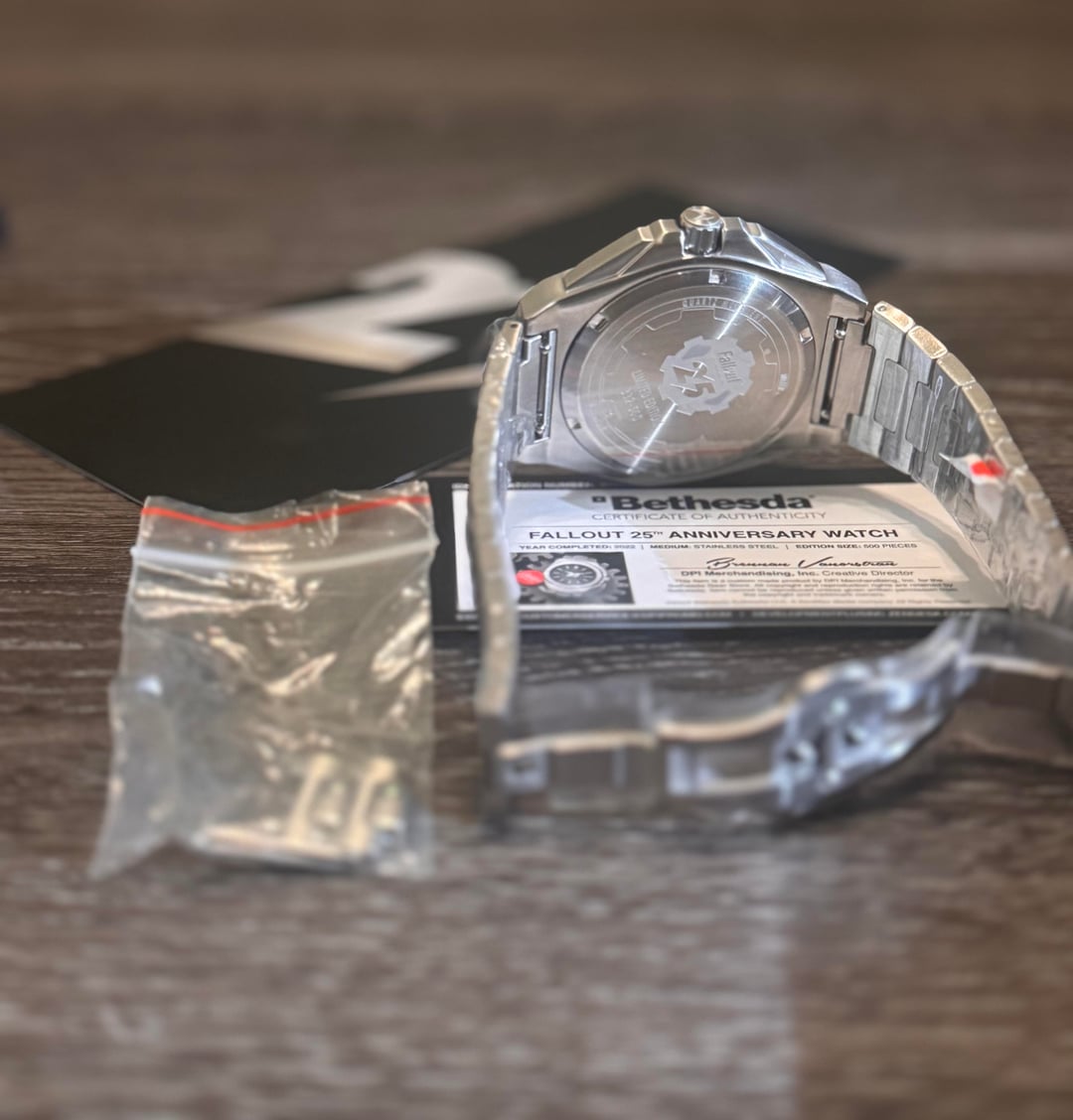 Hello, Fallout enthusiasts and watch collectors! I’m excited to offer a brand new, limited edition Fallout 25th Anniversary Meister Watch, numbered #332 out of only 500 produced. The watch has never been worn and remains sealed in its original plastic. While the box has been opened, everything else is in pristine condition, including the Certificate of Authenticity and the extra links. Price: $300 (plus shipping) Case Type: Stainless steel with a robust finish, perfectly complementing the Fallout theme. Shipping: Standard shipping fee of $20 within the U.S. Expedited shipping options are available for an additional cost. Payment Methods: PayPal (preferred), Venmo, or CashApp. Feel free to comment below or send me a direct message if you have any questions or need more details. This is a unique opportunity for both Fallout fans and watch collectors! Thank you for looking!
