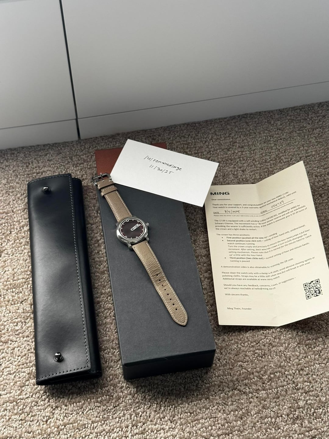 Condition: Excellent, no notable marks other than minor scratches from normal use. Flawless crystal. Warranty card dated August 2025. Includes: Watch, original Ming strap + signed buckle, box & papers Specs: 38mm x 10mm, \~44mm L2L, 20mm lug width. $1900 (Net to me) - Includes insured shipping CONUS. **No Trades**