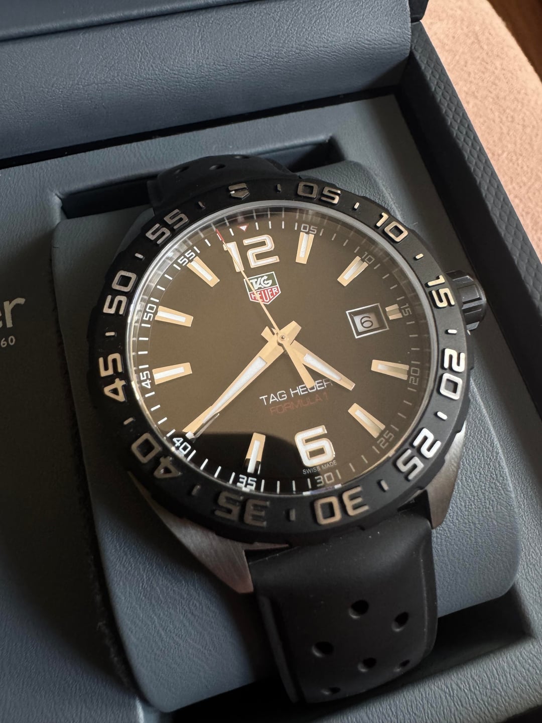 For sale is my black TAG Heuer Formula 1 Quartz, reference WAZ1110.FT8023. I purchased this new from WatchMaxx in February 2025. It has barely been worn. The watch is in like new/excellent condition and comes as a full kit with the original box, papers, and WatchMaxx warranty card included. Specs: • Movement: Swiss Quartz • Case: 41mm stainless steel • Bezel: Black PVD-coated unidirectional rotating bezel • Crystal: Sapphire with anti-reflective coating • Dial: Black with luminescent hands and markers, oversized numerals at 6 and 12, and date window at 3 • Crown: Screw-down • Strap: Black rubber with steel pin buckle • Water Resistance: 200m / 20 ATM Price: $899 (includes insured shipping within the CONUS). Willing to entertain trades of similar value. Payment: • Preferred: Zelle • Will accept PayPal G&S if buyer covers fees I’m happy to provide additional photos or answer any questions. Thanks for looking!