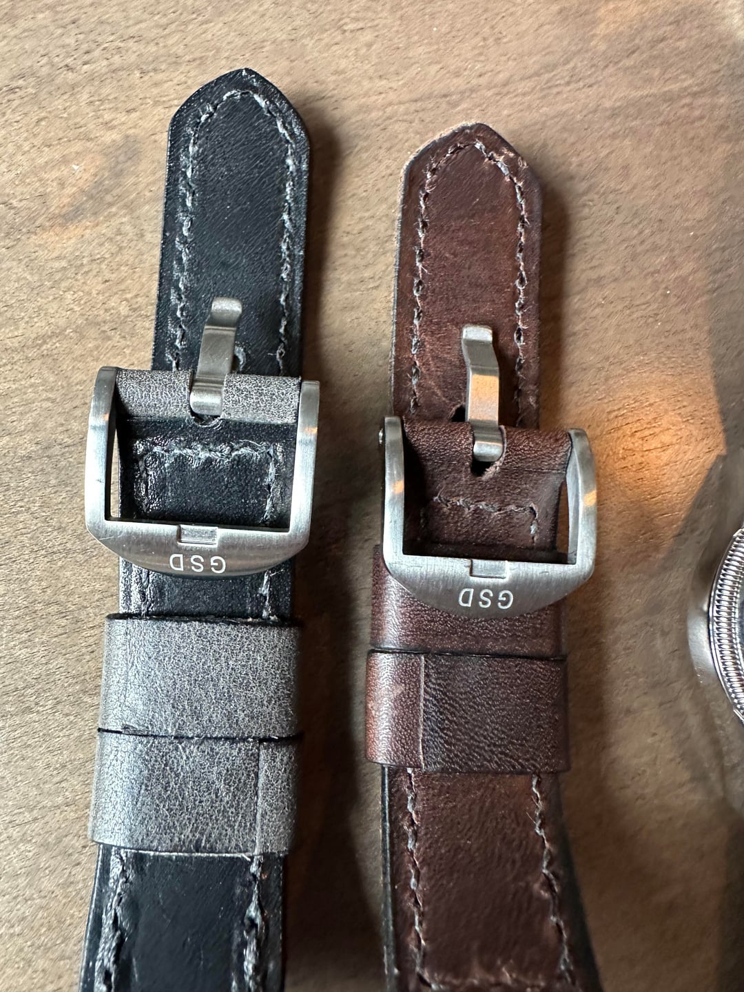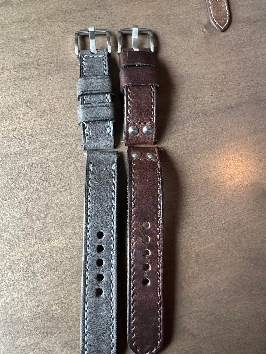 Selling 2 Greg Stevens straps. One is a brown Pilot strap. The other is a grayish leather. Asking $65 each or $100 combined.