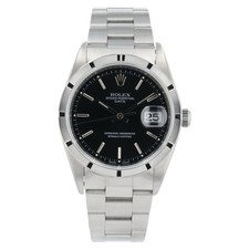 | Rolex Date Steel Black Dial Engine Turned Bezel 34mm Watch A 15210 jewelsintime (3004) |