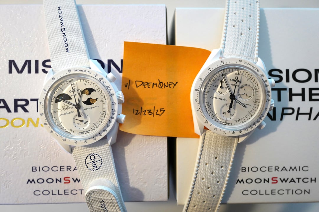 Timestamp is the last image in the post Selling one of these two white MoonSwatches as I don’t need two white Swatches. Prefer to sell the Moonphase but open to parting with the Cold Moon. ⸻ Omega x Swatch MoonSwatch – Moonphase (White) • Price: $300 (open to offers)+ shipping • Condition: Worn a handful of times, excellent condition • Includes: Original packaging, receipt and strap (never worn) + white StrapBuddies tropic band ⸻ Omega x Swatch MoonSwatch – Moonshine Gold Cold Moon (White) • Price: $550 + shipping (based off sold eBay listings) • Condition: BNIB (brand new in box) • Outside of the initial release date, only sold when it’s snowing in Switzerland. • Includes: Full original packaging including receipt and UV keychain light. ⸻ Notes: • Will ship promptly after payment has cleared • Additional photos available upon request, just reach out Payment: PayPal G&S (per subreddit rules) Shipping: CONUS preferred Please comment before PM. Thanks for looking!