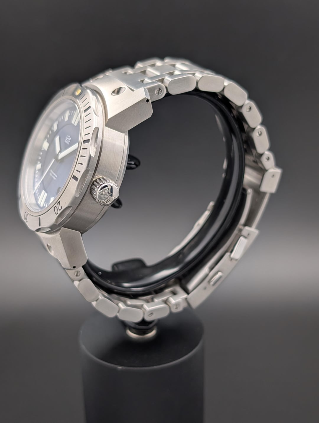 The watch is in excellent condition with almost no signs of wear. The watch winds, sets, and runs. The watch will fit a wrist up to 7 inches with the cuff extender retracted. It will adjust out to fit a 7.5 inch wrist. No box or papers. Model: UTS München 1000m Dive Watch V.2 Movement: ETA 2824-2 Swiss TOP grade automatic Case: 43mm 316L steel (steel grade 1.4404) Dial: blue, super luminova on hands and indices W.R.: 100ATM (1,000m) Crown: screw down Strap: stainless steel link with deployment clasp and diver's extension adjustment (fits 7 in wrist retracted or 7.5 inch wrist extended) **Watch offered at $1,499 OBO shipped. USA shipping only. No trades.**
