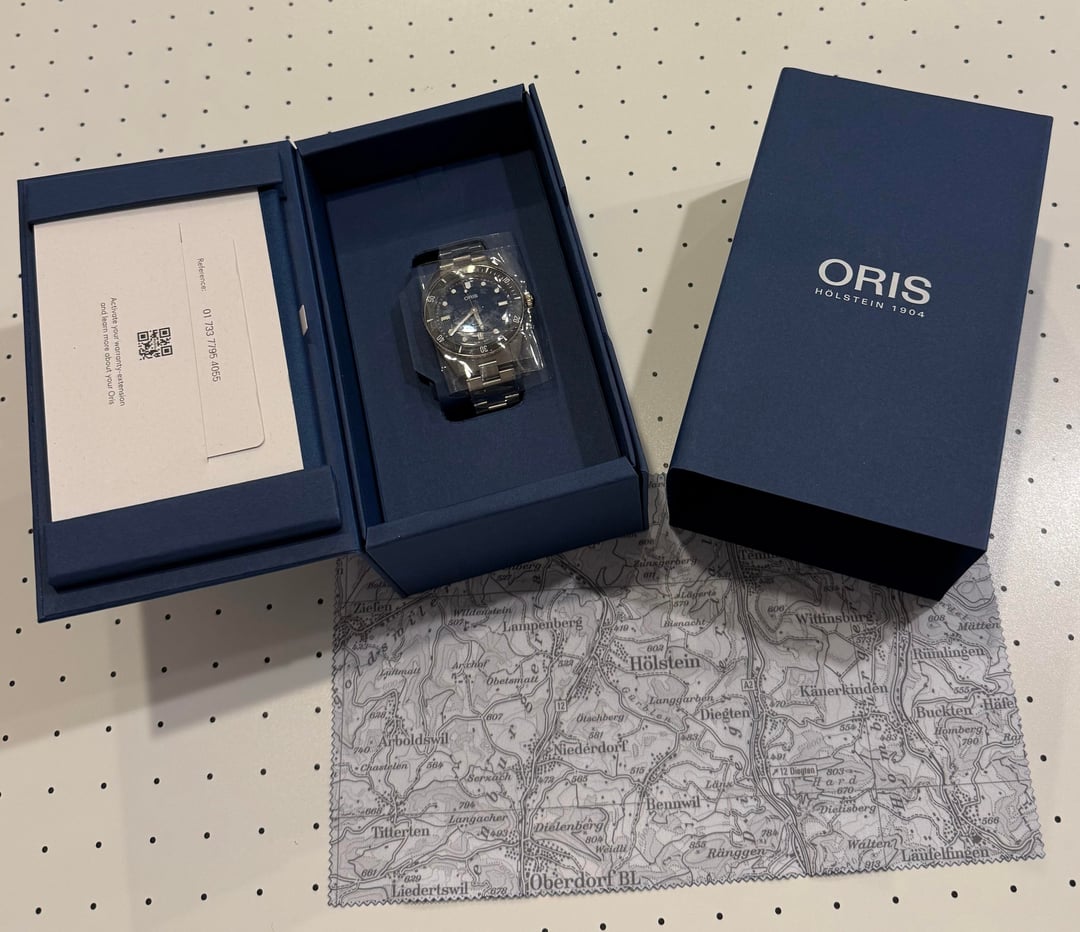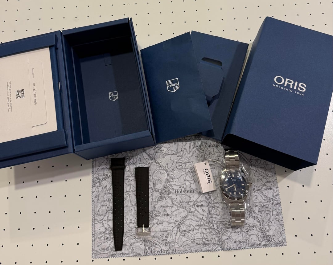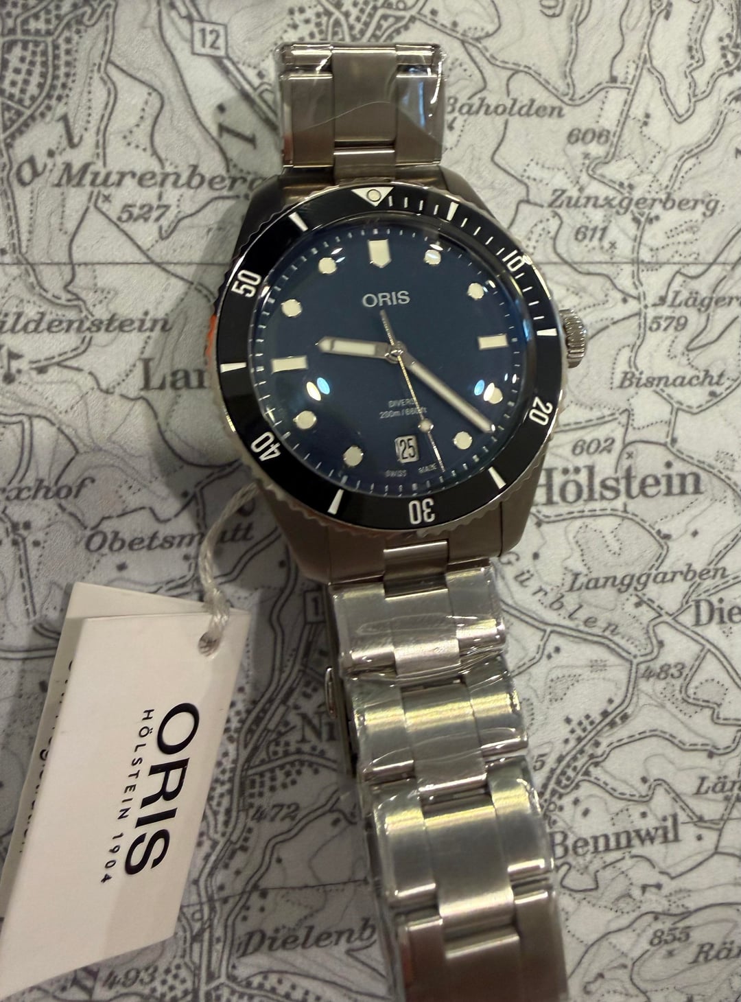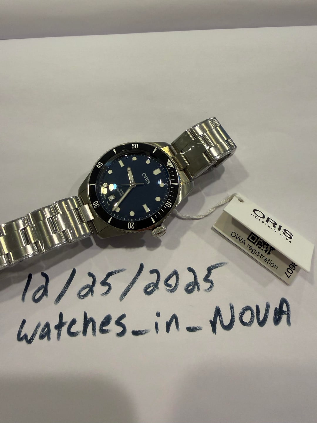 [WTS] Oris Divers Date (Blue) (39mm) – New | AD Full Set | Warranty – $1,725 🏷️For sale: Oris Divers Date (2025), Reference: 01 733 7795 4055-Set, Blue dial. 🧼Condition: Brand New / Unworn — stickers (case only) removed only for pictures. Bracelet is still fully wrapped. 📍Location: Washington DC Metro USA. 💰Price: $1,725 OBO. No trades. Payment: Venmo, PayPal F&F / G&S (buyer must account for fee), or Zelle. 🚢Shipping: USPS insured + tracked (buyer cost), CONUS only unless discussed. ✅Full Kit w/ Active Warranty: • Full Kit w/ hangtags and protective films. Quick change metal bracelet with black rubber strap included + Oris cleaning cloth. • AD warranty card, activated this month, good through DEC 2028. (Note that the warranty follows the watch's serial number, regardless of ownership. A purchase from an authorized dealer is required. USA purchases with activated warranties are fully covered). • Current AD dealer asks range from $2,400-$2,800 / Grey Market (re: Jomashop or WatchMaxx) asks range from. $2,050-$2,100. This is priced to move. 🔎Specs: • 39.00 mm / 19mm interhorn width • Automatic 773-1 movement with 41 hour power reserve • 20 Bar / 200M Water Resistance • Multi-piece stainless steel case, ceramic minutes scale top ring. • Sapphire crystal, domed on both sides, anti-reflective coating inside.
