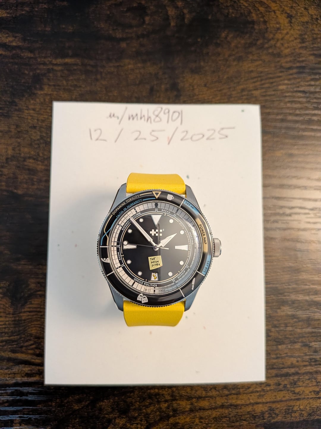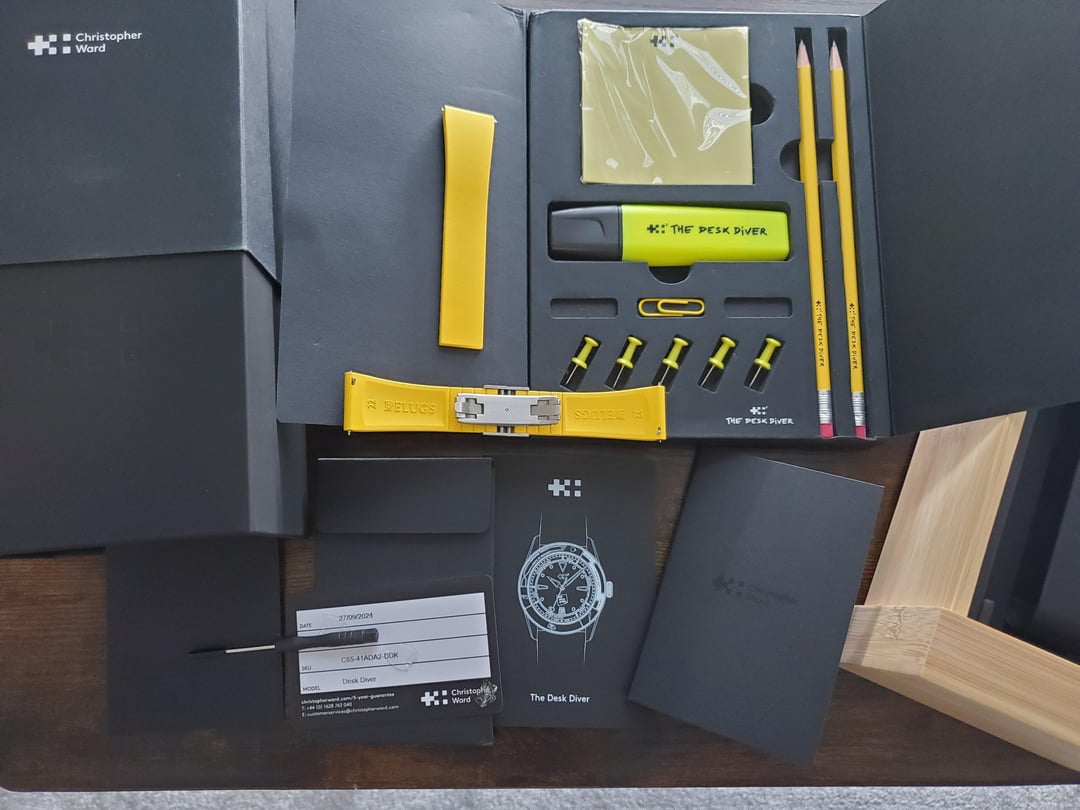 For Sale: **Christopher Ward Desk Diver LE 79/500 41mm with Delugs CTS Rubber Strap $1500** Includes: Full Set Box and Papers. Warranty Card Dated 2024/09/27. Sealed Post It Notes Pad, Highlighter, Pencils, Thumbtacks and Paperclip. Limited Edition Sold Out. Watch Model: C65 Dial Color: Black Case Diameter: 41mm Case Height/Thickness: 12.45mm Lug Width: 22mm Lug to Lug/Case Length: 46.68mm Water Resistance: 200m Movement: Sellita SW200-1 Power Reserve: 38 hours No of Jewels: 26 Vibrations: 28,800 p/hr (4Hz) Timing Tolerance: +/- 20 sec p/day Case Color: Silver Bezel Color: Black Case Weight: 70g Lume: SLN BL Grade X1 Comes with Yellow Delugs CTS sized to 6.3in (16cm) with 1 Uncut Piece **$1500** Shipped (CONUS). Ships from Texas. International Shipping on your label. Glad to do a FaceTime/video call or provide more photos if needed. Accept Zelle, Venmo, PayPal (Buyer pays fees).
