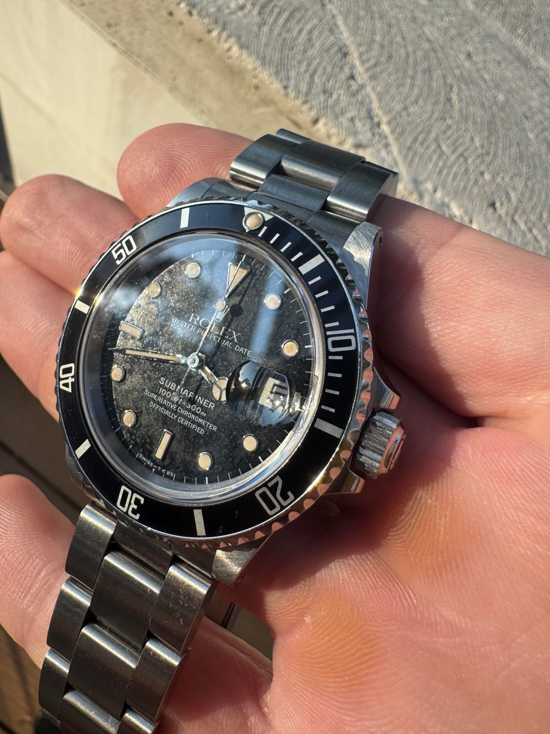 Insane speckle and patina on the dial. Beautiful 16800. Fun birth year watch! Condition Notes Dial is speckled Bracelet is tight Case is excellent Crystal is flawless Offered at $9,100 wire (references available) email to [email protected] or text call to +16192899258 Shipping & Returns Free, priority overnight insured shipping within the U.S. 3-day inspection window & returns allowed if watch is not as described Brand Rolex Model Submariner Date Reference Number 16800 Year 1986 Case Size 40mm Case Material Stainless Steel Crystal Sapphire Crystal Dial Black Bracelet Stainless Steel Movement Automatic Water Resistance Pressure Tested - Passed Box/Papers Watch Only Condition Excellent