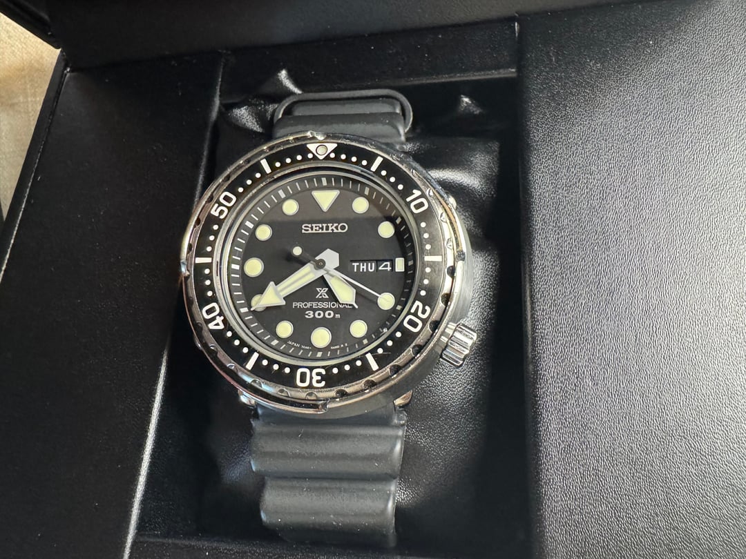 Hey everyone! I'm selling this now discontinued Seiko Prospex SBBN045 Tuna. Fully boxed with hang tag, stamped warranty card, and February 2024 service papers (they have some personal info on them so I can provide pictures to perspective buyers and will provide paper copies to the buyer). Reference # is S23629J1 (or in JDM as SBBN045). This reference features Seiko's 7c46 quartz movement which is exclusive to the Tunas, a diashield coated case, a sapphire crystal, and black day / date display. This example is in very good used condition (noticeable scratches/ marks on the bezel insert in the right light which I tried to capture). Case measures 47.7 wide and 14.3 thick, with a 48mm lug to lug measurement and 22mm lug width. Purchased here last year for $1,000, only wore once, and now looking for **~~$950~~ $900 shipped** in the US, payment via PP F&F or Venmo. Timestamp: https://imgur.com/a/xbGuX7y Photo album: https://imgur.com/a/WIja9CR