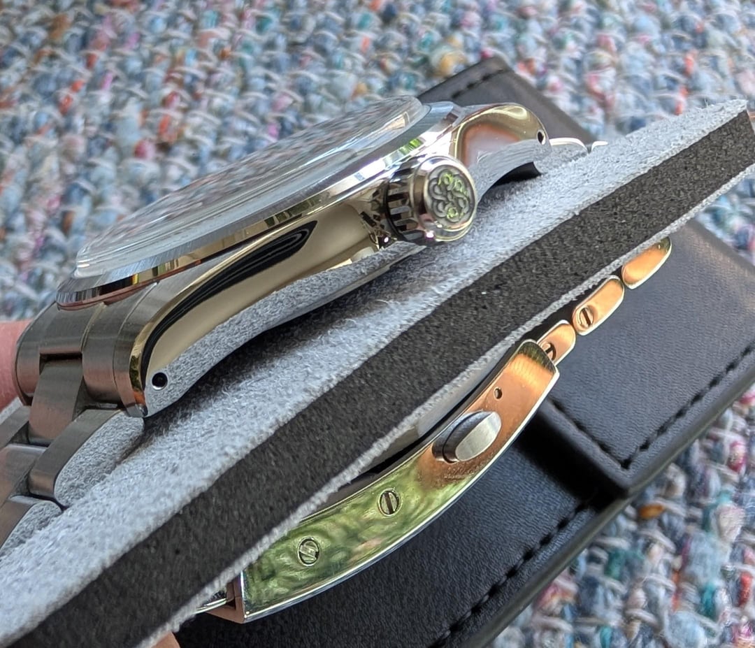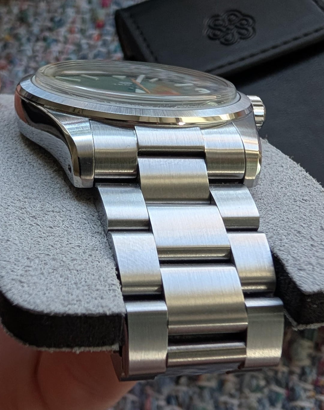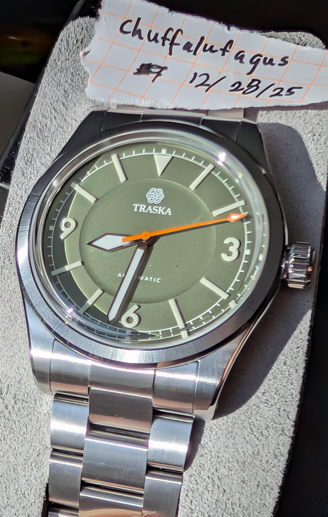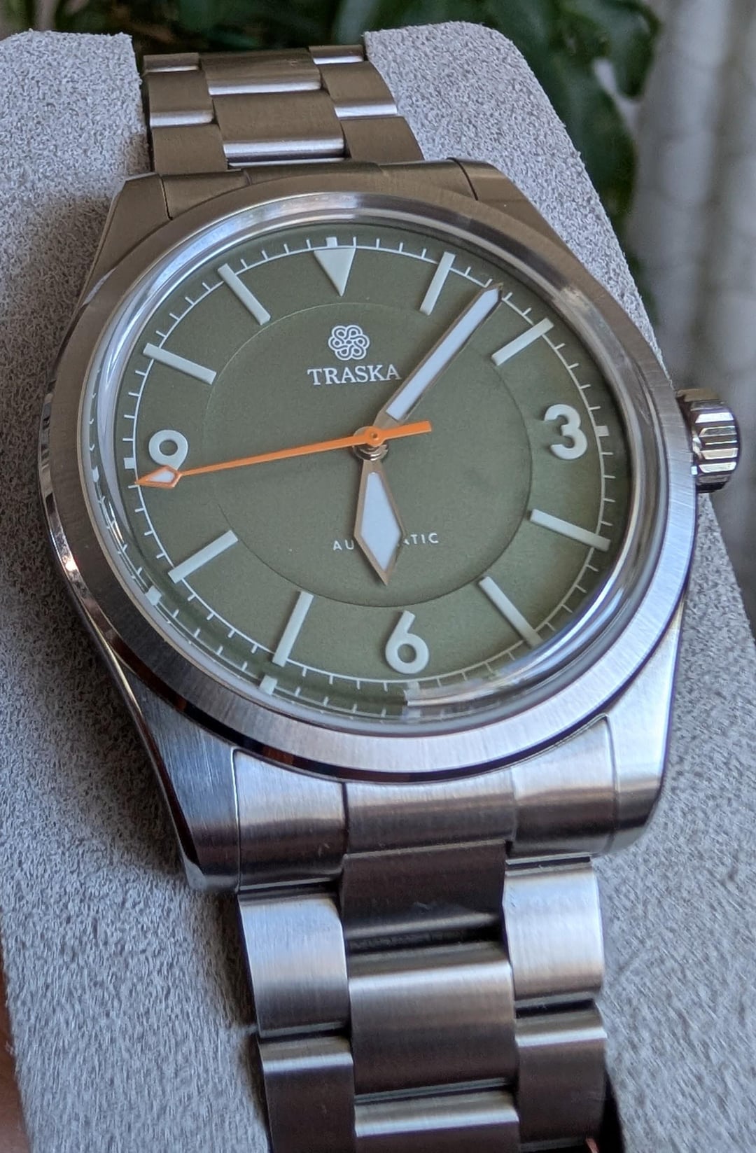 **Details:** $650 Shipped CONUS via USPS - Insurance included in the price. PayPal F&F, Zelle, and Cash App accepted. This colorway appears to be discontinued based on the most recent Summiteer releases **Included:** Original box, leather pouch, unworn OEM steel bracelet with micro-adjust clasp, extra links. **Condition:** Used, nearly new with one hairline scratch on case as identified and circled in the photo (I don't understand how I managed it considering the case hardening used by Traska). Otherwise the watch has no other marks that I noticed ༼ つ ◕\_◕ ༽つ \*Not currently interested in trades\* **Specs:** Model: 2195 Movement: Miyota 9039 Automatic Indicies: Hand Applied Lume: Super-Luminova BGW9 Hands: Diamond Cut Case: 316L Stainless Steel with polished chamfers, drilled lugs, and scratch resistent coating Bezel: Sunburst brushed Crystal: Box-style double-domed sapphire with underside antireflective coating Dial: Recessed semi-matte Sage Green Bracelet: 316L fully articulating, tapered, scratch resistant coating, and solid end-links. Tool-less micro adjustable clasp Water Resistance: 100m/330FT
