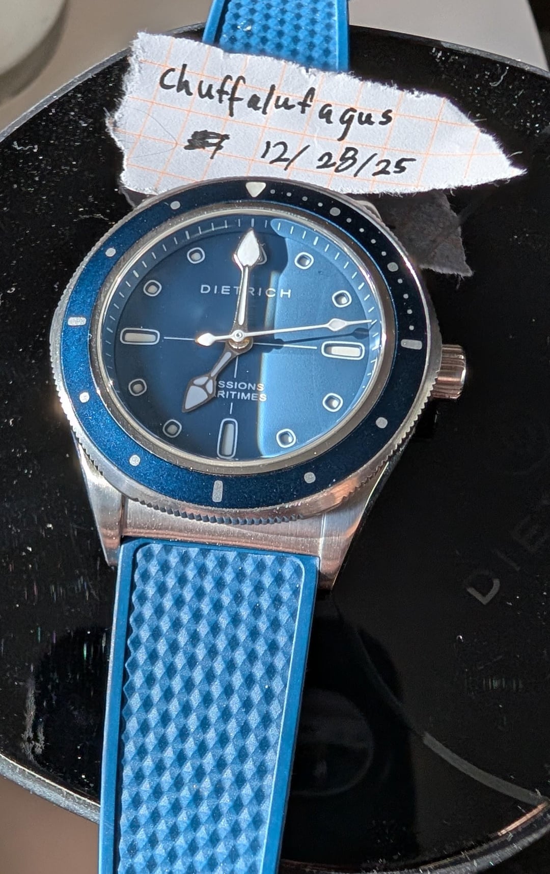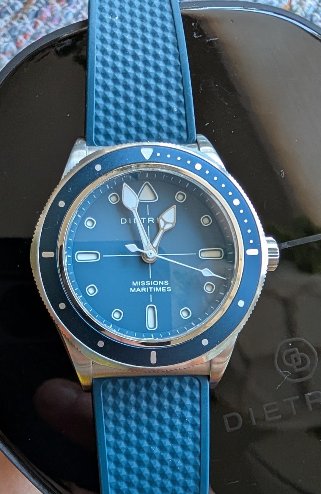 **\*This is a corrected version of my original post with the wrong model number\*** **Details:** $350 Shipped CONUS via USPS - Insurance included in the price. PayPal F&F, Zelle, and Cash App accepted. **Included:** Original box, blue rubber OEM strap. **Condition:** Used with one decent sized scratch on case as identified and circled in the photo. Otherwise the watch is in good shape. ༼ つ ◕\_◕ ༽つ \*Not currently interested in trades\* **Specs:** Material : Forged Stainless Steel, brushed with polished bevels Diameter : 38.5mm Height : 12.6mm Lug Width : 20mm Weight : \~80 grams (watch head only) Lug to Lug : 46.2mm Water Resistance : Up to 150 meters Dial : “Sandwich” construction, recessed markers filled with C1 Super-Luminova, green emission Bezel : Unidirectional, anodized aluminium insert, triangle at 12 o ‘clock filled with white C1 Super-Luminova, green emission Hands : Silver hands, brushed and filled with white C1 Super-Luminova, green emission Glass: Sapphire Crystal, with 5 layers of AR coating underneath. Caseback : Solid Stainless Steel screw-in caseback Crown : Screwed-down engraved with DIETRICH skin diver “fish” symbol Type : Sellita SW200 automatic, Swiss made Power Reserve : 38 hours Jewels : 26 Indication : Hours, minutes and central second hands Frequency : 28,800 oscillations per hour Strap: Blue NBR rubber strap with DIETRICH signed buckle.