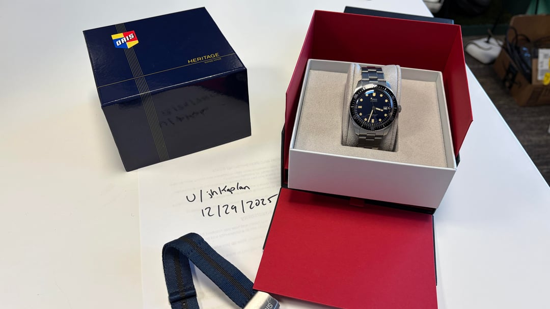 Listing my **Oris Divers Sixty-Five 42mm** with the classic blue dial. This is one of the OG versions of the 65—the watch that basically kicked off the whole vintage diver revival trend. **The Watch:** 42mm blue dial Sixty-Five. Domed sapphire crystal gives it that retro bubble look, pairs perfectly with the blue sunburst dial and cream "old radium" lume. Runs on the Oris 733 (Sellita SW 200-1 base)—workhorse movement, been running strong with no issues. **What's Included:** * Watch on the **Oris stainless steel bracelet** (seriously one of the most comfortable bracelets in this price range—tapered, slim, sits flat) * **Oris blue NATO strap** (great summer option) * Watch and box **Condition:** Pre-owned, worn but well cared for. Some light wear consistent with age—desk diving marks on the bracelet clasp, maybe some light swirls on the case if you hunt for them. Crystal is clean. Keeps good time. No warranty. **Specs:** * 42mm diameter / \~13mm thick / 22mm lug width * Stainless steel case * Domed sapphire crystal (both sides) * 100m water resistance * Oris Cal. 733 automatic **Price:** **$825 shipped** CONUS. PayPal F&F, Zelle, or Venmo (with references), G&S +3% with no references. Not looking for trades. Happy to answer any questions or send more pics/video. Thanks for looking! **Timestamp:** \[[Timestamp Link](https://preview.redd.it/wts-oris-divers-sixty-five-42mm-blue-dial-bracelet-nato-825-v0-877goz16b6ag1.jpg?width=1080&crop=smart&auto=webp&s=4463ec18aa83b251d54b8b5855a1500a8e0378ac)\]