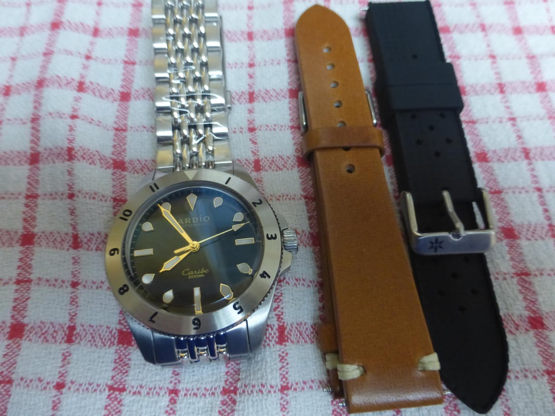 Ardio Caribe automatic dive watch. Mint condition. Microbrand. Metal bracelet has never been worn or sized and still has the plastic wrap on it. Miyota 9000 series hi-beat automatic movement. Comes with new rubber strap, new leather strap, beads of rice bracelet and original box. $300 shipped in the continental US, sorry no trades. Here are the watch specs: * **Material:** 316L Stainless Steel, **Finish:** Brushed * **Water Resistance:** 200 meters / 650 feet * **Diameter:** 40mm, **Thickness:** 10.8mm (12.8mm with crystal) * **Lug-to-lug:** 47.9mm, **Lug width:** 20mm