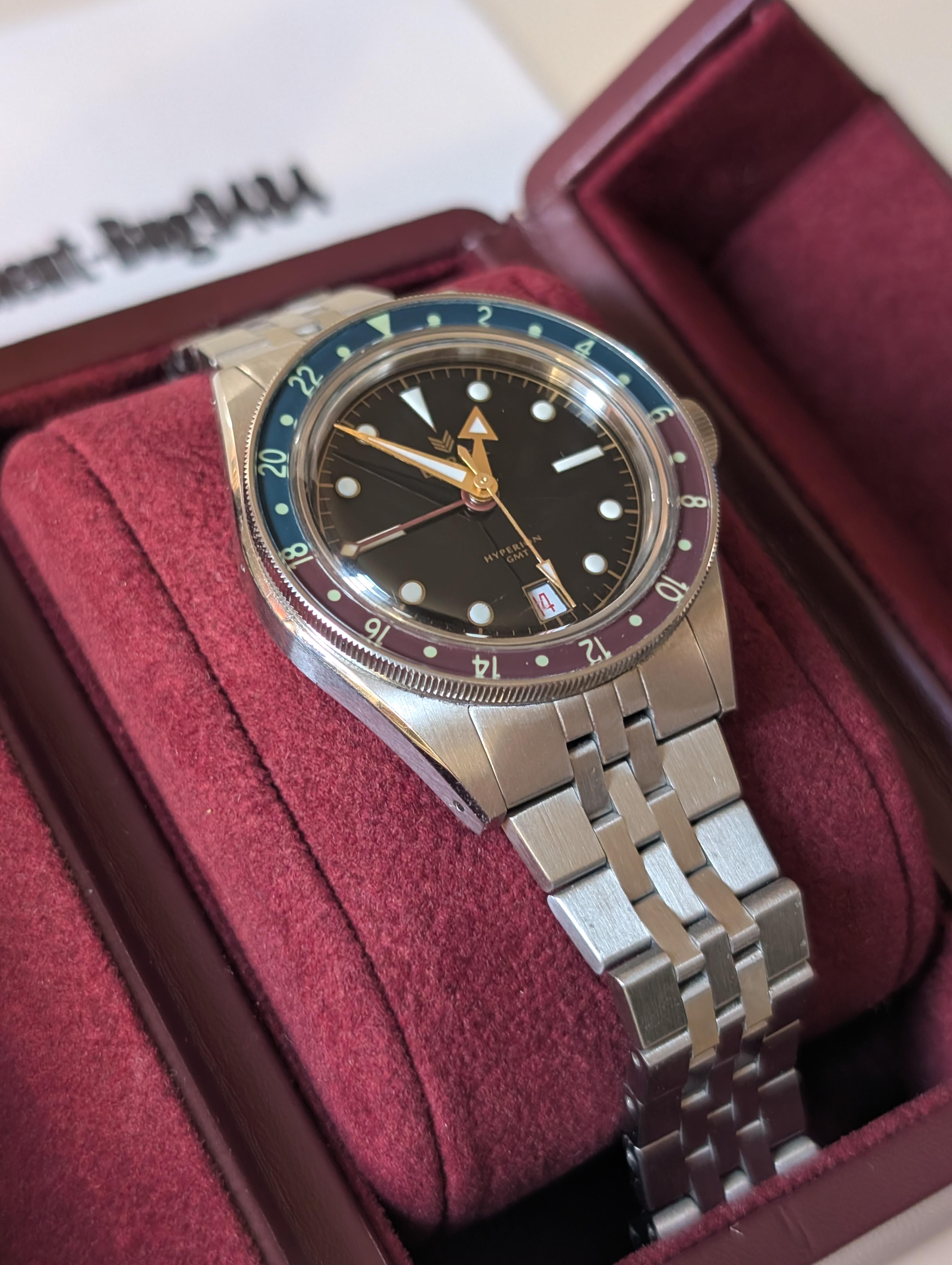 [Album](https://drive.google.com/drive/folders/1qY6rVDNd_MFbzR_U_c3HKACxMWDrEcek) Selling my Lorier Hyperion VII. I bought this watch from Lorier during their last restock in August. I wore it a handful of times and loved it, but ultimately decided it's not quite right for me. This version has the new 5-link Epsilon bracelet with tool-less microadjust as well as the Miyota 9075 movement with an independent jump-hour hand (true GMT). The watch is in good condition and is running very well at +0s/d in certain positions. There are some scuffs on the bracelet clasp and a small scratch on the crystal near 7-o'clock which I have tried to capture in the images. I believe the scratch can be polished out with the included Polywatch, but I'll leave that decision to you. New factory clasps are also available from Lorier for $40. Asking $650 shipped from PA (US only, DM if interested in international shipping) via PayPal, Zelle, or Venmo. Happy to video chat anyone interested given my low transaction count.