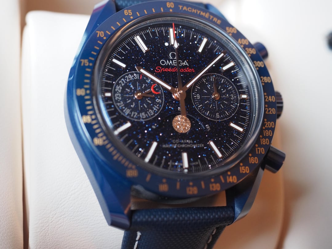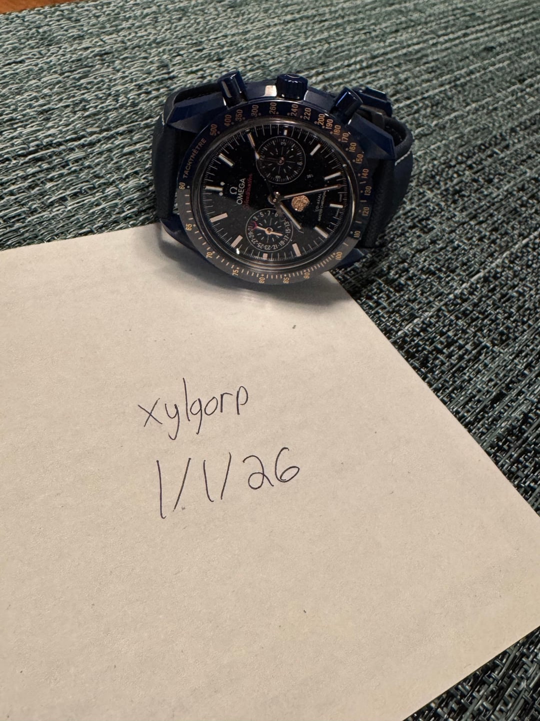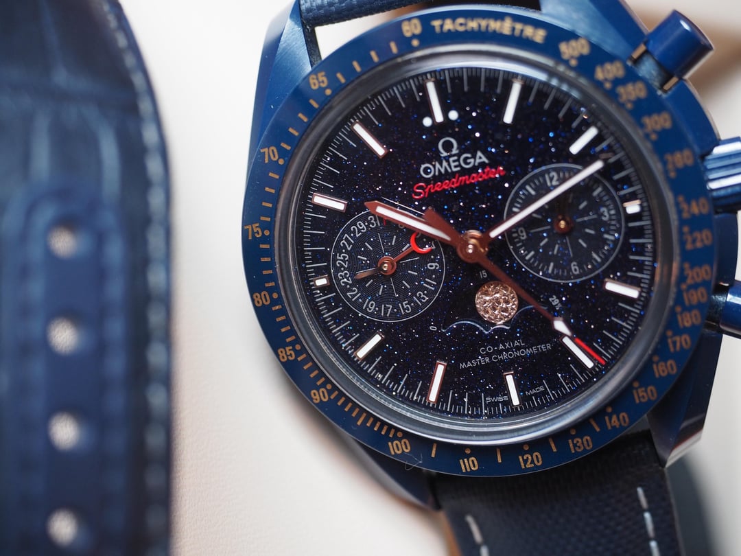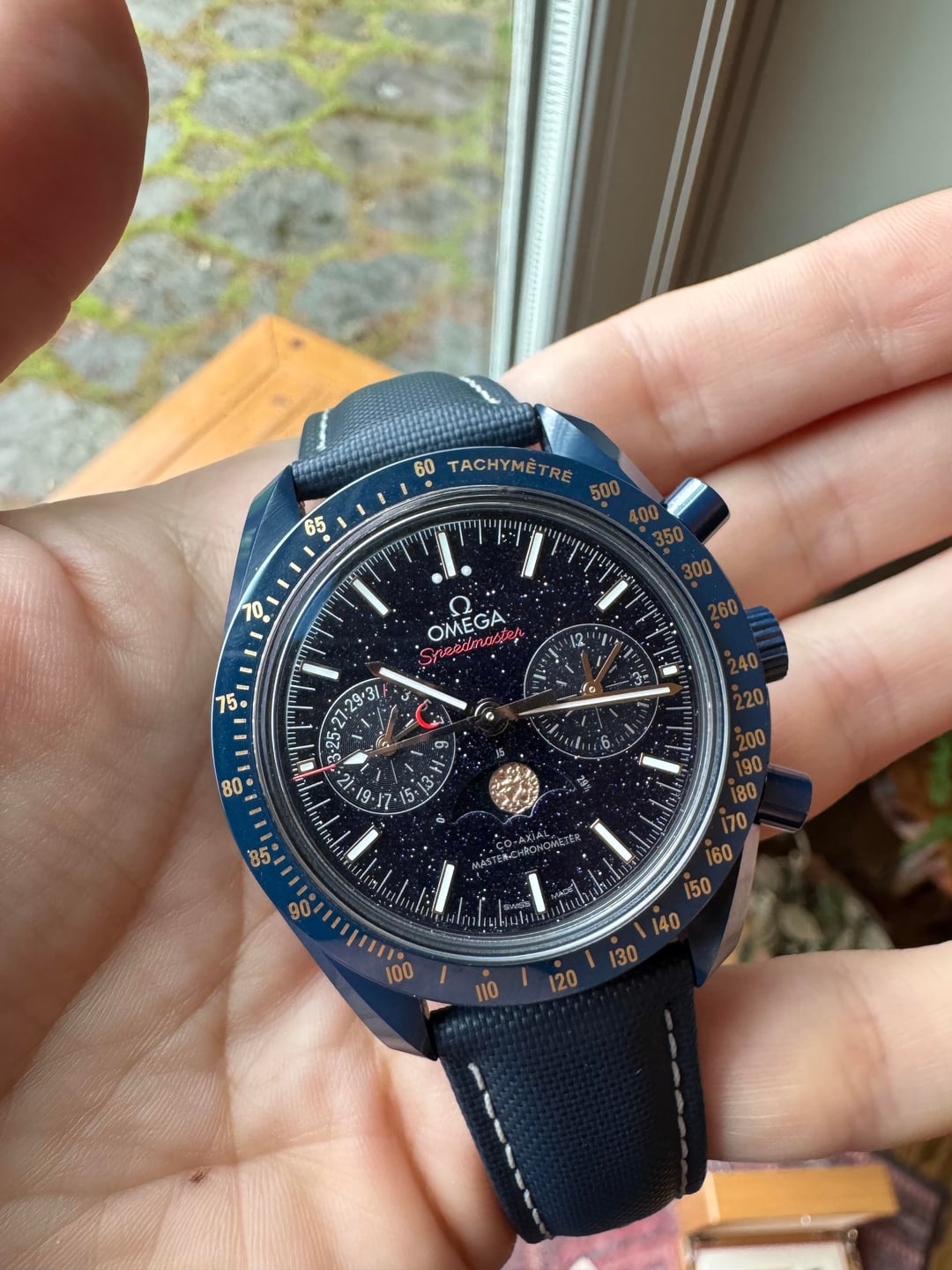 Omega Speedmaster Moonphase Blue Side of the Moon Aventurine – Reference 304.93.44.52.03.002 Includes Artem Strap, original leather + buckle. **No Warranty Card** **Price**: $8,999 shipped in the US. Omega Speedmaster Moonphase, known as the "Blue Side of the Moon" is set on a 44.25 mm blue ceramic case and bezel features a stunning blue Aventurine dial, reminiscent of a star-filled night sky. · Case & Bezel: 44.25mm Blue Ceramic with Sedna Gold Tachymeter Scale · Dial: Blue Aventurine with 18K Sedna Rose Gold hour markers and hands · Movement: Omega Master Chronometer Co-Axial movement with Moonphase complication Condition: Excellent Condition, didn't see the fuzz until after I took the photos 😅 Happy to FaceTime as needed!