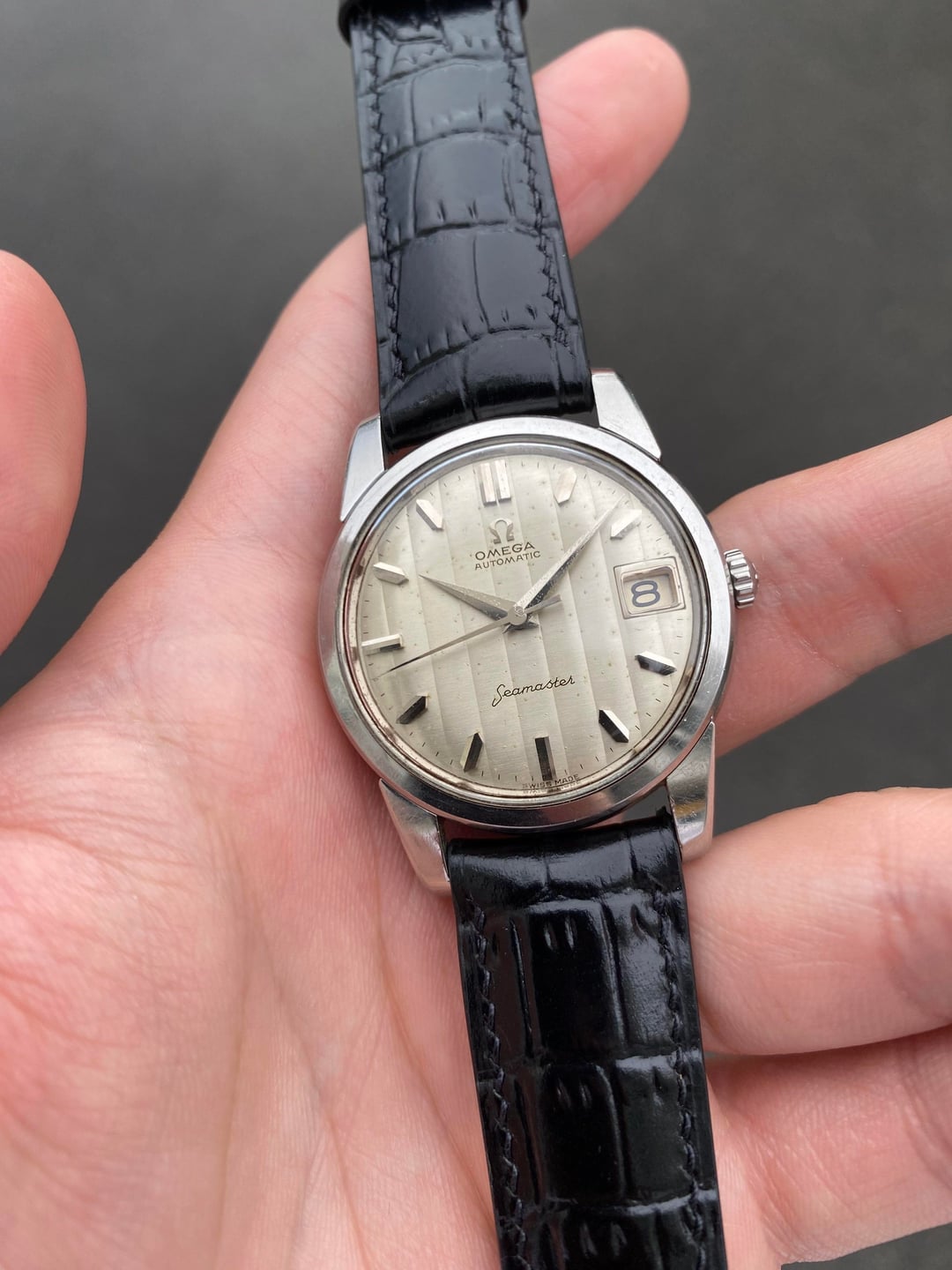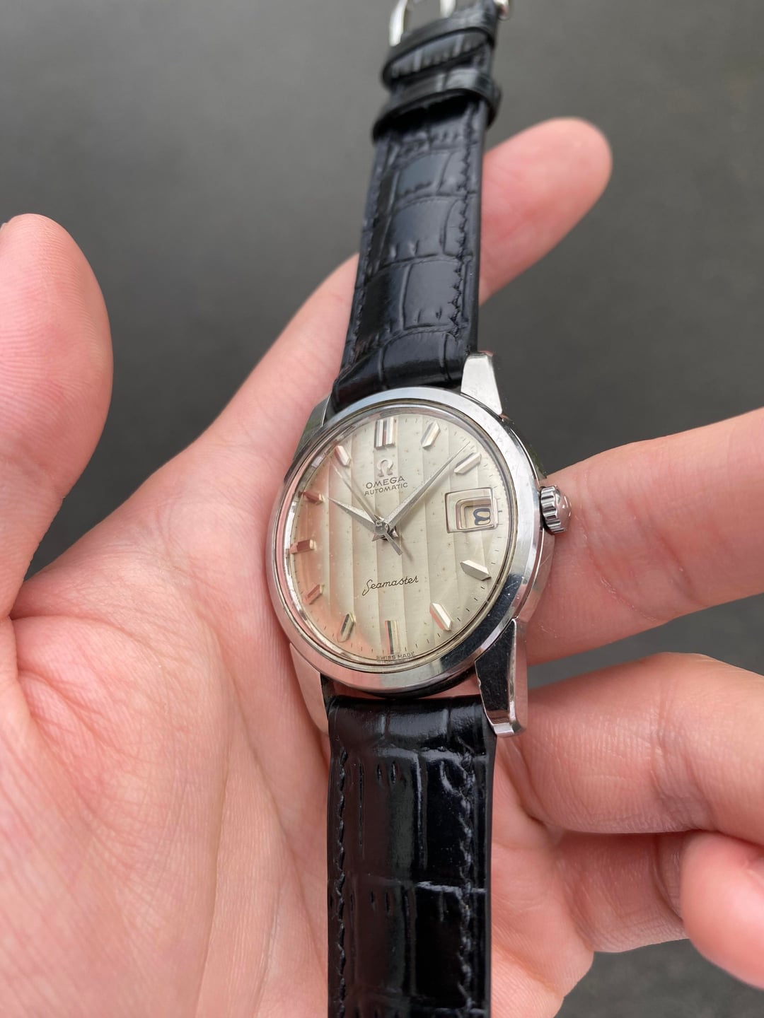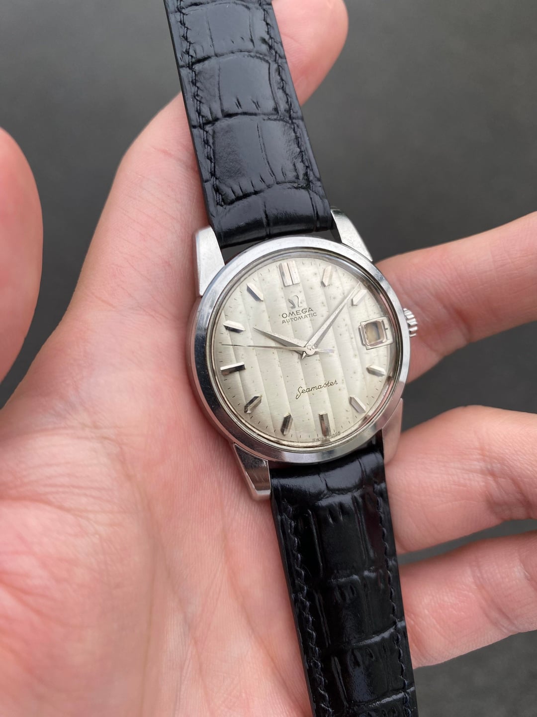 Hi everyone, here’s a timepiece you don’t see everyday: a “ribbon” or “tapestry” dial (some would call it) Seamaster decorated with elongated hexagon hour markers. Probably one of the more interesting Seamasters out there, it bears the reference 14762, and is powered by the robust caliber 562 automatic movement. The highlight of this piece is definitely the vertically-striped ‘curtain’ design with a reflective surface treatment which has an almost 3D-like effect with the way it gives visual depth at different angles. These dials were special orders back in the day; offered to customers who wanted something a little different, and are unsurprisingly found in much smaller surviving examples. The 8 gemstone-style applied hour markers decorate the edges of the dial in a visually mesmerising way. Some natural spot patina has developed evenly across the dial, probably due to the treatment of the surface, and shows the originality of it. The ‘Seamaster’ lettering script also bears the period-correct hangar style hook ’S’ (which was used from the 50s to the early 60s), and its chubby lugs and beefy case also makes it easy to wear—appearing larger than its humble 34.5mm dimension would suggest. The caliber 562 movement runs great, and was serviced earlier this year in February. The crystal glass and scalloped crown are both original and signed with an Omega logo. For this rare Seamaster, I’m looking for a negotiable $950 + shipping (usually $50) from Singapore via reliable Fedex to wherever you may be. I accept payment through Wise (preferred), Revolut, or bank wire. Please let me know if you have any questions. I'm happy to jump on a video call for the added assurance too. Thank you! David