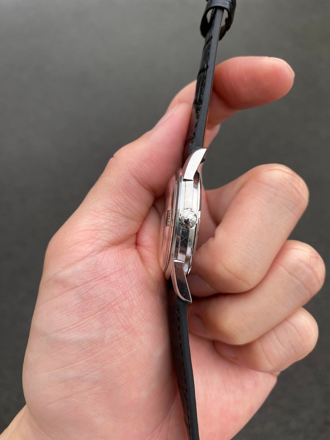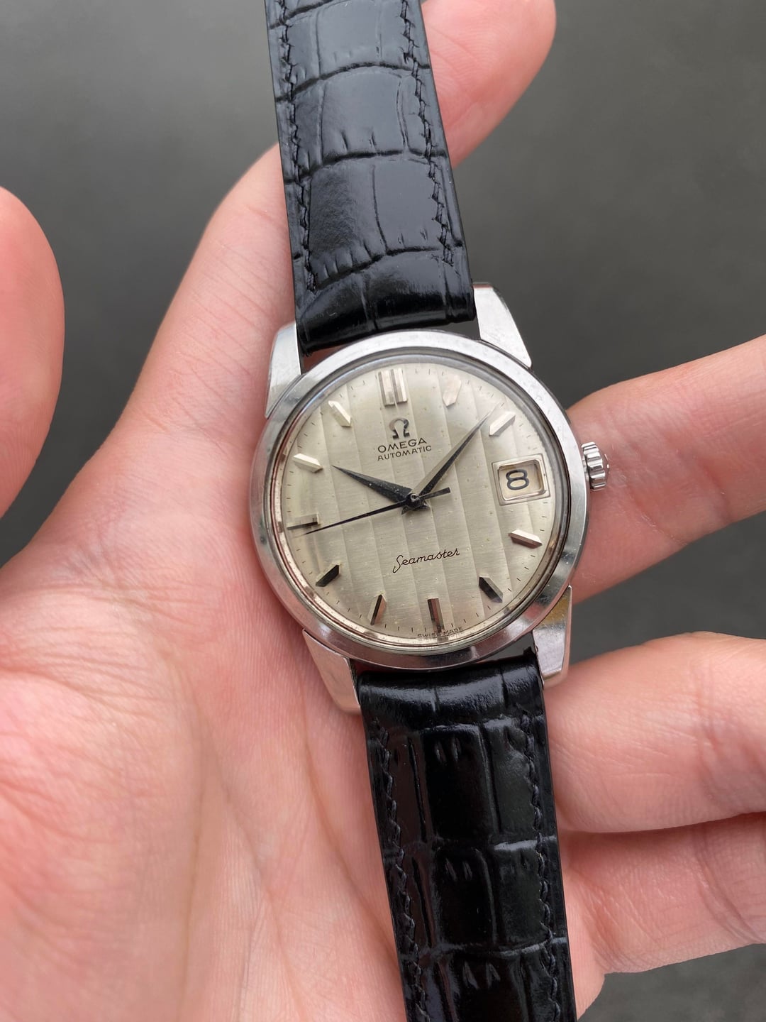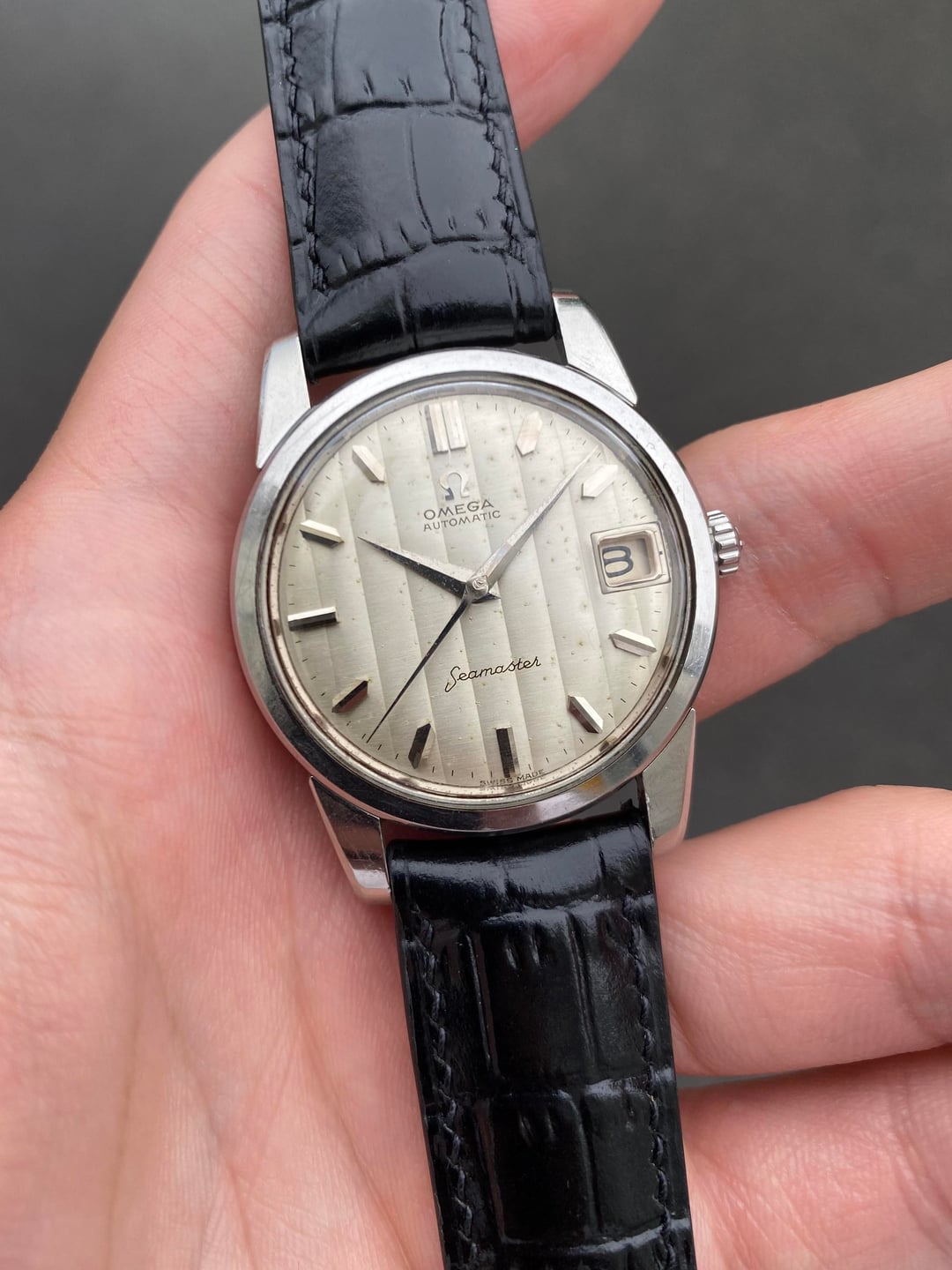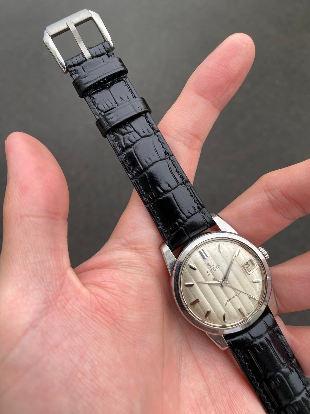 Hi everyone, here’s a timepiece you don’t see everyday: a “ribbon” or “tapestry” dial (some would call it) Seamaster decorated with elongated hexagon hour markers. Probably one of the more interesting Seamasters out there, it bears the reference 14762, and is powered by the robust caliber 562 automatic movement. The highlight of this piece is definitely the vertically-striped ‘curtain’ design with a reflective surface treatment which has an almost 3D-like effect with the way it gives visual depth at different angles. These dials were special orders back in the day; offered to customers who wanted something a little different, and are unsurprisingly found in much smaller surviving examples. The 8 gemstone-style applied hour markers decorate the edges of the dial in a visually mesmerising way. Some natural spot patina has developed evenly across the dial, probably due to the treatment of the surface, and shows the originality of it. The ‘Seamaster’ lettering script also bears the period-correct hangar style hook ’S’ (which was used from the 50s to the early 60s), and its chubby lugs and beefy case also makes it easy to wear—appearing larger than its humble 34.5mm dimension would suggest. The caliber 562 movement runs great, and was serviced earlier this year in February. The crystal glass and scalloped crown are both original and signed with an Omega logo. For this rare Seamaster, I’m looking for a negotiable $950 + shipping (usually $50) from Singapore via reliable Fedex to wherever you may be. I accept payment through Wise (preferred), Revolut, or bank wire. Please let me know if you have any questions. I'm happy to jump on a video call for the added assurance too. Thank you! David