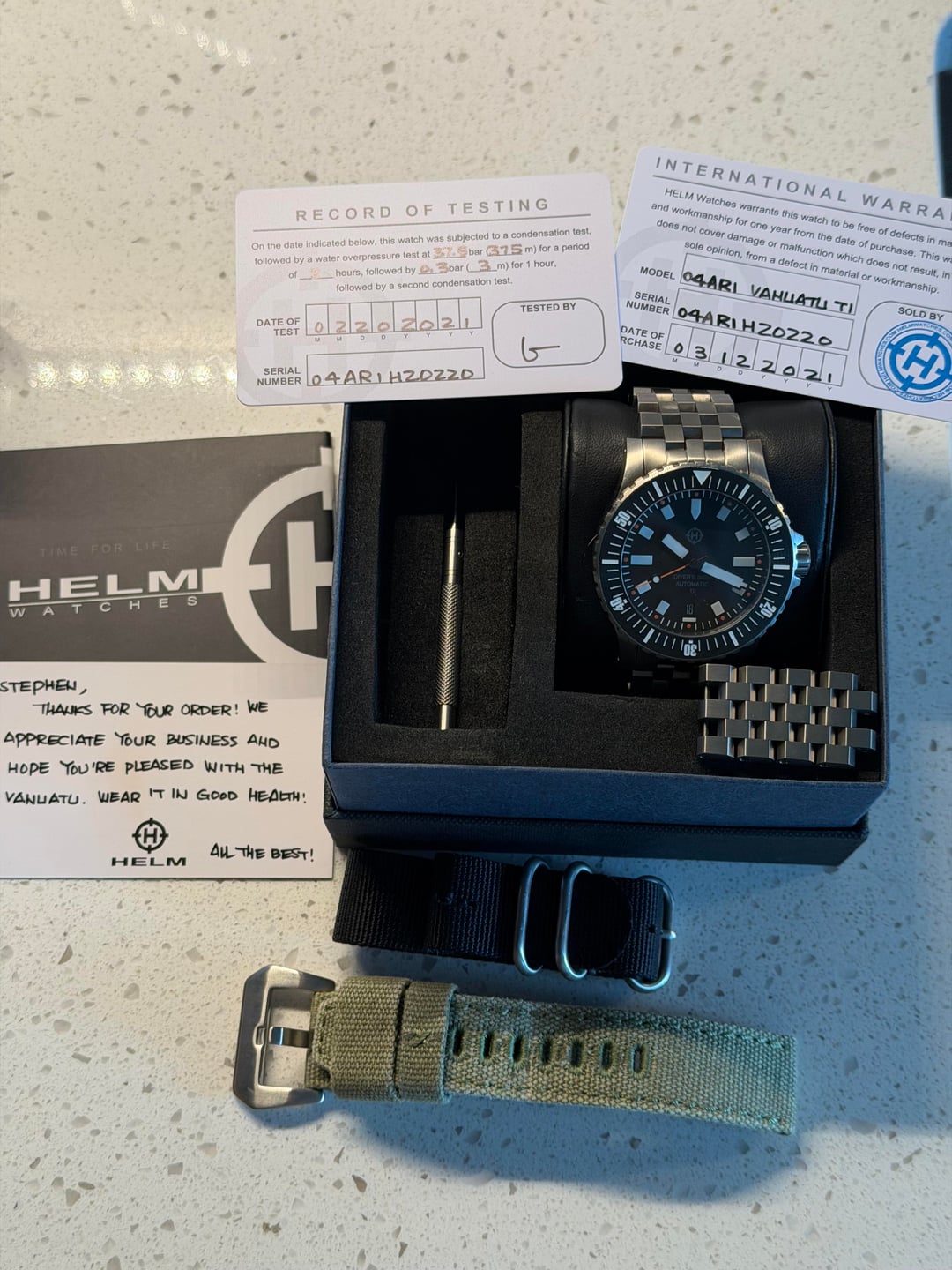 Helm Vanuatu Titanium Completely full set 2021. 42mm. **$299** / Zelle, Venmo, or WU accepted. Timestamp: https://imgur.com/a/hNlpyTH I have **tons** of references on multiple platforms including WatchExchange. We also are a 5-STAR rated business on Google!