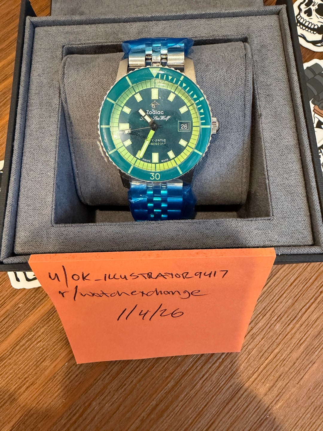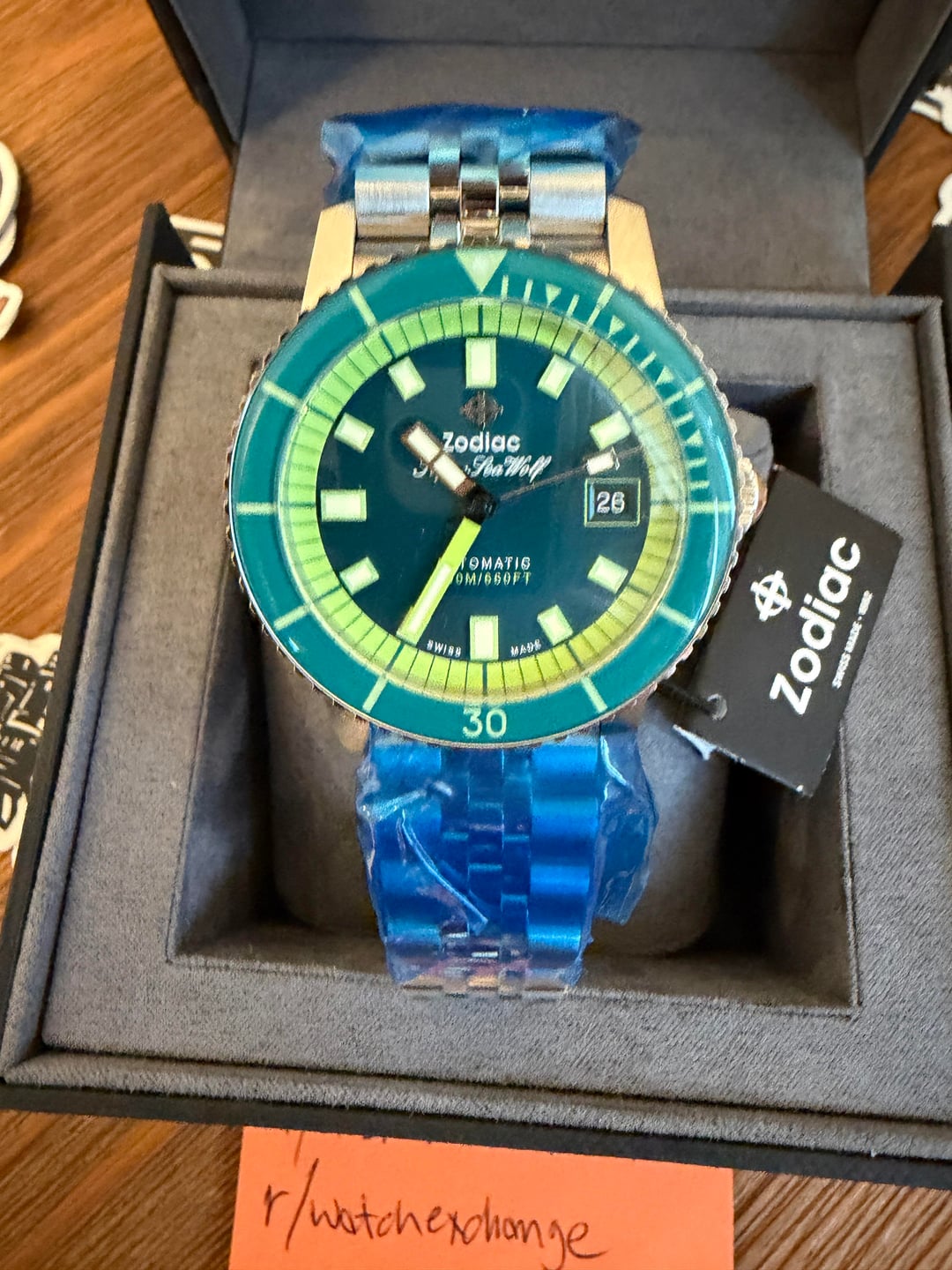 Want to sell, Catch and release on the Zodiac Super Seawolf. Bought from a seller on here but prefer a different color. Watch is still brand new with stickers on it and original box. $475 shipped and insured