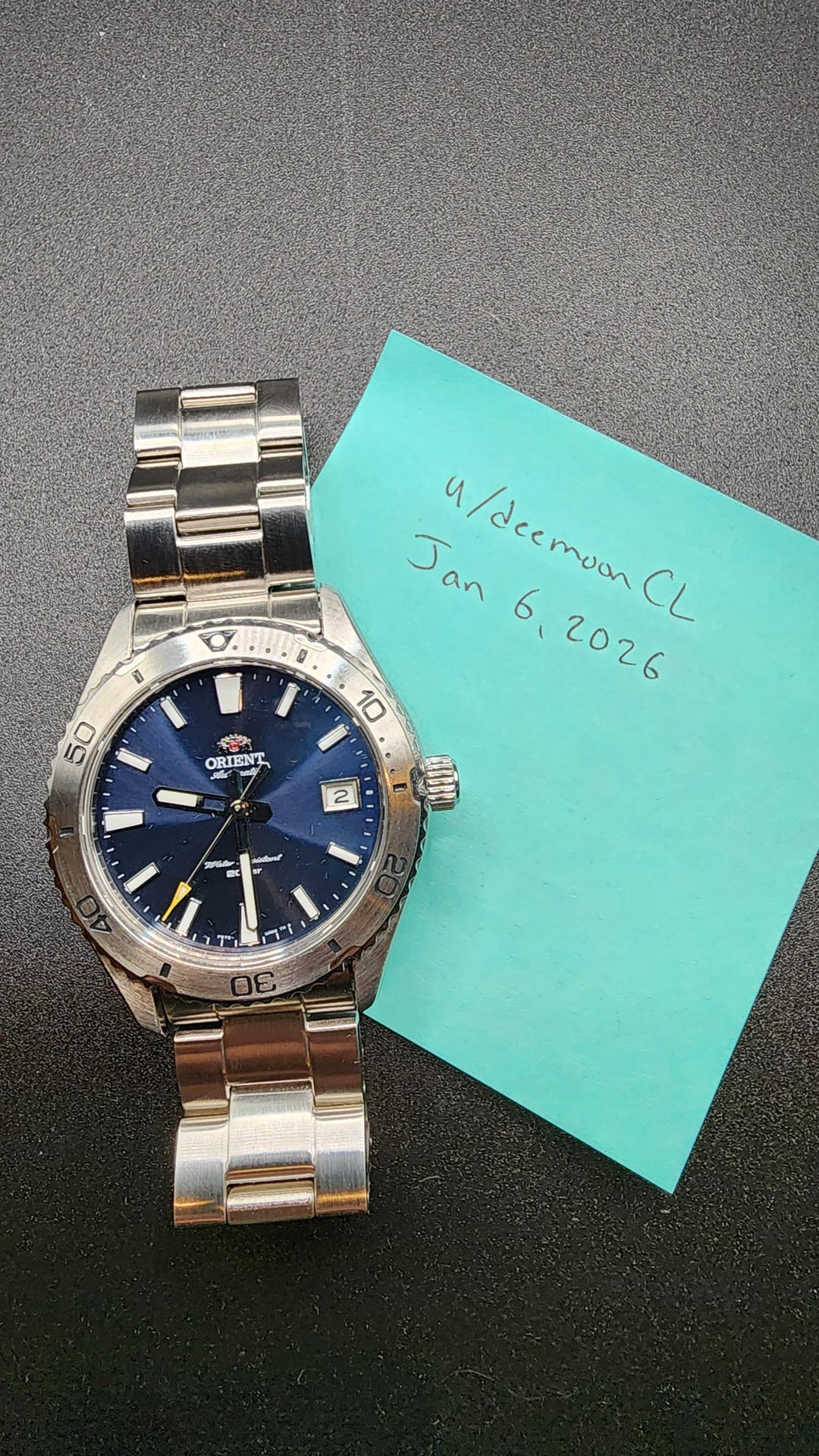 Selling my Orient Mako 40mm Blue Dial. Great dive watch, but I've been wearing my 62mas so this has just been sitting in my box lately. In used but good condition. No scratches on crystal, minor scuffs on the bezel, and minor scratches throughout case and bracelet. But as seen in the pictures, most are hard to see. Movement runs well and keeps time within specs. One thing to note is that the bezel is slightly misaligned by half a millimeter. You can see it in the picture with the timestamp: it's half a click to the left. Asking $200 shipped (or best offer) to CONUS via Zelle, PayPal F&F or Venmo. $206 shipped if using Paypal G&S. Feel free to ask any questions.