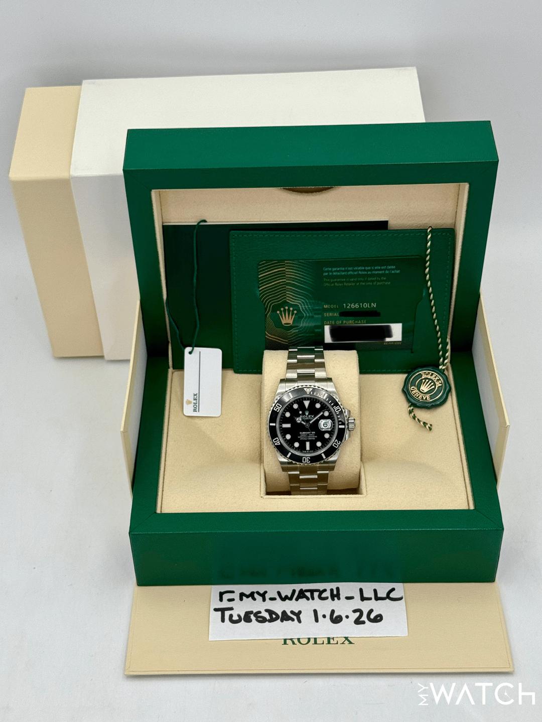 🔵**2022 Rolex Submariner Date 41mm 126610LN Stainless Steel Black Dial Oyster Bracelet with Glidelock and Black Ceramic Bezel** 🔵**TRADE or SELL us your luxury watch, all brands considered. Message me details.** **Includes the following:** **✔️Original Rolex Double Boxed** **✔️Box and Papers - Yes** **✔️Warranty card dated July 2022** **✔️5 year manufacturer warranty** **✔️Manual and Warranty booklets** **✔️Green and White Hang Tags included** **✔️Material: Oystersteel** **✔️Size: 8.25inch wrist (Full Links)** **✔️Watch is in excellent overall condition. Please see photos for details.** **✔️**[**Trades**](https://mywatchllc.com/pages/sell-rolex-watch) **welcome** Business Name: **My Watch LLC** LOCATION: Oak Park, Michigan ✔️[MyWatchLLC.com](http://mywatchllc.com/) for current inventory ✔️Google Business Listing [https://g.co/kgs/Cmd6FPW](https://g.co/kgs/Cmd6FPW) ✔️Business Hours M-F 9-6 ✔️Facetime/Video chat/calls welcome to view the watch interested. ✔️Contact: 248-422-0909 via text or call for quickest response. 🟢TERMS: Visit [MyWatchLLC.Com](http://mywatchllc.com/) for payments accepted 🟢REFERENCES/REVIEWS: We are well reviewed on all platforms from google, trust pilot, rolexforums, additionally we have 300+ reference in multiple FaceBook watch groups, reference checks welcome. 🟢SHIPPING: If you are not local, we offer Fully Insured FedEx overnight shipping in the USA for a fee. International shipping available. [https://mywatchllc.com/products/2022-rolex-submariner-41mm-126610ln-stainless-steel-black-dial-2](https://mywatchllc.com/products/2022-rolex-submariner-41mm-126610ln-stainless-steel-black-dial-2)