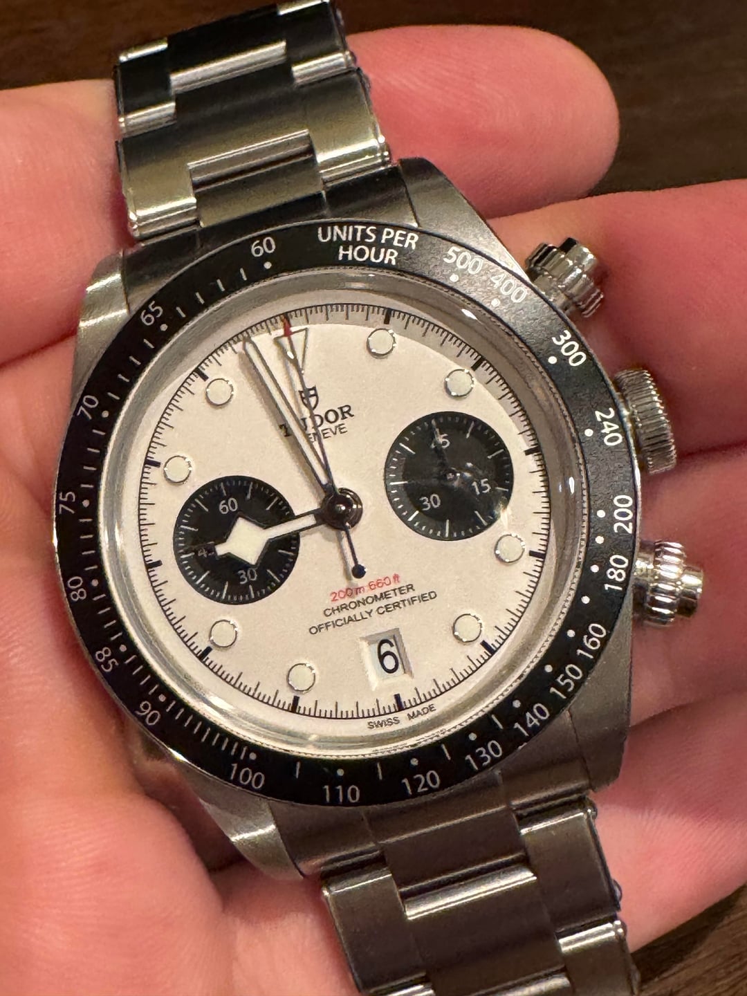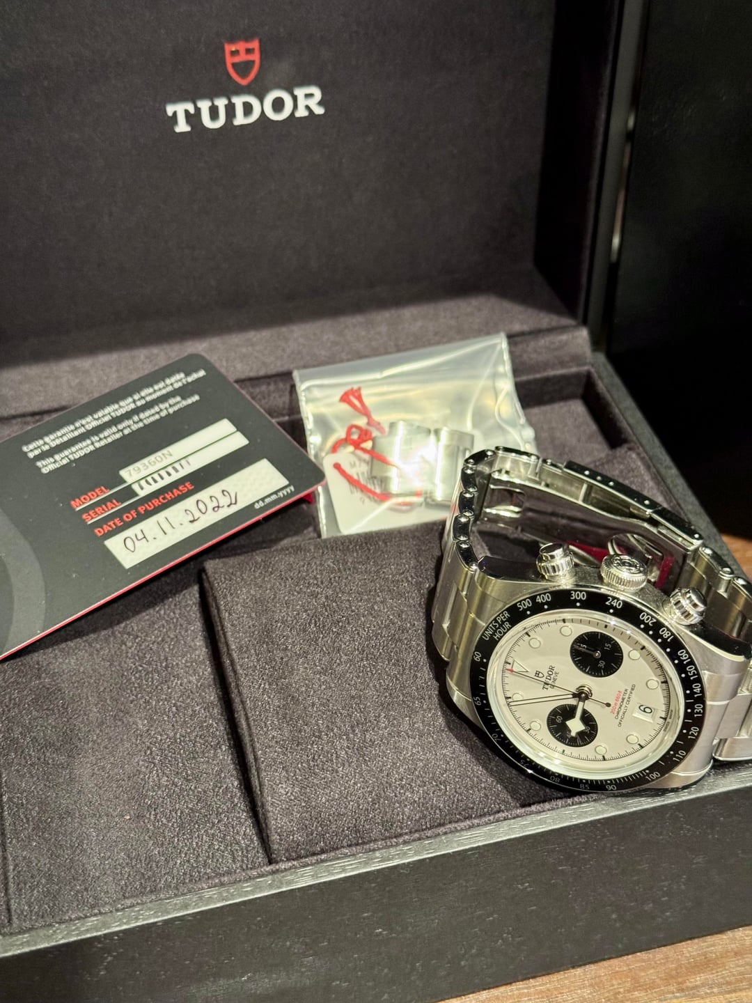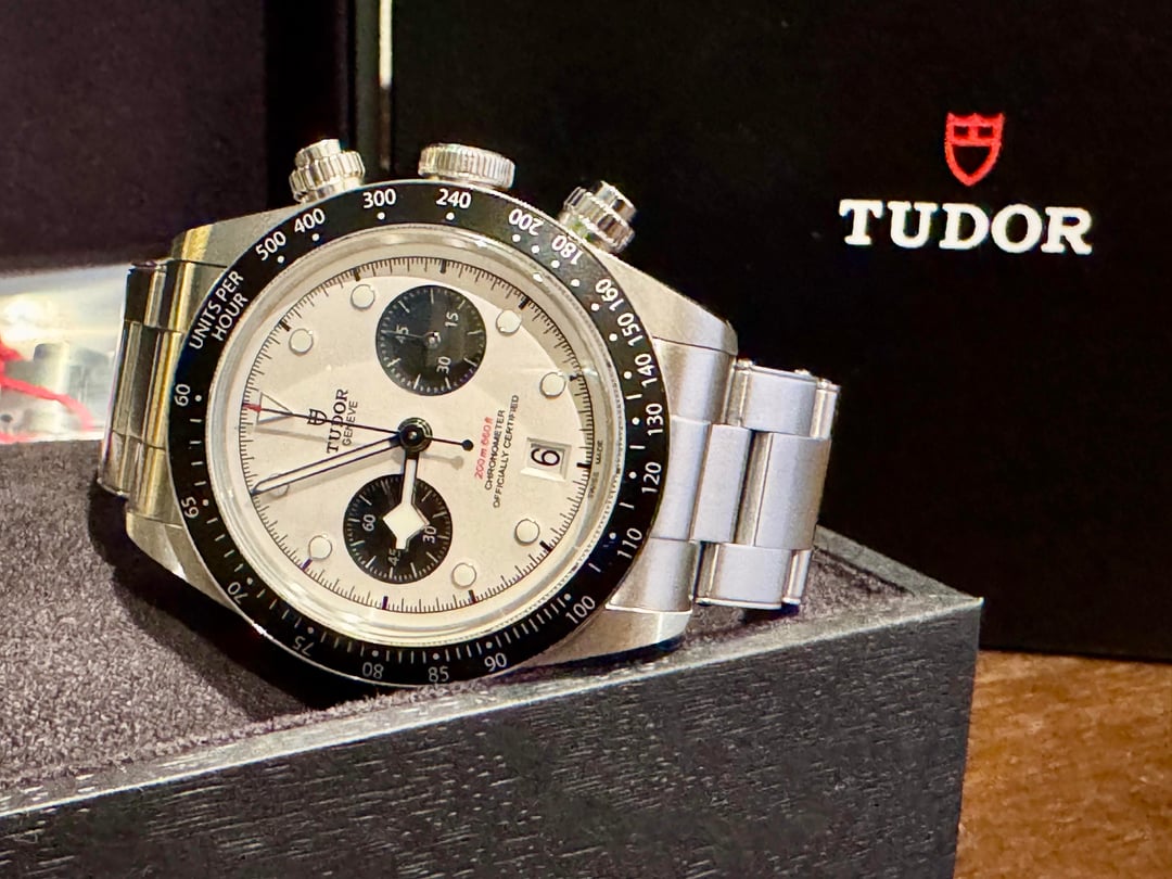 Tudor Black Bay Chrono “Panda” Ref. 79360N-0002 Year: 2022 Condition: Worn, but in excellent condition with only a few minor scuffs to the bracelet and scratches near the lugs from strap changes. Set: Full set – inner/outer boxes, warranty card, hangtag, extra links Price: $3300 + shipping (US buyers only) The Tudor Black Bay Chrono ref. 79360N-0002 blends the tool-watch DNA of the Black Bay line with the classic racing chronograph layout. The 41 mm stainless-steel case features a polished and satin finish, a black fixed tachymeter bezel, and the clean panda-style dial — matte white with contrasting black subdials — giving it that unmistakable vintage motorsport aesthetic. Inside beats Tudor’s in-house Caliber MT5813, a COSC-certified chronometer based on the Breitling B01 architecture, offering column-wheel actuation, vertical clutch, and a robust 70-hour power reserve. Water-resistant to 200m, it’s as rugged as it is refined. This particular piece is in excellent condition with only minor notable wear, crisp case edges, and a tight bracelet. The chronograph pushers operate perfectly, and timekeeping is excellent. Still under manufacturer warranty through April 2027.
