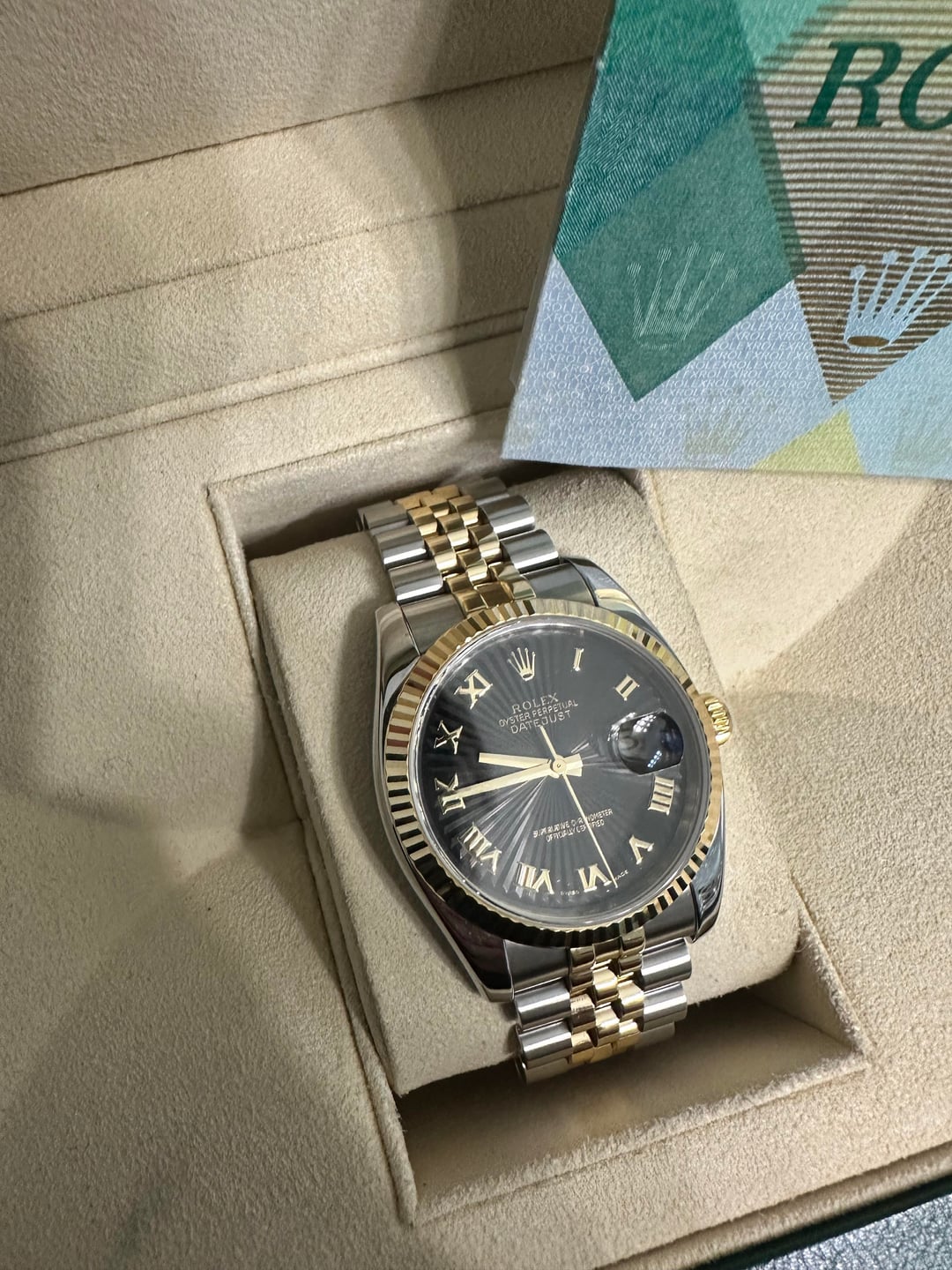 | Rolex Datejust 36mm 2-Tone Yellow Gold/Steel Black Index Oyster Watch 116233 elegantswiss (1168) |
