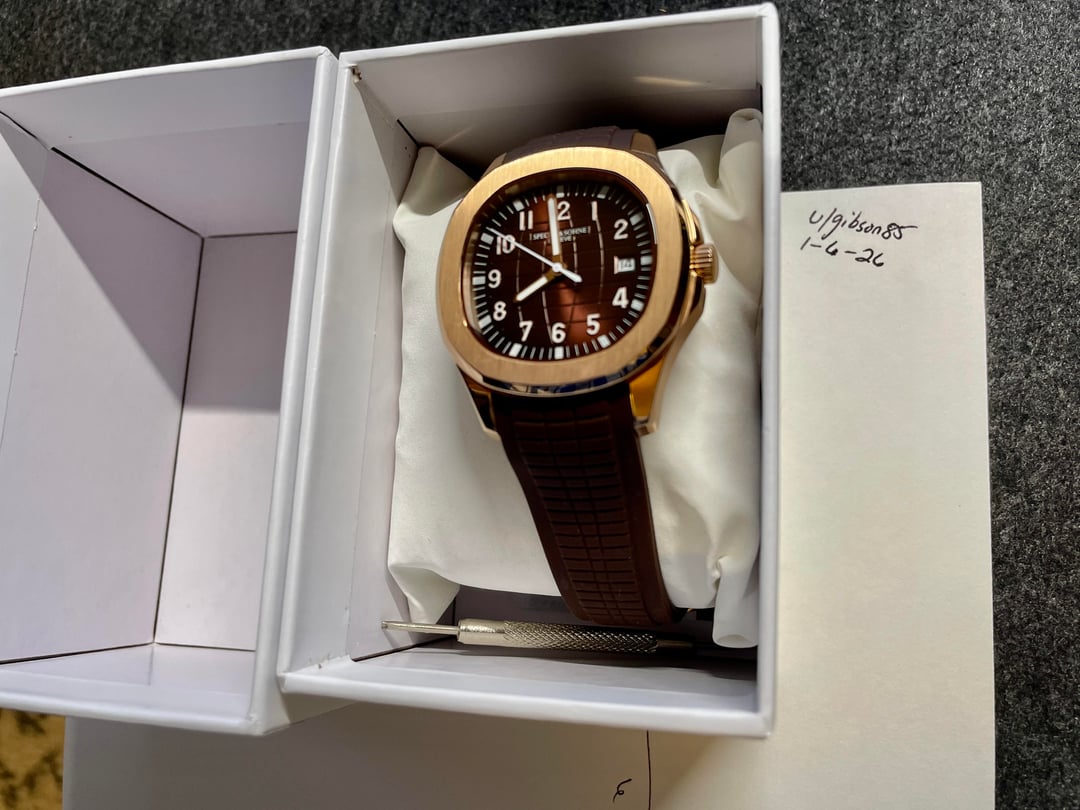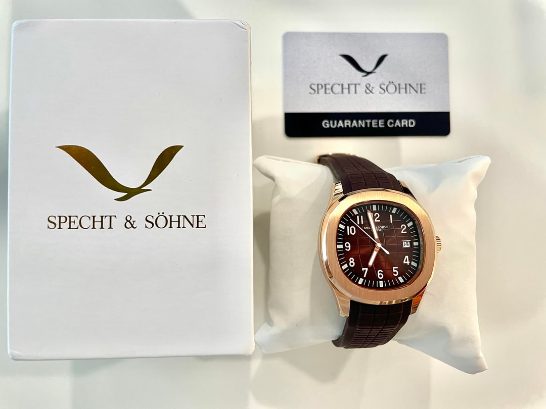 **Specht & Söhne Aquanaut-style Homage** [Timestamp](https://imgur.com/a/4Cxas8S) Box and Papers Included * Case: Rose gold-tone stainless steel * Movement: Automatic * Crystal: Mineral * Crown: Screwdown * Date at 3 o’clock * Strap: Brown rubber / tropical-style strap (cut to \~6.25”) * Note: strap has been cut to fit approximately a 6.25” wrist. So plan on replacing the strap if your wrist is larger than this. * Condition: Mint / like new * Payment: PayPal F&F preferred (G&S ok if buyer covers fees) * **Shipping:** CONUS only **$79 shipped CONUS**