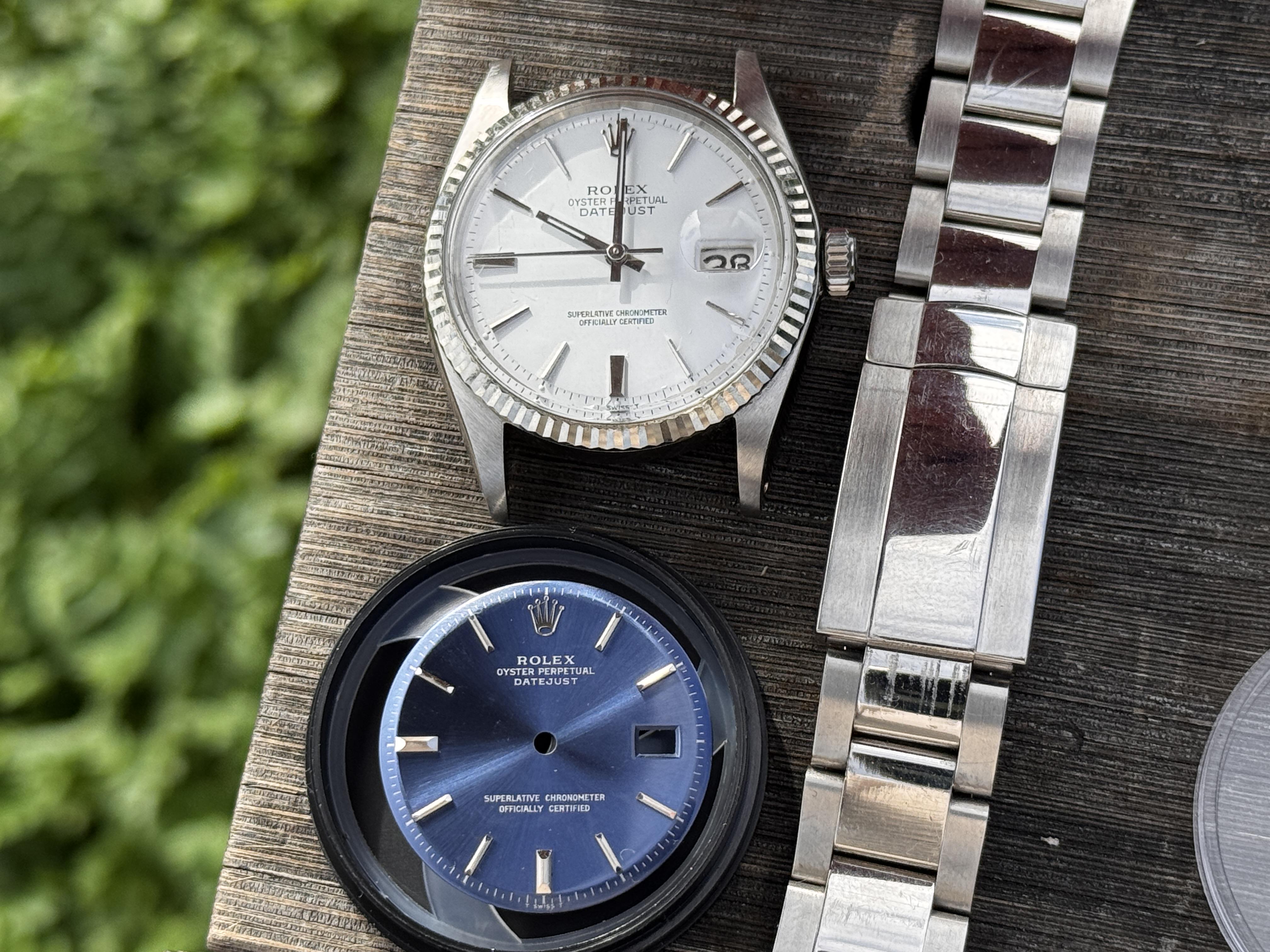 Listing my beautiful 1970s DateJust 1601 for sale today, with a potentially pending sale. Watch case and movement is in beautiful condition for its age, and it comes with an authentication card from PureWatches (purchased in 2024 by previous seller). The dial on it is an aftermarket white dial with a little bit of chipping on the bottom right, and I purchased an $800 worth blue pie-pan dial for it that I intended to install. Watch keeps nice time face-up on a desk and has been for several times that I have checked. I just don't use the watch either and lost interest in replacing with blue dial and wearing. Selling off this and a few others. Whoever wants to purchase can do so with the blue dial and have a watchmaker install it. Alternatively, I can have a local watchmaker install it and sell it for what it's worth. Asking $3,600 shipped, with everything that's seen in the pictures. Thanks for looking and considering. More pictures: [https://imgur.com/a/rolex-1601-datejust-tXBHOst](https://imgur.com/a/rolex-1601-datejust-tXBHOst) Timestamp: [https://imgur.com/vvBpnuE](https://imgur.com/vvBpnuE)