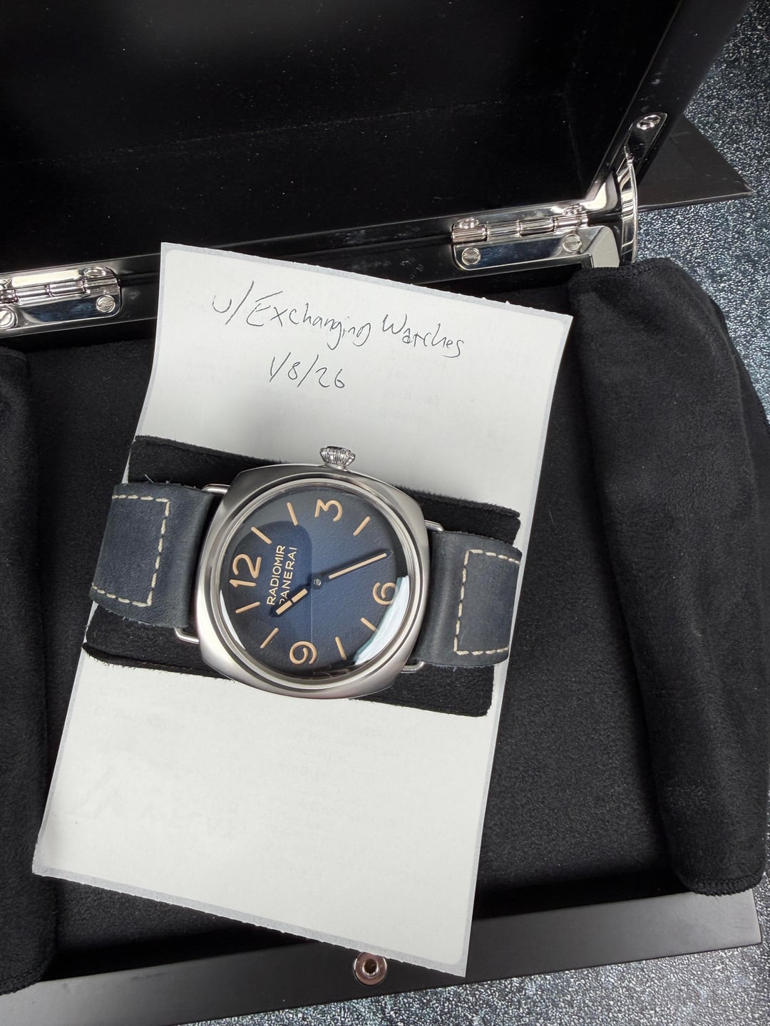 Panerai Radiomir Tre Giorni PAM01335 is a striking expression of Panerai’s heritage-driven Radiomir design, blending vintage military cues with a little bit of a dress focused design. Housed in a robust 45 mm stainless steel case with a smooth bezel and paired with a rich blue leather strap, this manual-wind timepiece features a deep blue degradé dial with luminous Arabic numerals and indexes for exceptional legibility. This example is in very good condition with PamGuard (my bad on title) warranty to 2030. I am a full time firefighter and have been in the watch industry for a few years after turning something I love into a small side venture. Working with high horology timepieces has been a joy and I’m very thankful for everyone who I have worked with. I recognize that reputation goes a very long way here and I have earned mine with honest straightforward transactions. Reach out an any time for questions or a FaceTime. 4,850 with insured shipping included