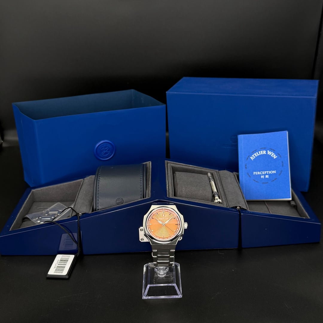 Available is the Atelier Wen Perception Salmon Dial Asking $2950 + shipping (add $75 for my label) Local Orlando This piece sold out in a hurry and it’s no surprise why. Each on of these intricate guilloche dials takes 8 hours to produce and in my opinion it is time well spent The 40mm case contours around the wrist perfectly at only 9.4mm thick and is incredibly comfortable on the integrated bracelet. [Video](https://imgur.com/a/q4EXhmL) [Timestamp](https://imgur.com/a/DuufdWV) [Instagram](https://www.instagram.com/jamesthewatchguy?igsh=a2pxZG16bzhmdHU5&utm_source=qr) Contents: Double Boxed - really cool unfolding mechanism 2024 dated papers Travel case Tool Cleaning cloth Full links Condition: Excellent condition Clean crystal Running well on timegrapher Buyer perks and protections: Open to trades 3rd party escrow and authentication available 12 month trade ins and buy backs Timegrapher testing to make sure your watch is working correctly and not in need of a service Overnight insured shipping anywhere in continental US I’m quick to respond and easy to get a hold of -James The Watch Guy jamesthewatchguy.com