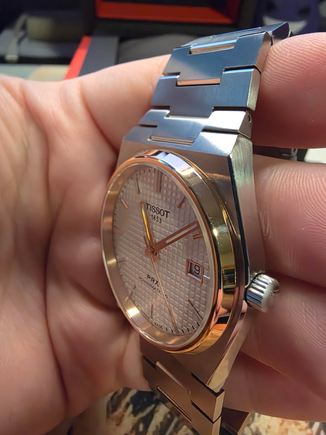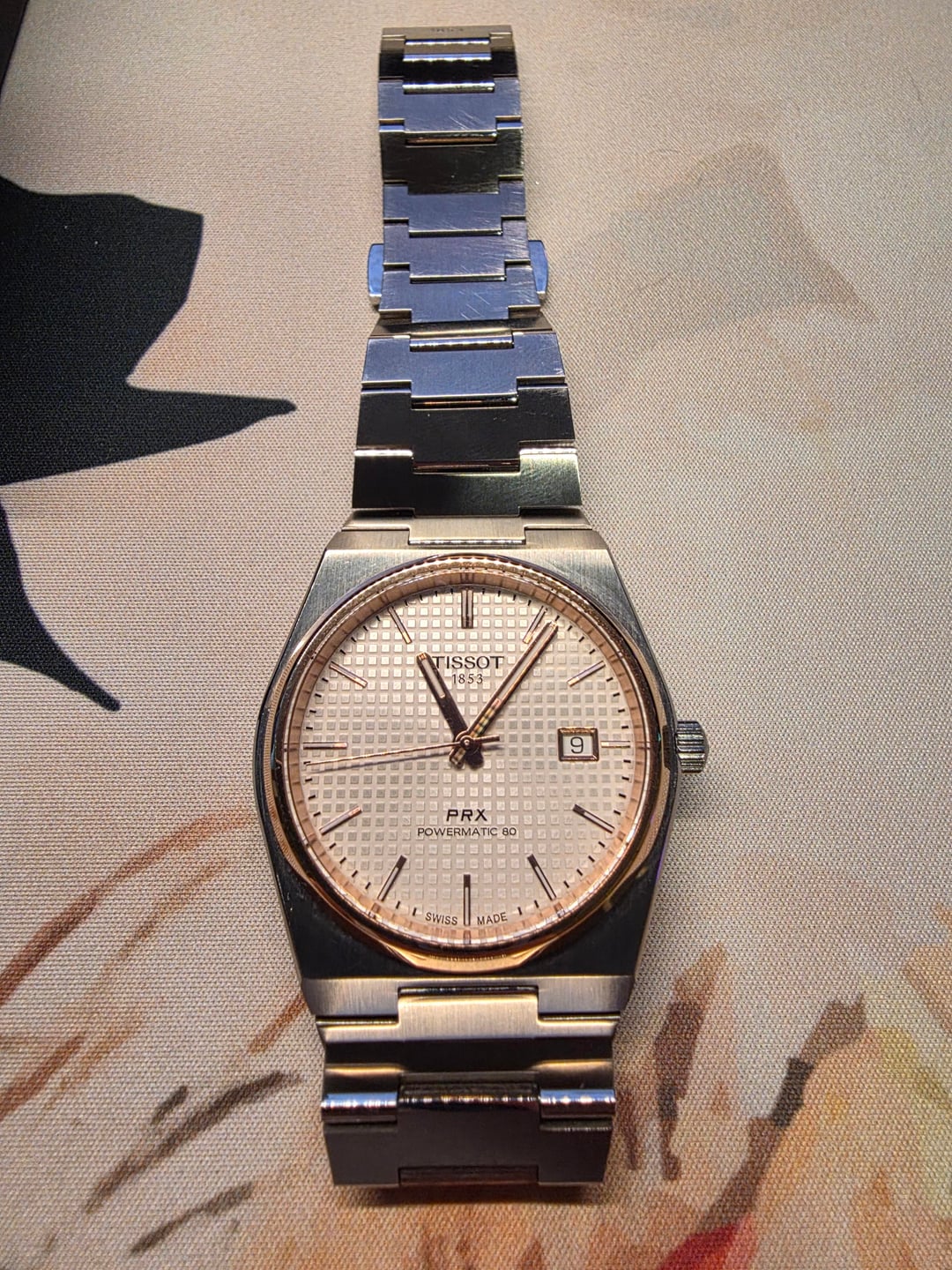 Hey all, for sale I have from my personal collection a Tissot PRX Powermatic 80 in the two-tone Silver / Rose Gold 40mm. Will come included with box, booklet and tag + extra links. Shows signs of wear on the case and bracelet consistent with regular use. The dial and crystal are clean, and the watch runs as it should. Model: Tissot PRX Powermatic 80 Case size: 40mm Dial: Two-tone Movement: Automatic (Powermatic 80) Crystal: Sapphire Water resistance: 100m Includes: Box, Booklet, Tag, Extra Links Condition: Wear marks on bracelet but otherwise is in great condition. No scratches or marks on crystal. Location: Davenport, FL Price: $550 Shipped Payment: Zelle or PayPal (+fee if G&S) Not accepting any trades. Willing to answer questions, or provide raw photos upon request.