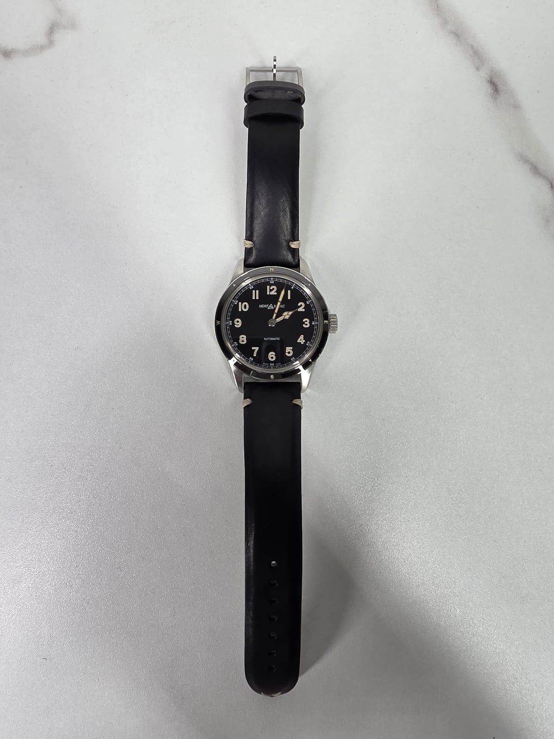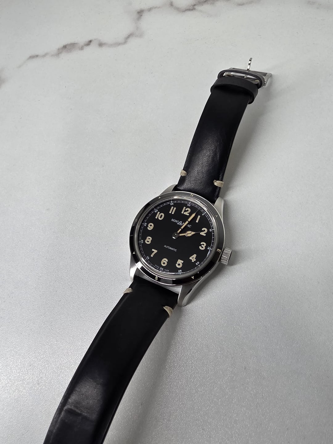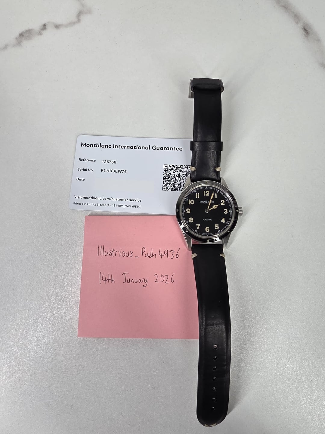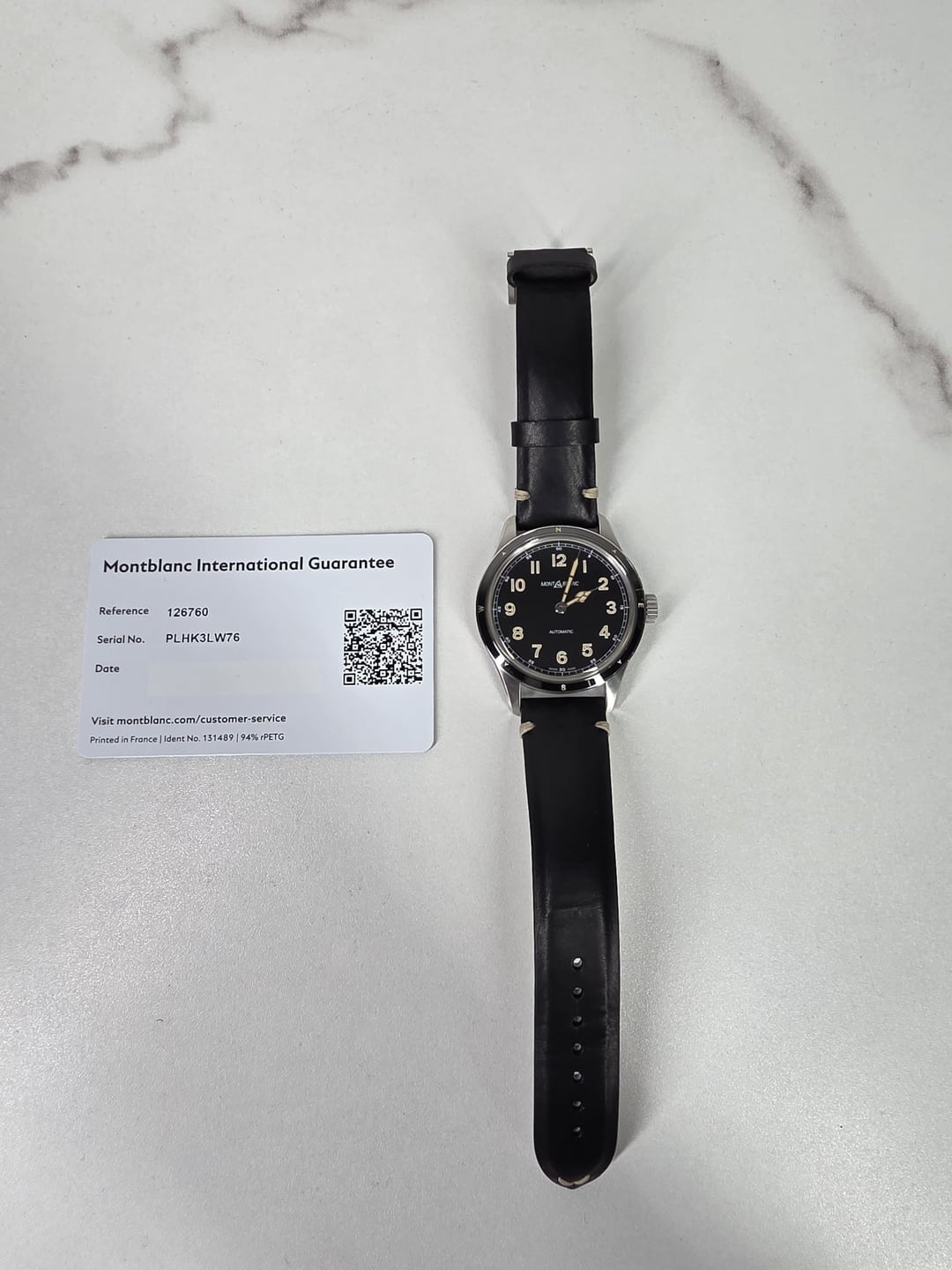 Montblanc Automatic 1858 40mm black leather watch ref 126760 Includes: Box, Manual, Guarantee Card (Unsigned), Montblanc Travel Pouch Case Specs: Case Material: Stainless Steel watch Features: sapphire Crystal Case Diameter: 40mm Case Water Resistance: 100m Watch Strap colour: Black Movement Type: Automatic Asking £1200 / $1700 CONUS DM’s are open to negotiations for price and shipping Located in London, UK