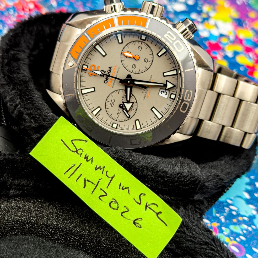 **\[WTS/WTT\] OMG Seamaster Planet Ocean 600M Chronograph GMT Titanium 45.5mm – Full Set** **Priced @ $7995.00 Shipped** Up for sale is an **OMG Seamaster Planet Ocean 600M Chronograph GMT** in **excellent condition**, reference **215.90.46.51.99.001**. This is a no-compromise professional dive watch built in **Grade 5 titanium**, offering serious capability with surprisingly comfortable wear for its size. This example comes as a **complete full set**, including **inner & outer boxes, travel box, card holder, and all three original cards**, and is fitted on its original **titanium bracelet**. **Why this one matters:** * Grade 5 titanium case & bracelet – lightweight, durable, corrosion-resistant * Cal. 9900 **METAS-certified Master Chronometer** (anti-magnetic to 15,000 gauss) * Chronograph + independently adjustable GMT – true travel diver * 600m / 2000ft water resistance with helium escape valve **Technical Details:** * Reference: 215.90.46.51.99.001 * Case Size: 45.5mm * Movement: Automatic OMG Cal. 9900 * Power Reserve: \~60 hours * Bezel: Ceramic w/ Liquidmetal numerals * Dial: Grey * Crystal: Sapphire (front & display caseback) * Bracelet: Titanium w/ fold-over clasp & diver extension * Functions: Chronograph, GMT, date, time **Condition:** Excellent **Included:** Inner box, outer box, travel box, card holder, all 3 cards 💰 **Price:** $7995.00 Shipped 🚚 **Shipping:** FedEx Priority Overnight, fully insured 💳 **Payment:** PayPal Goods & Services 📍 **Location:** FL Timestamped photos included. Happy to answer questions or provide additional photos/video.