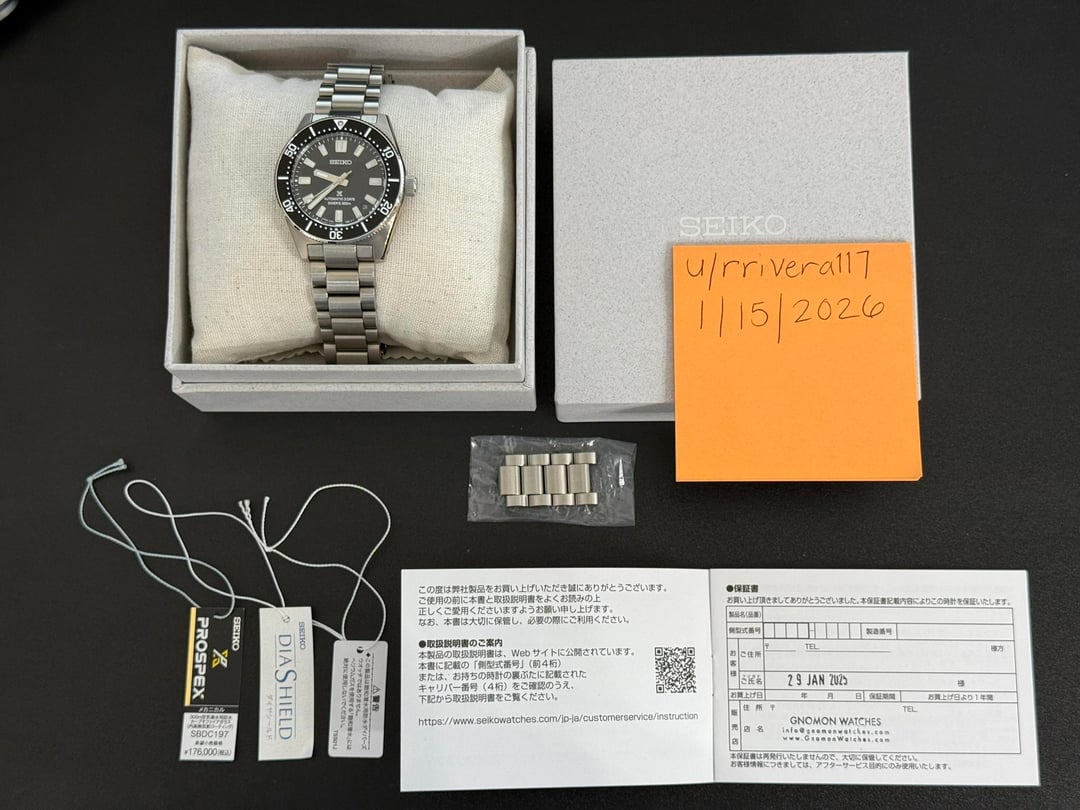 For sale is a Seiko Prospex 1965 Heritage Diver - SBDC197 (SPB453) **Case**: 40mm width, 46.4mm L to L, 13mm thick, 20mm lug width, 300m water resistant, sapphire crystal **Movement**: Caliber 6R55. Seiko Automatic, 3 day power reserve **Condition**: Overall the watch is in great condition as shown in the pictures, 9.5/10. This was purchased from Gnomon in January of 2025, and mostly has sat in a drawer since my BB58 gets most of the wrist time. This watch will come as a complete set with box, booklet, tags and full links. **Price**: $850 USD. Insured Ground shipping included through UPS within CONUS. PayPal FF, Zelle or Venmo only. **Contact:** Happy to video call or text to discuss watch or any additional questions. \*\*\* I don't have much feedback here but please look me up at eBay under user: rrivera1107. I have plenty of transactions with 100% seller rating.