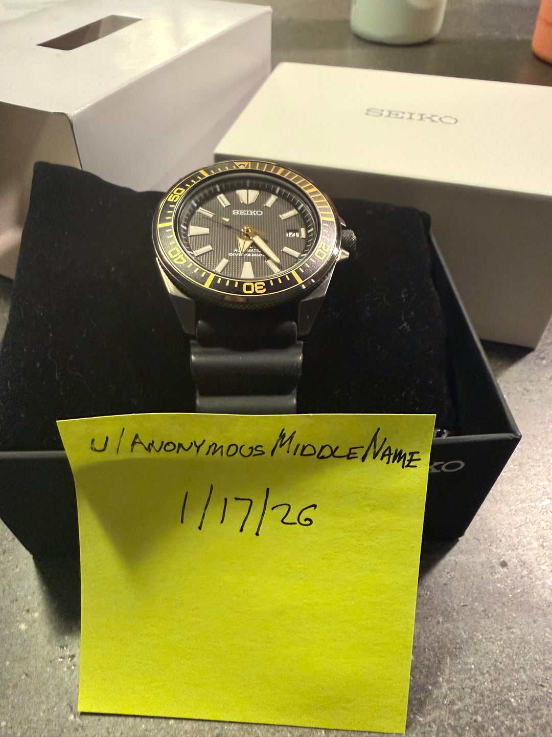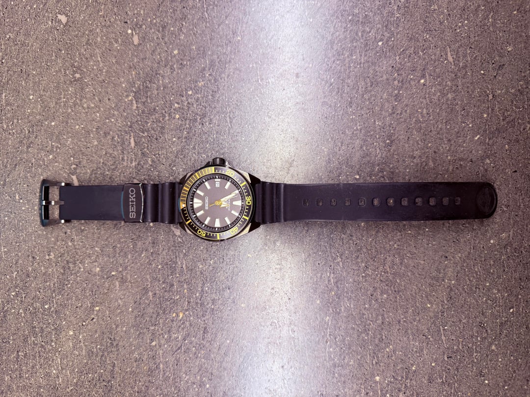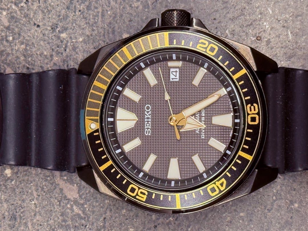Hello, r/WatchExchange. This is a Seiko SRPB55 “Gilded Samurai” in Black and Gold. Asking $300 plus whatever shipping you select. It has the box and papers I received it with, but I am not the original owner and can’t speak to its true provenance. The watch itself is in excellent condition, although there is some wear on the tip of the band itself. It’s a dead-solid diver that wears well smaller than its actual proportions (I have a 6.5/6.75-inch wrist, and it and other Samurais I have worn all fit beautifully). A review, if you are so inclined: https://www.watchcrunch.com/Lugsandlumeblog/reviews/seiko-srpb55-review-427 Specs (from Long Island Watch, since the model is discontinued): * Movement:Seiko 23-Jewel Automatic 4R35 (self-winding and hand winds) * Case:Gun Metal Ion Plated, 43.8mm diameter x 13.5mm thick. 48mm tip to tip. * Back:Engraved screw-in back * Crystal:Hardlex mineral * Band:Seiko black rubber dive strap. 22mm lug * Water Resistant:200 meters * Discontinued:Yes