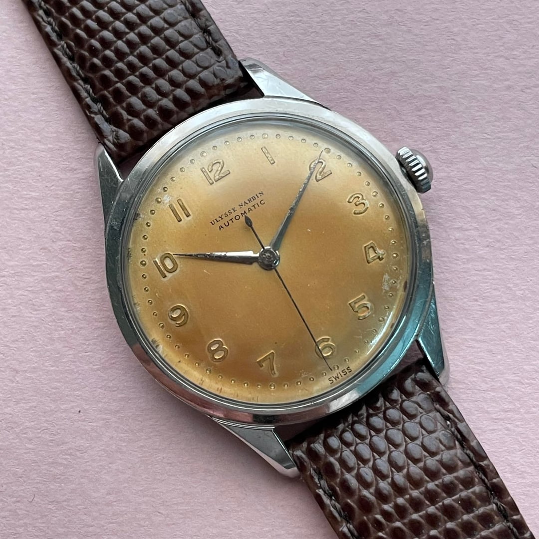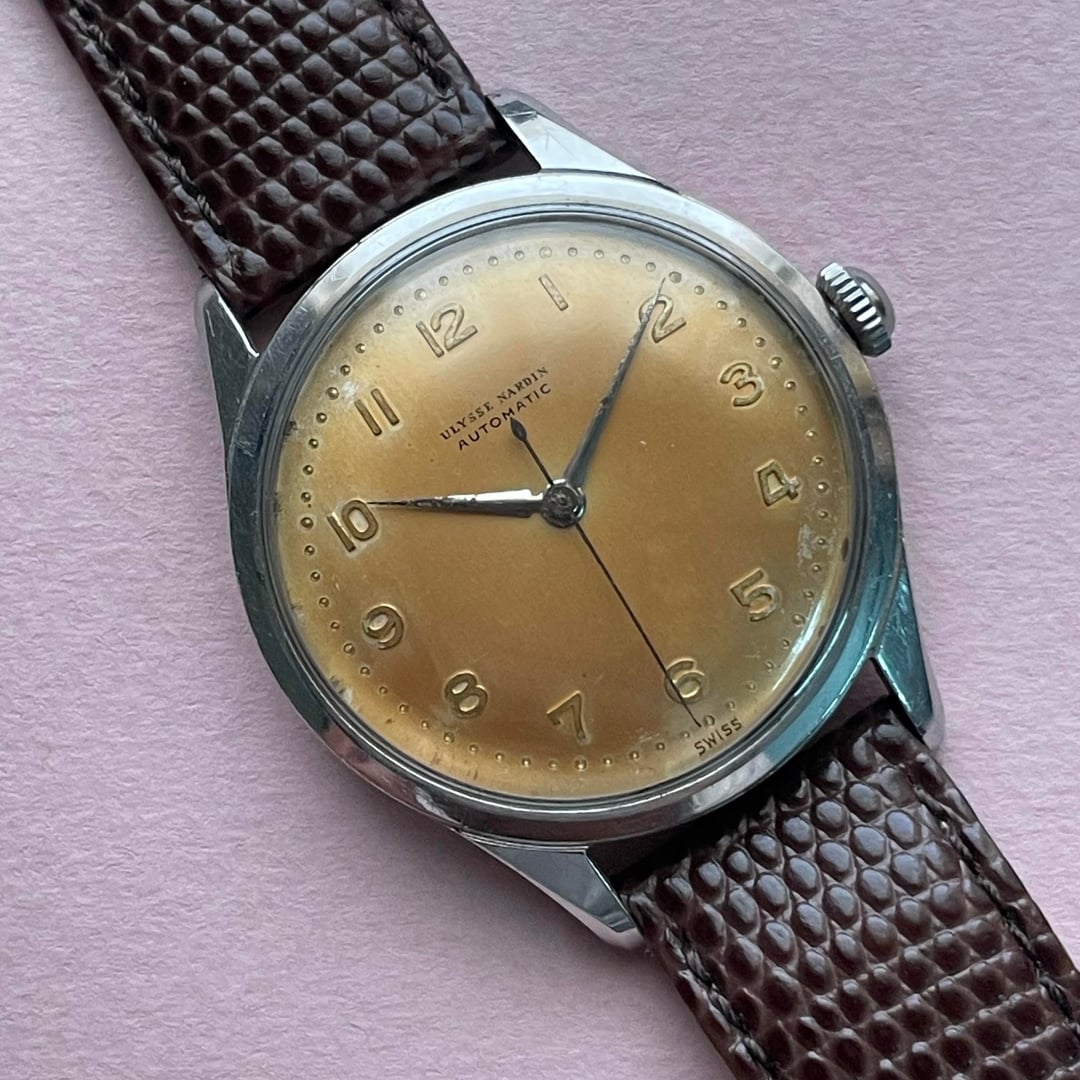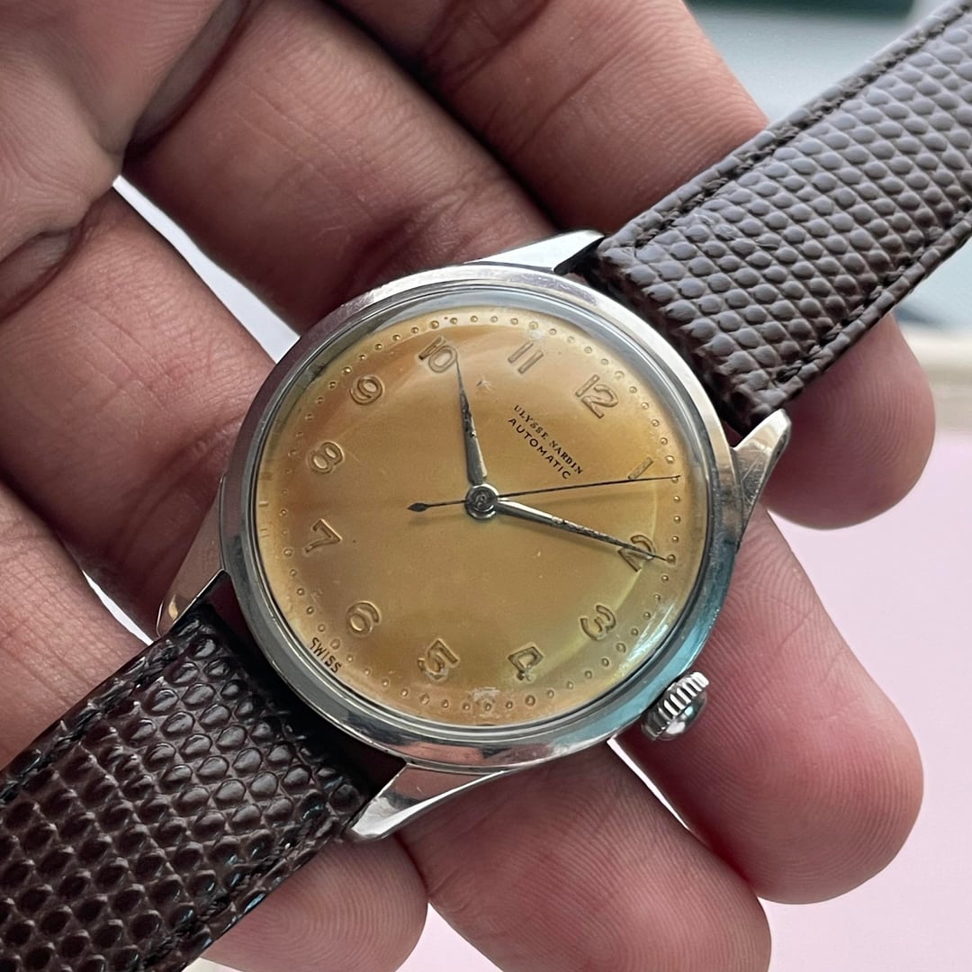 Up for sale is a vintage Ulysse Nardin powered by an automatic movement, housed in an approximately 36mm case and showcasing a beautifully aged patina dial that perfectly reflects its era. The watch is running well and keeping good time. Its condition is consistent with its vintage age, displaying definite signs of wear visible in the photos. It comes fitted with an aftermarket strap and buckle. 💲 Asking $575 – includes FedEx tracked shipping 💳 Payment via Zelle, Wise, or wire transfer 📌 Please note: The watch is shipped from Asia and will be shipped within 2–3 days of payment.