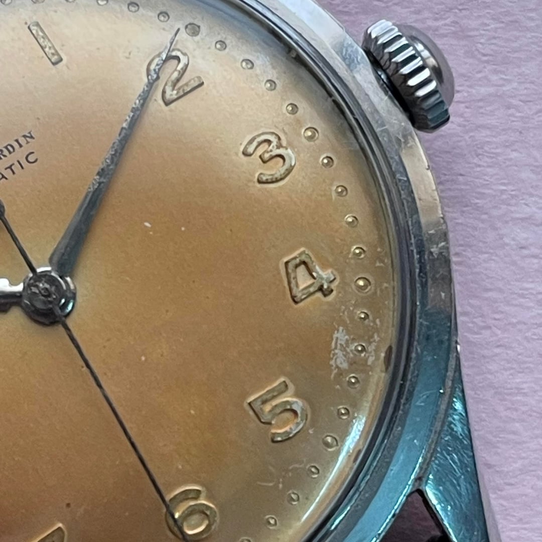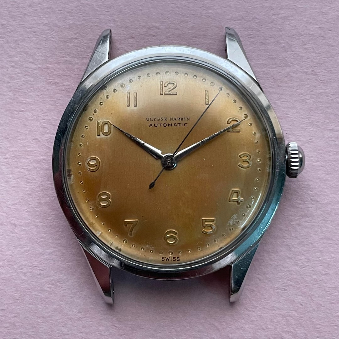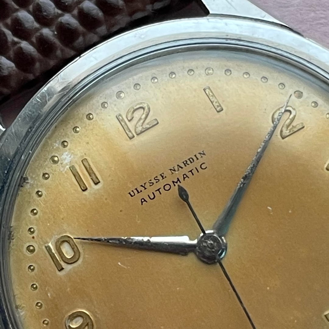 Up for sale is a vintage Ulysse Nardin powered by an automatic movement, housed in an approximately 36mm case and showcasing a beautifully aged patina dial that perfectly reflects its era. The watch is running well and keeping good time. Its condition is consistent with its vintage age, displaying definite signs of wear visible in the photos. It comes fitted with an aftermarket strap and buckle. 💲 Asking $575 – includes FedEx tracked shipping 💳 Payment via Zelle, Wise, or wire transfer 📌 Please note: The watch is shipped from Asia and will be shipped within 2–3 days of payment.
